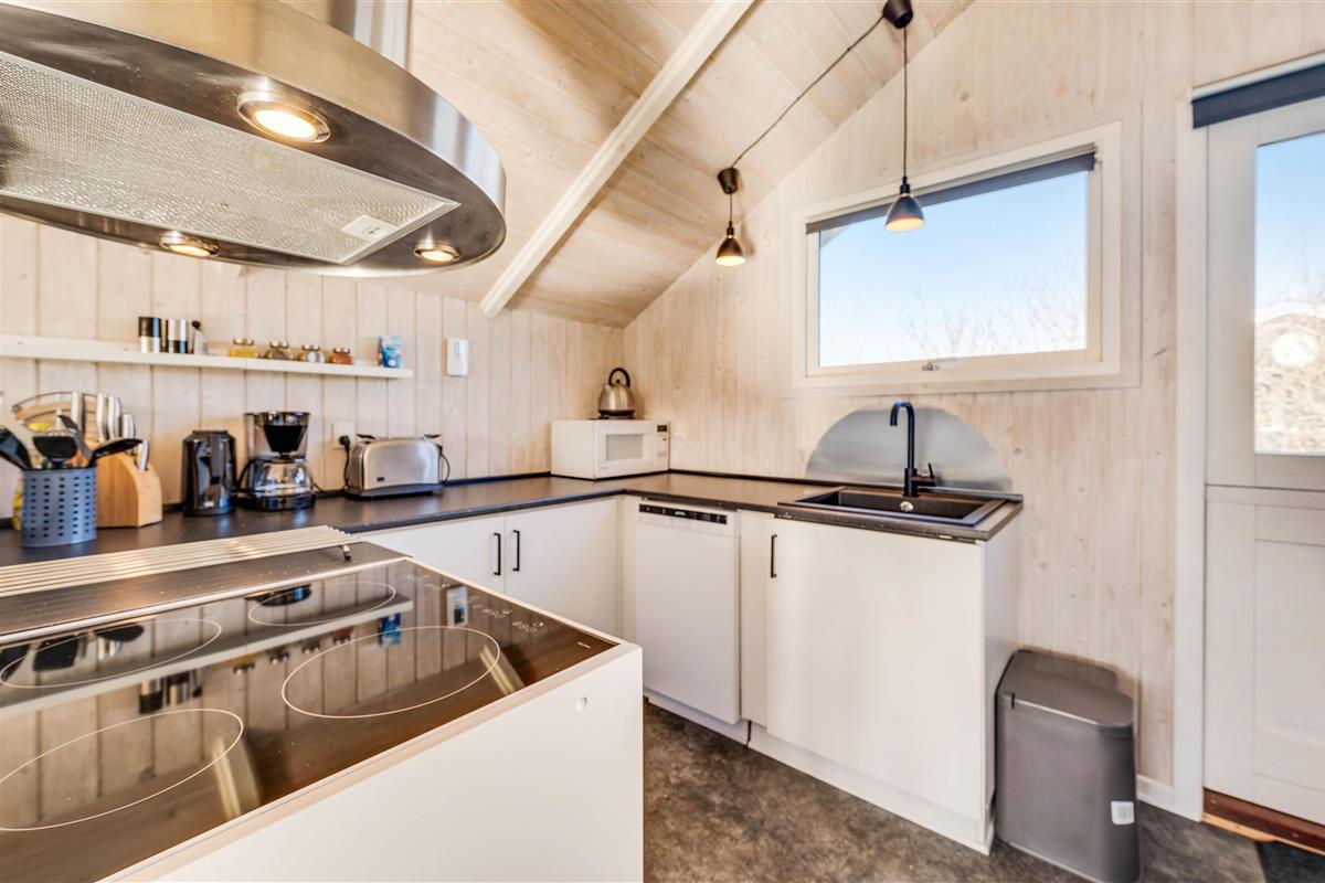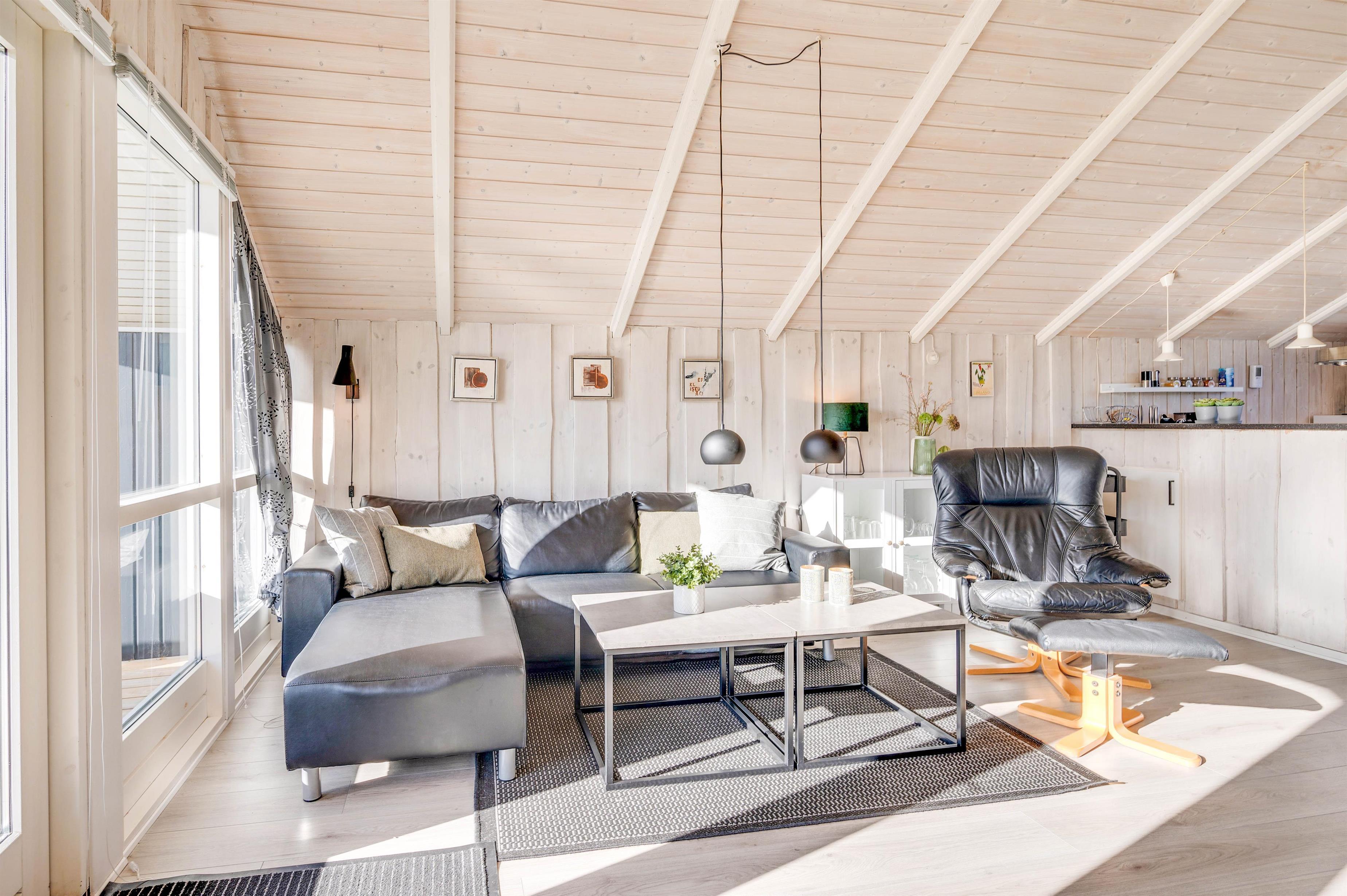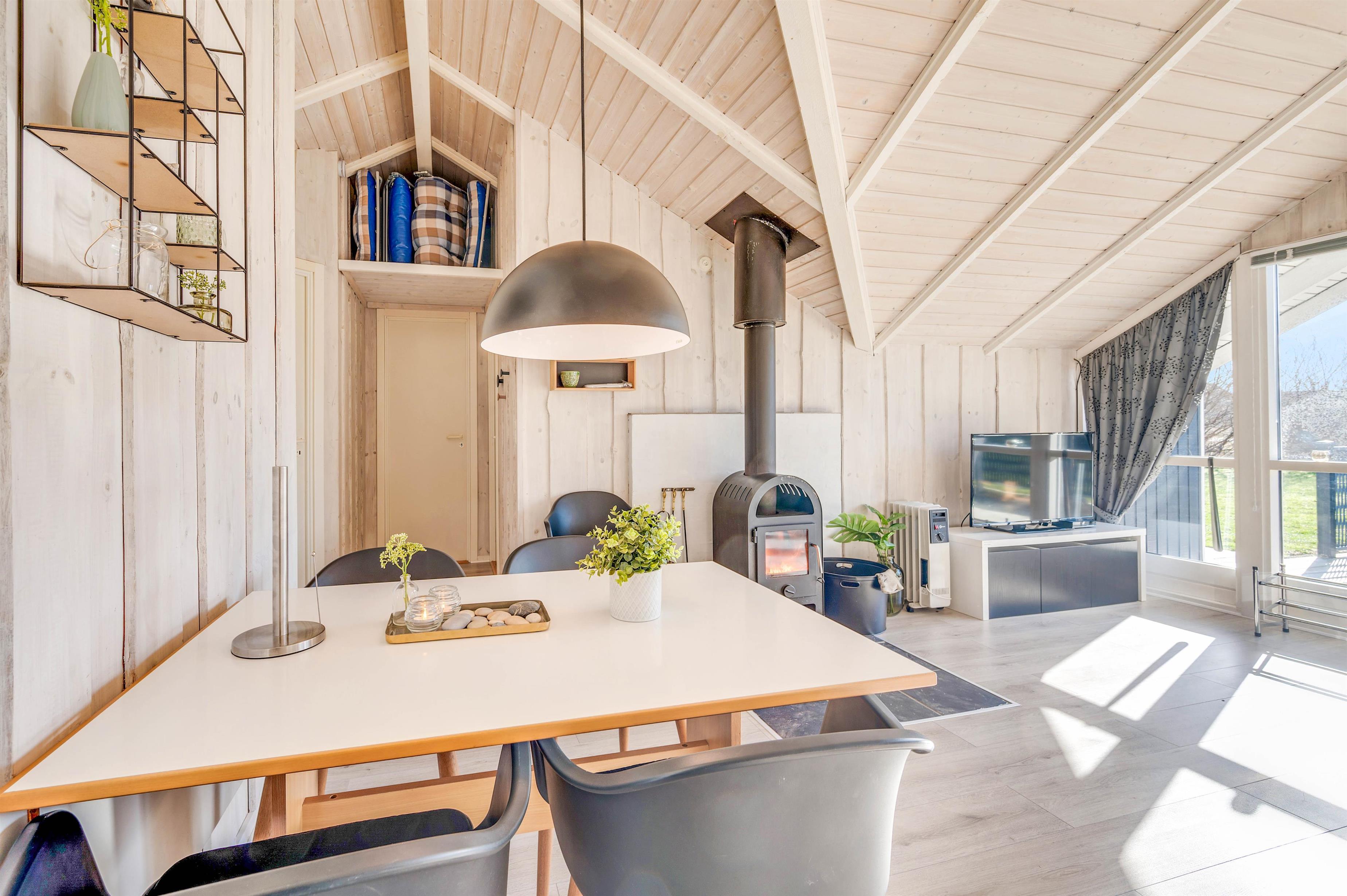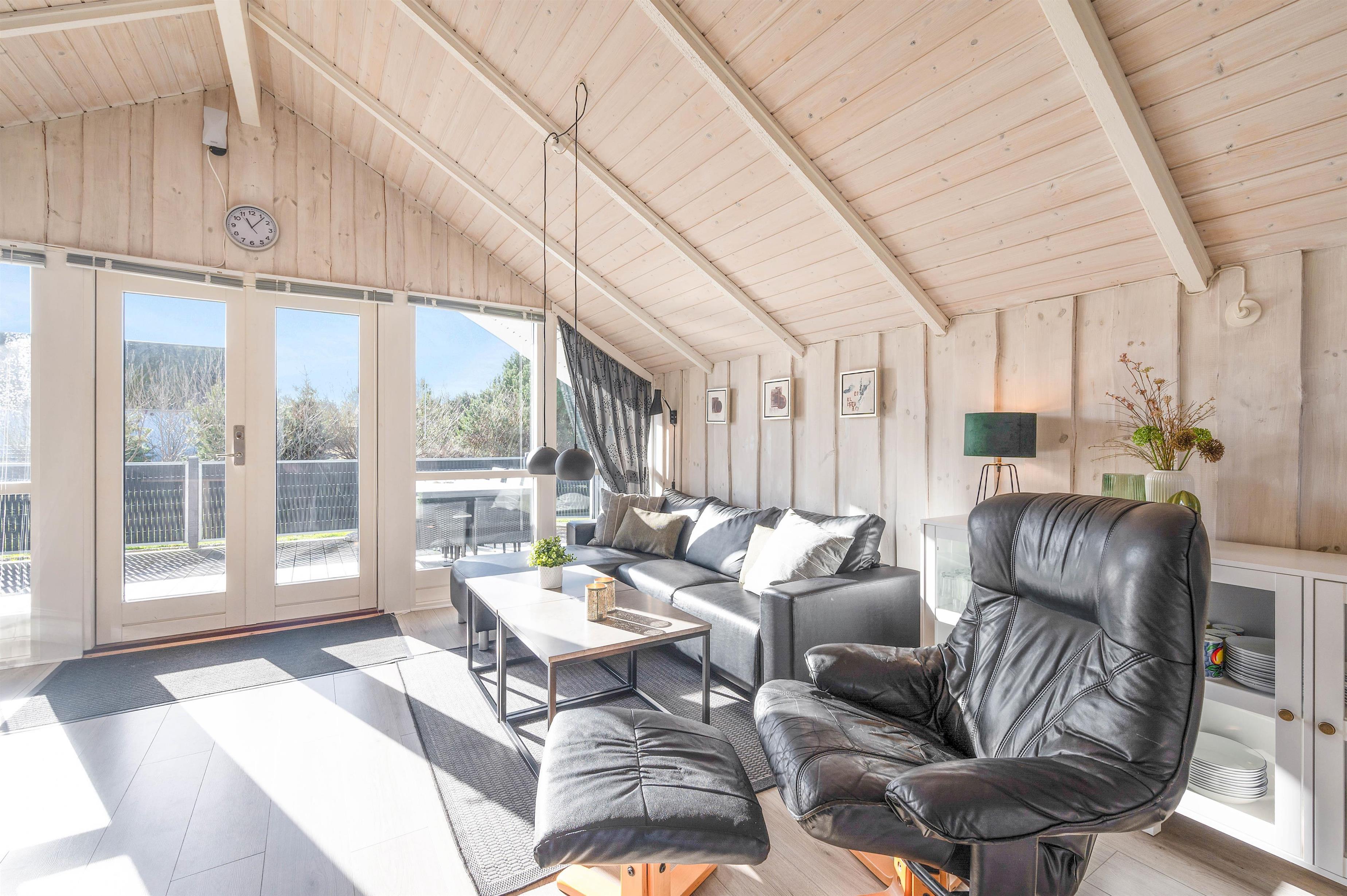Light flooring, bright walls and high ceilings create a charming and cosy atmosphere throughout this holiday home. The open-plan living room and kitchen area allows parents and children to spend quality time together. The holiday home is perfect for cooking together, enjoying board games, or watching films on the flat-screen TV while listening to the crackling fireplace. A microwave and dishwasher help with daily tasks, while the heat pump maintains a comfortable temperature throughout.