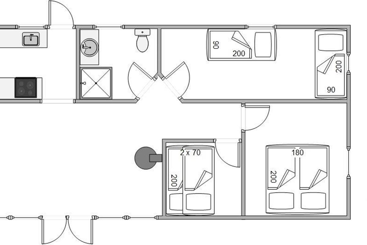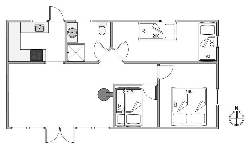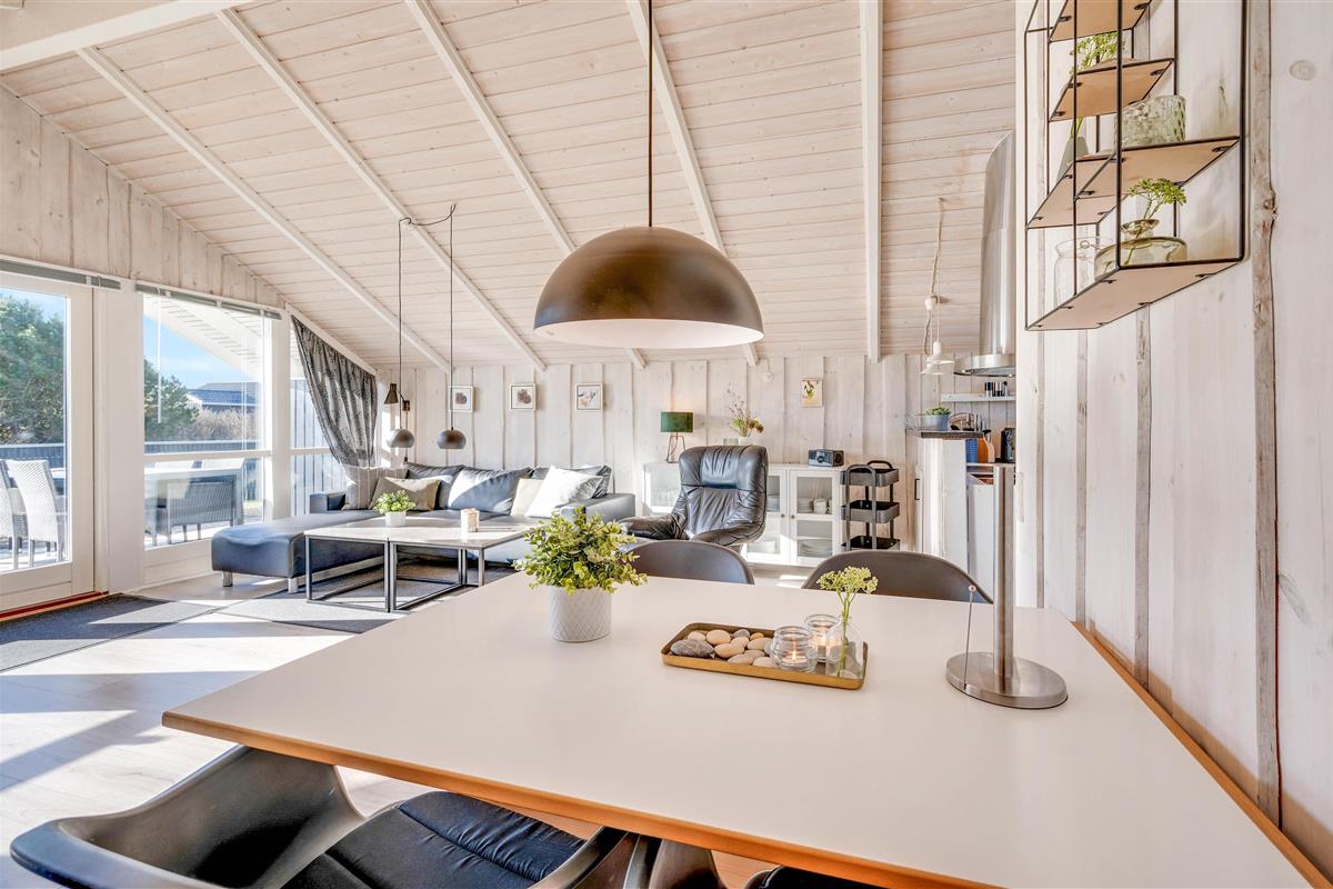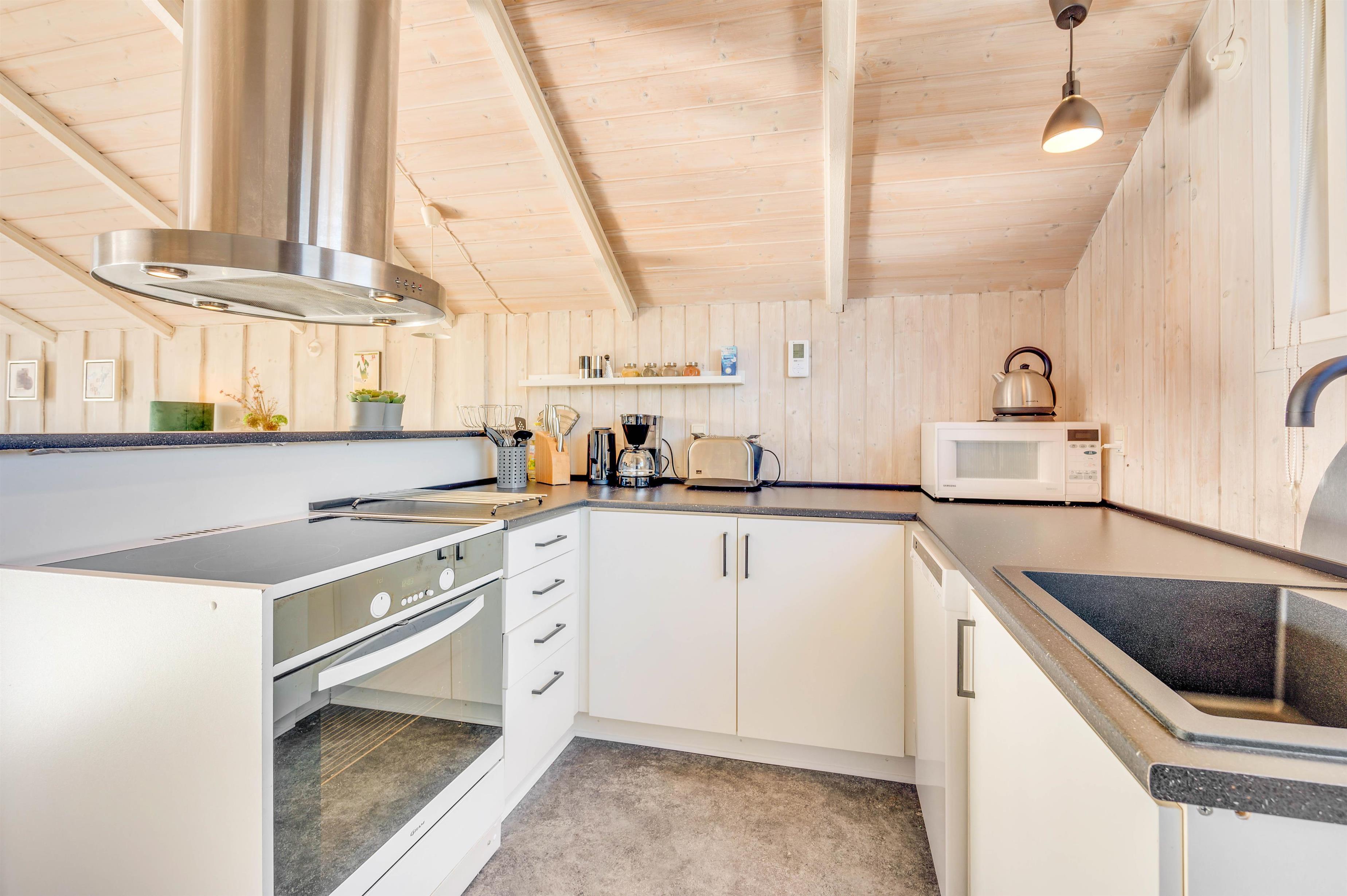 Light flooring, bright walls and high ceilings create a charming and cosy atmosphere throughout this holiday home. The open-plan living room and kitchen area allows parents and children to spend quality time together. The holiday home is perfect for cooking together, enjoying board games, or watching films on the flat-screen TV while listening to the crackling fireplace. A microwave and dishwasher help with daily tasks, while the heat pump maintains a comfortable temperature throughout.