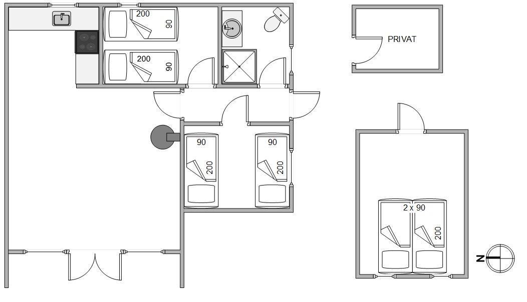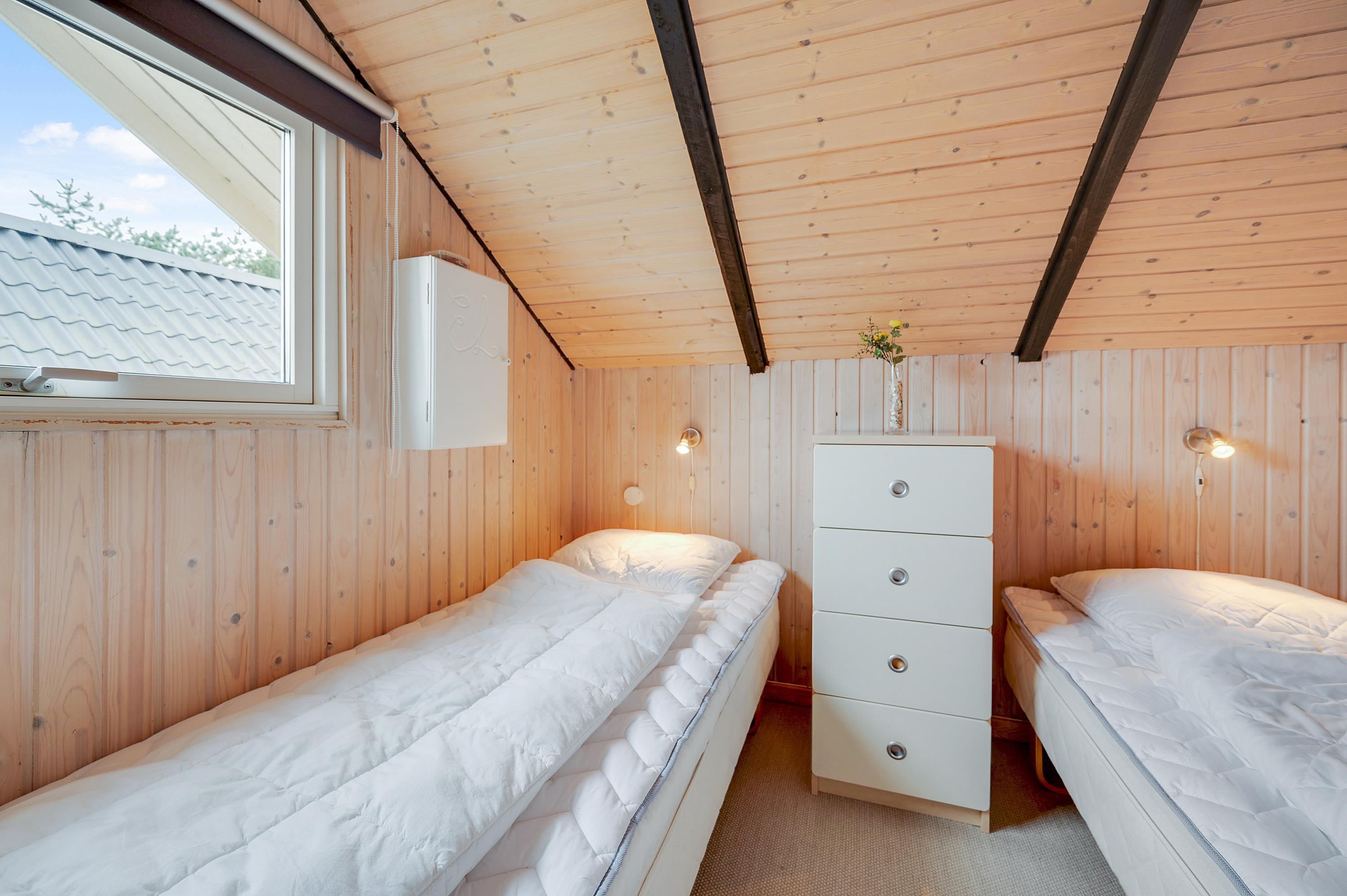 The holiday home features two bedrooms, one with a double bed and one with twin beds. Two additional sleeping spaces can be found in the annexe, which connects to the main house via a terrace. The interior is lined with wood, and with its high ceilings and exposed beams, the house exudes typical holiday home charm - comfort is a top priority here.