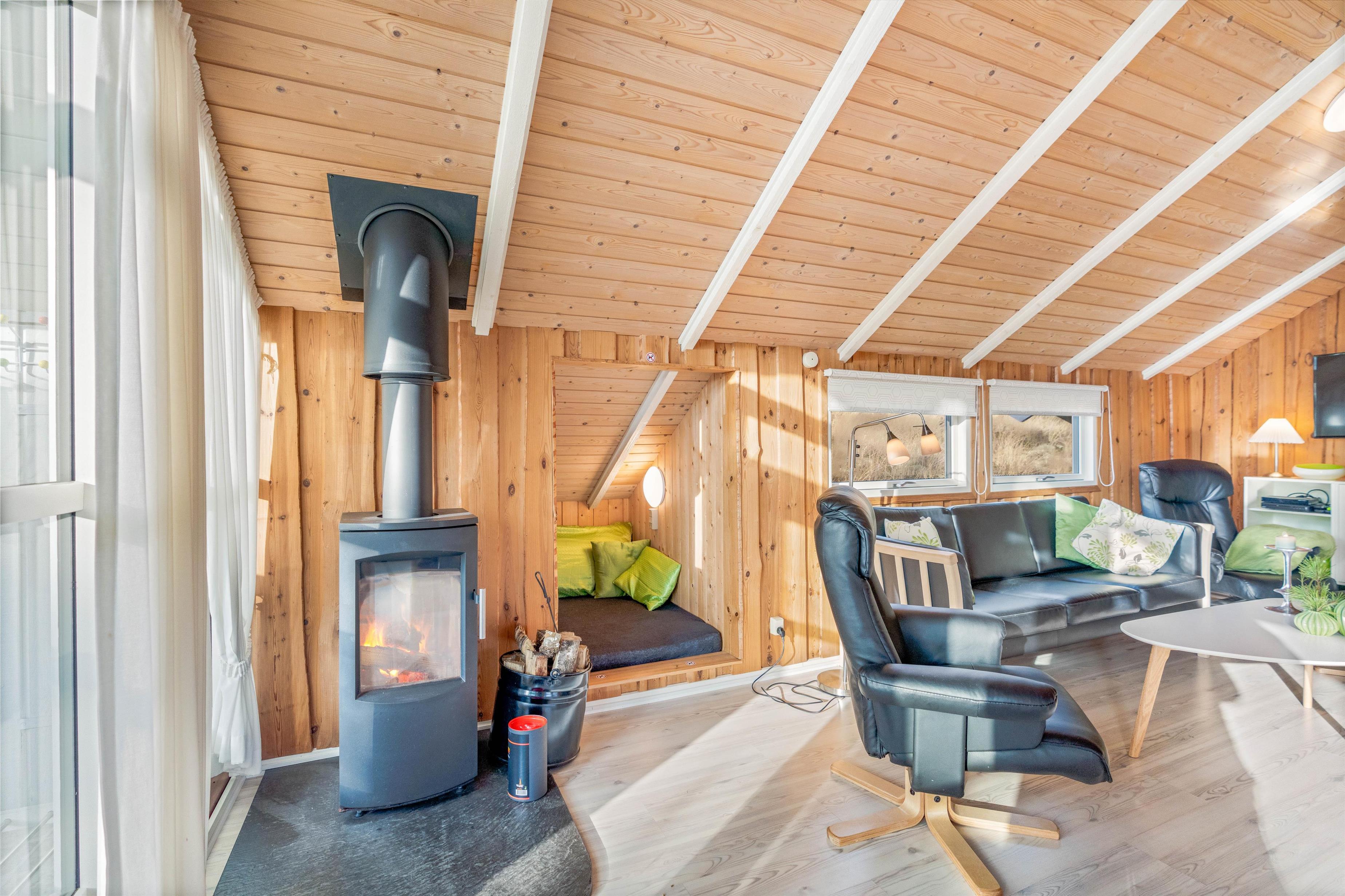 The open-plan living area invites you to enjoy family board games at the dining table or cosy film evenings, while the wood-burning stove provides welcoming warmth and creates a perfectly relaxing atmosphere with its gentle crackling. The kitchen, renovated in 2023, features a 171-litre fridge with a 42-litre freezer compartment and microwave, perfect for trying out Danish recipes together.