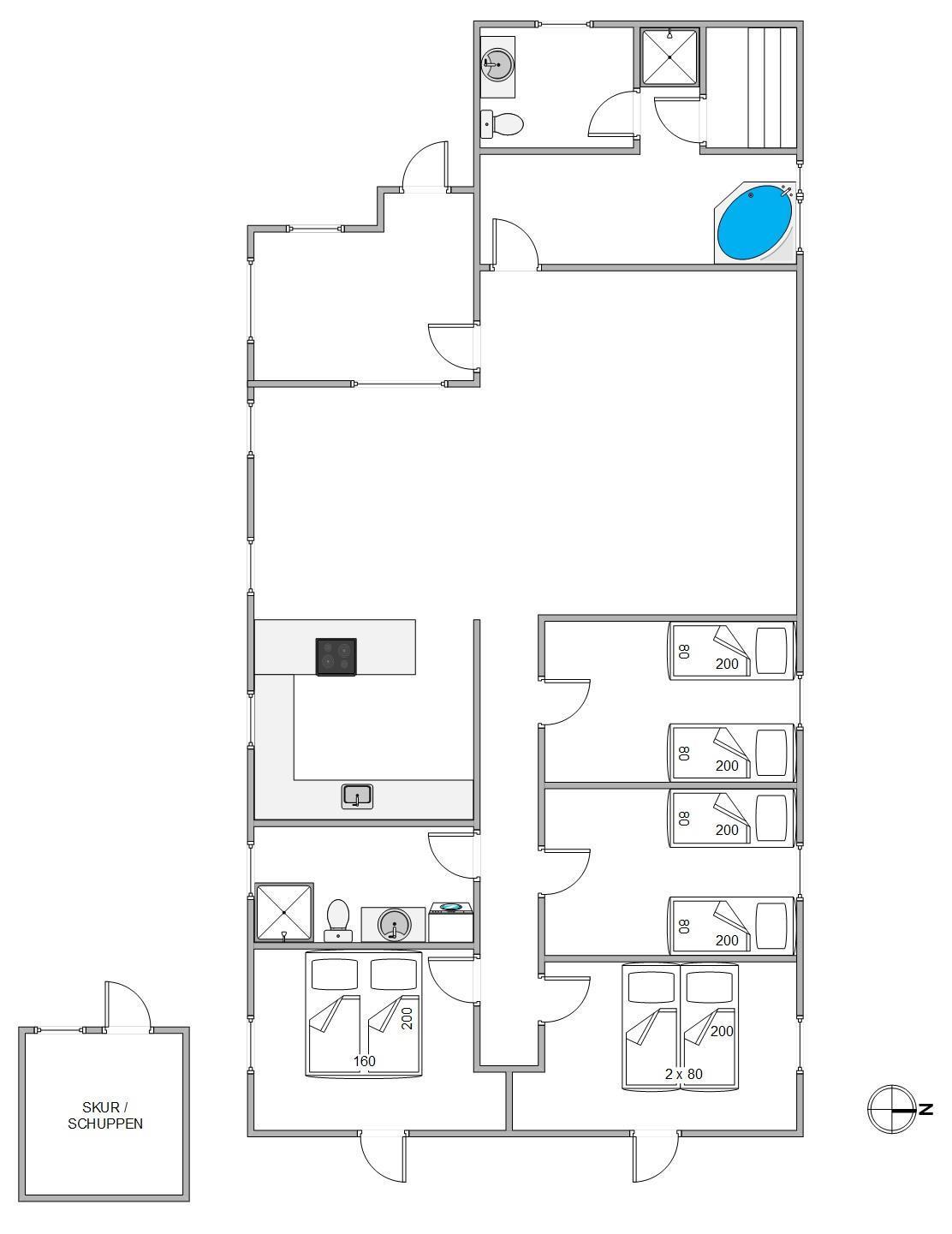 To avoid morning queues, the holiday home has two bathrooms, both featuring showers and underfloor heating. You'll also find a washing machine for refreshing towels. The larger bathroom is perfect for relaxation, whether enjoying the sauna or unwinding in the whirlpool – ideal for leaving everyday stress behind.