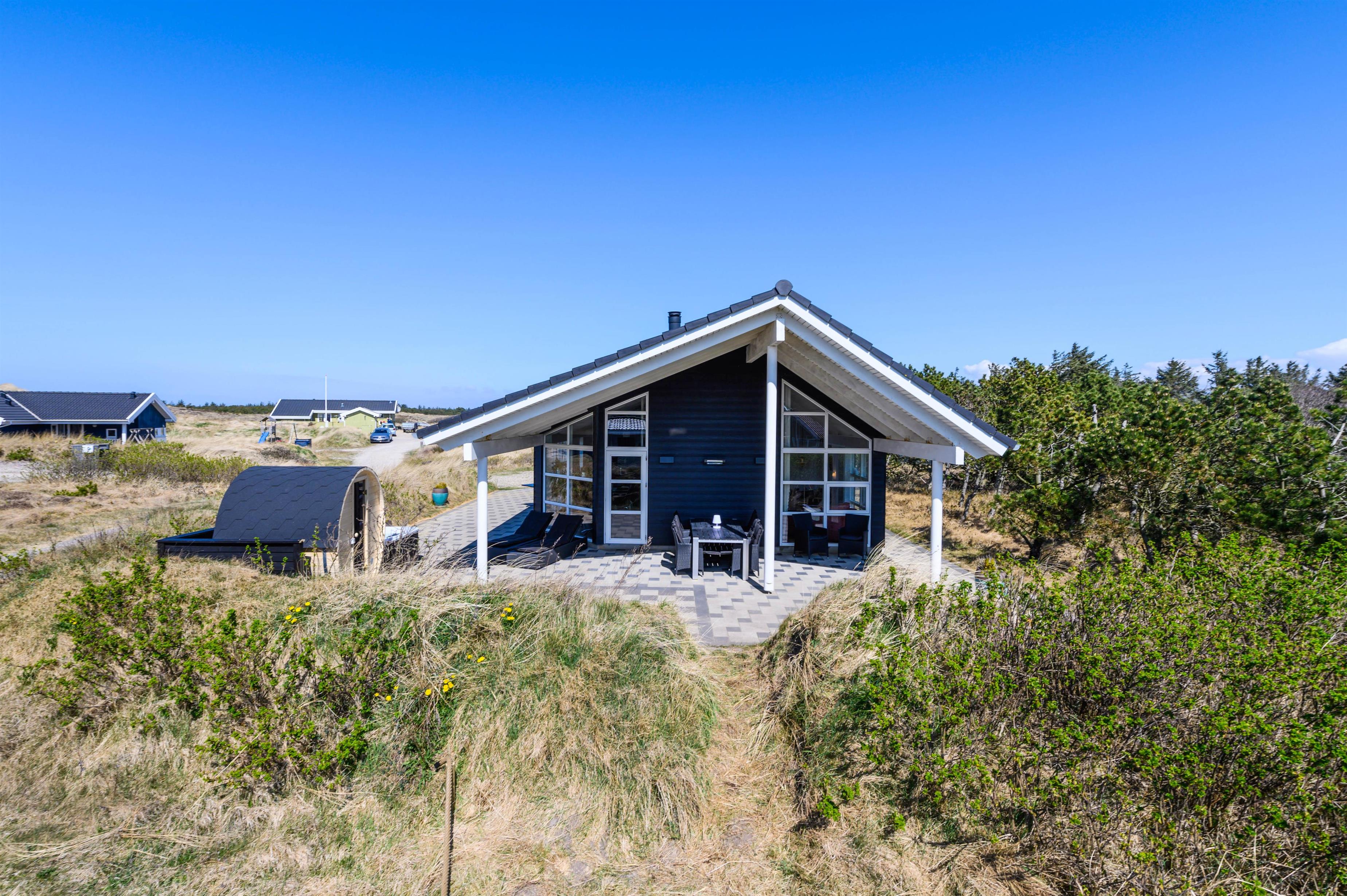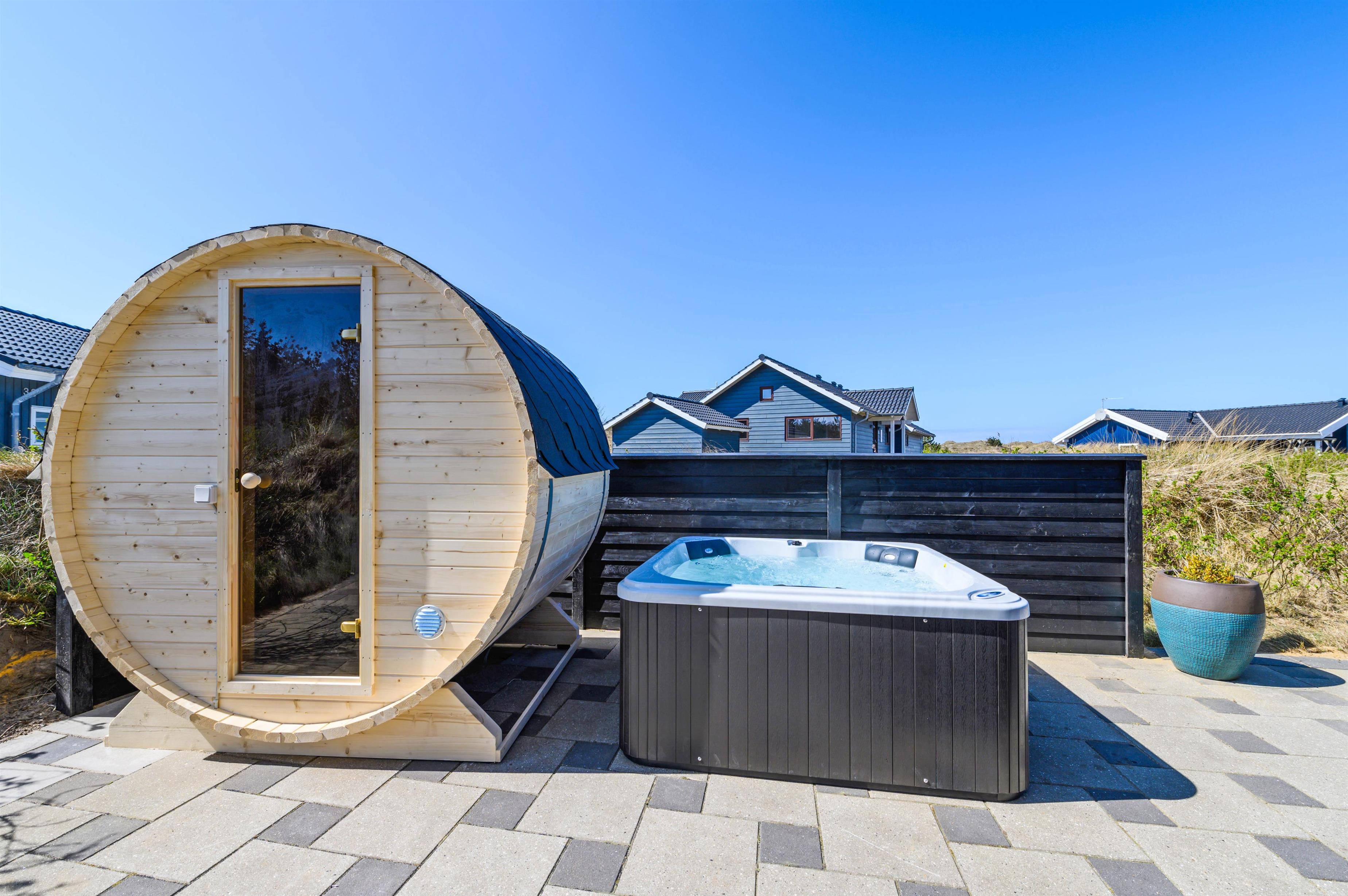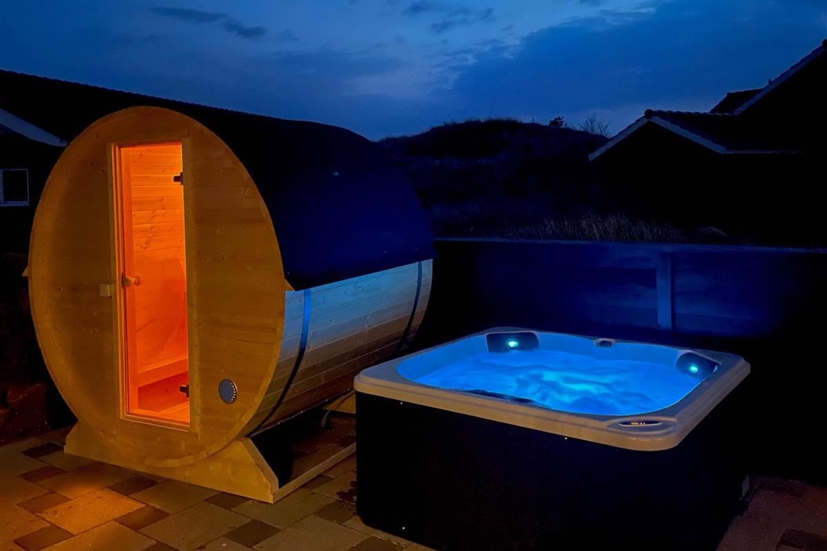 Located at Bjerregårdsvej 38 B, this modern holiday home accommodates up to 8 people. The holiday home features both an indoor whirlpool and outdoor hot tub, an outdoor sauna, two bathrooms and a beautiful, spacious terrace that's partially covered - perfect for relaxing BBQ evenings while enjoying wine from the dedicated wine fridge. The holiday home in Bjerregård comes with an electric car charging point.