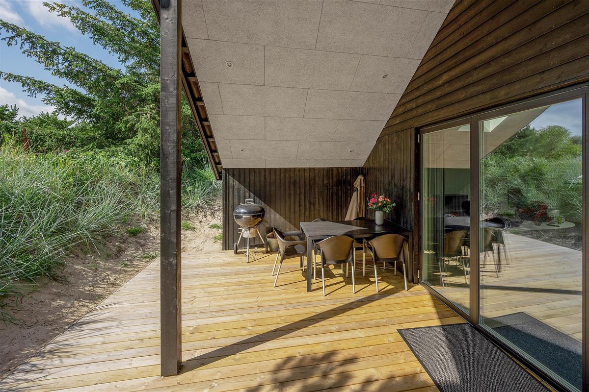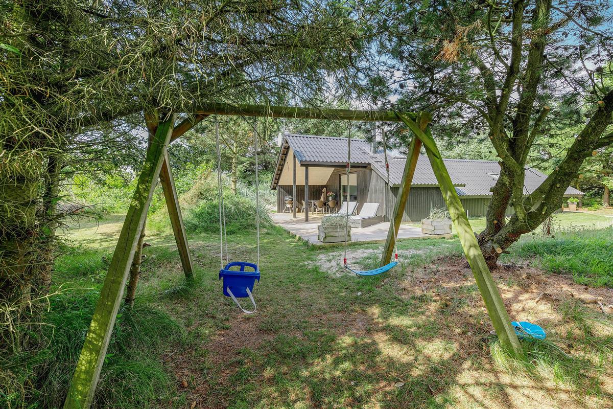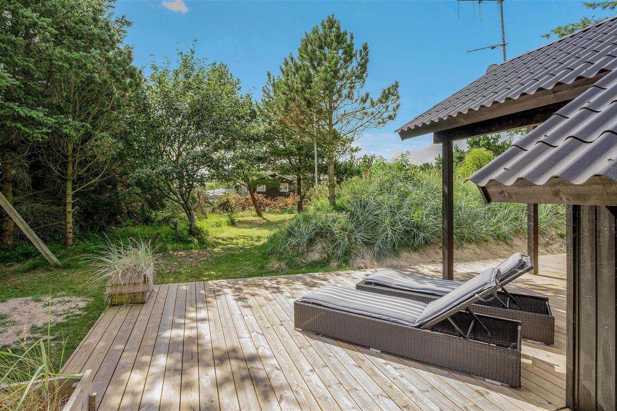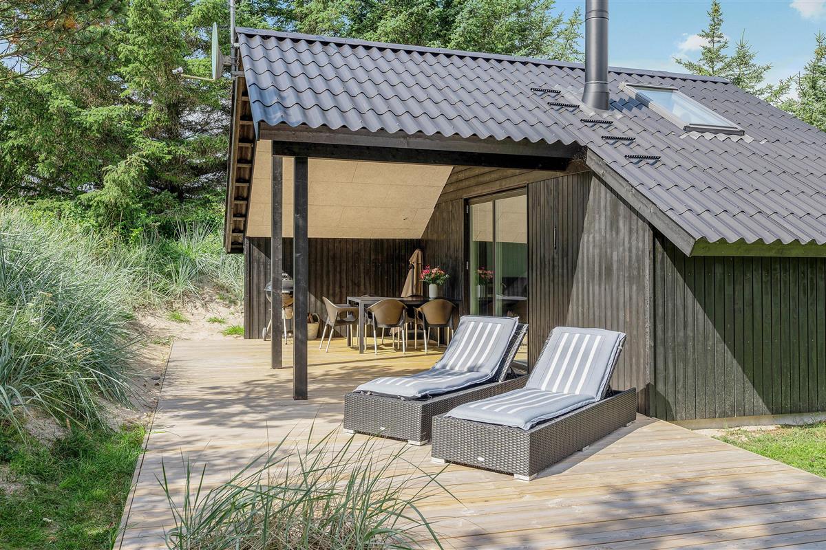 Large patio doors from the living area lead to the spacious wooden terrace. There's plenty of room for the whole family, with a covered section offering comfortable shade. Relax on the sun loungers while children play on the terrace and in the expansive grounds, which include a swing and sandbox.