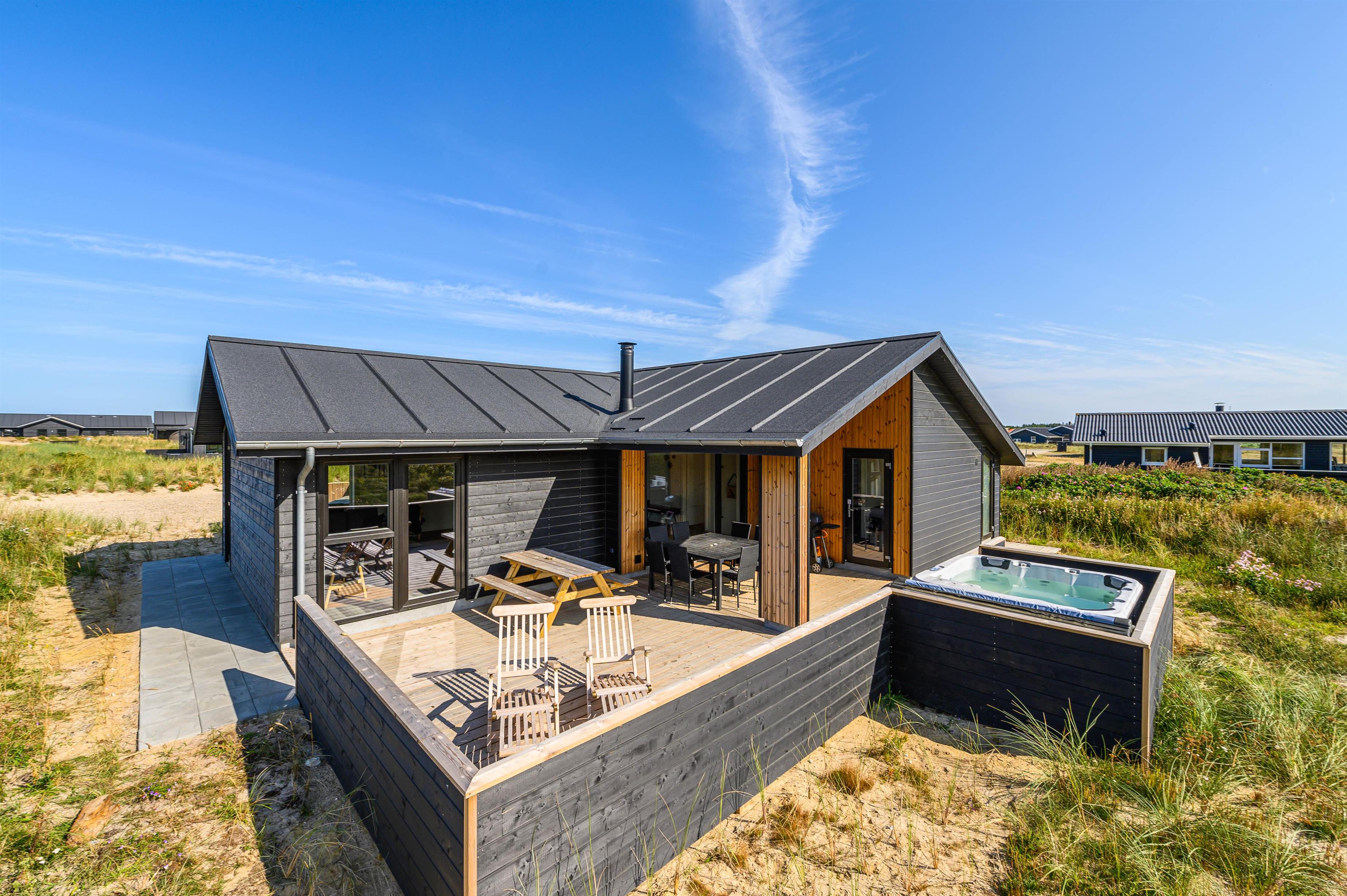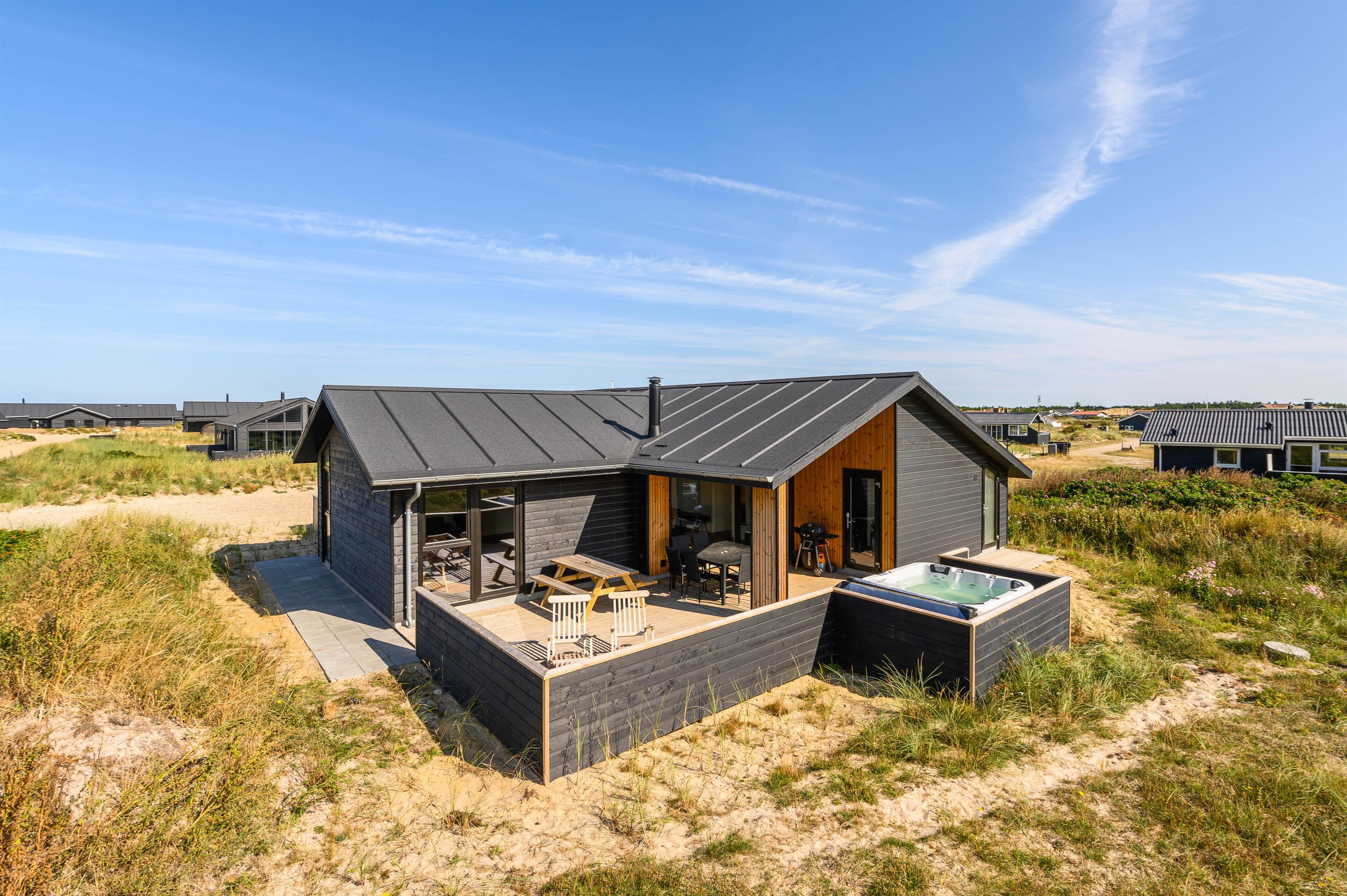 Located just 175 metres from the dunes, beach and North Sea, this superb holiday home on Bjerregårdsvej 381 was newly built in 2021. The four bedrooms provide comfortable sleeping accommodation for up to six people. For those seeking that extra touch of luxury, there's both a sauna and a fantastic outdoor hot tub!