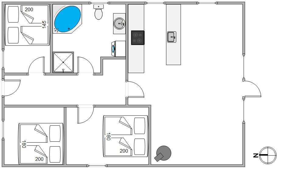 The bright bathroom features floor heating, a washing machine, and a hot tub, perfect for relaxing in warm, soothing water. There are 3 comfortable bedrooms with double beds, ensuring a good night’s sleep – the fresh sea air from the North Sea also contributes to restful nights.