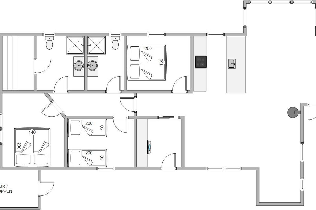 The holiday home accommodates up to 8 people, with two bedrooms with double beds, one bedroom with twin beds, and two sleeping spaces in the living room's sleeping nook. There are two lovely bathrooms with shower and underfloor heating, plus a sauna with two benches. The open-plan kitchen is equipped with a fridge/freezer, dishwasher, ceramic hob and microwave.
