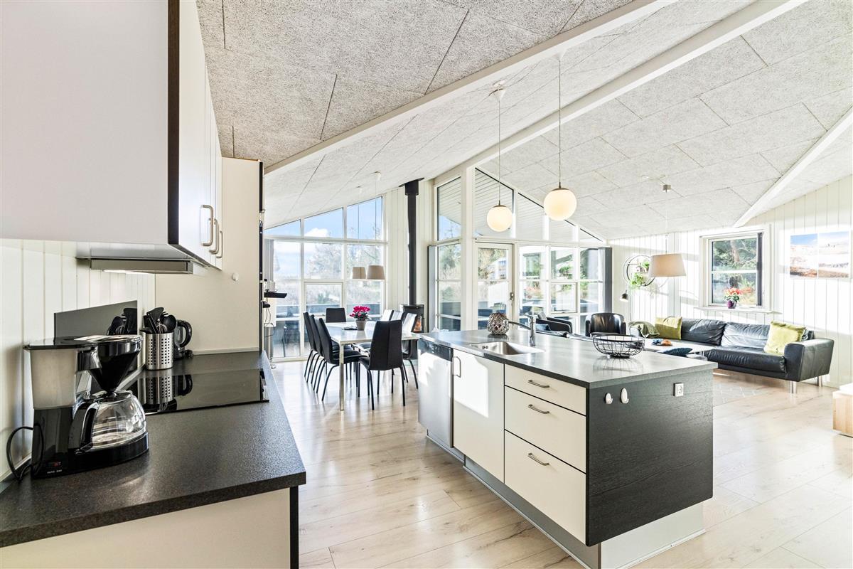 The wood-burning stove creates cosy evenings with comfortable warmth. Alongside the stove, the energy-efficient heat pump contributes to a pleasant indoor climate. Large windows let in plenty of natural light and offer views of the surrounding nature. Relax on the sofa with your favourite book and enjoy the crackling of the fire.