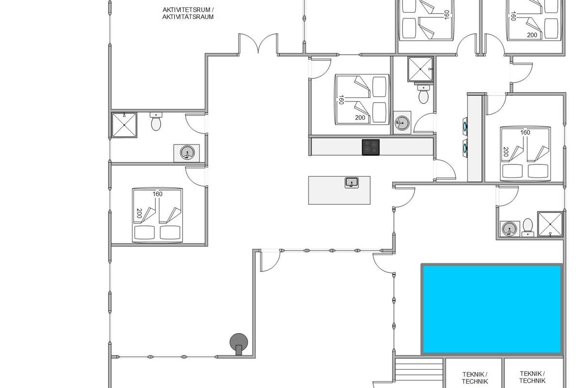 Das Ferienhaus fügt sich mit seiner grünen Fassade harmonisch in die Natur ein und verbindet moderne Ausstattung mit Gemütlichkeit. In der offenen Küche mit Essbereich und Wohnzimmer könnt ihr gemeinsam kochen, essen und entspannen – der Kaminofen sorgt für wohlige Wärme. Neben dänischen TV-Kanälen stehen euch auch deutsche Programme zur Verfügung. 7 Schlafzimmer bieten reichlich Platz: 5 davon mit Doppelbetten, 2 weitere mit jeweils 2 Einzelbetten. Zusätzlich gibt es 2 separate Hems – einer im Aktivitätsraum mit zwei Schlafplätzen und ein weiterer im Eingangsbereich mit ebenfalls zwei Schlafplätzen. So können auch größere Familien oder befreundete Paare komfortabel untergebracht werden.