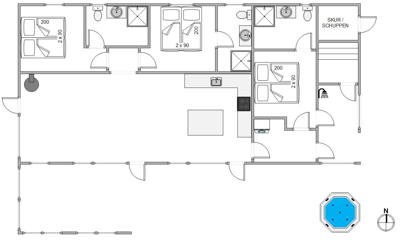 The house layout is perfect for families and particularly well-suited for multiple couples. Each of the three bedrooms has its own en-suite bathroom, offering practical and private arrangements.