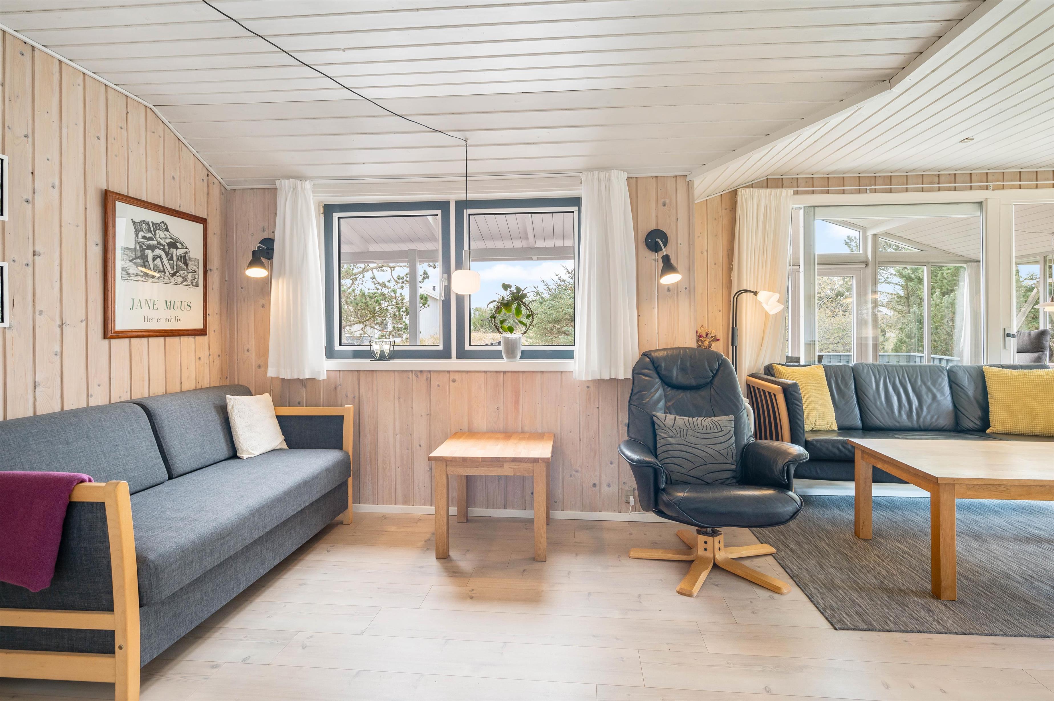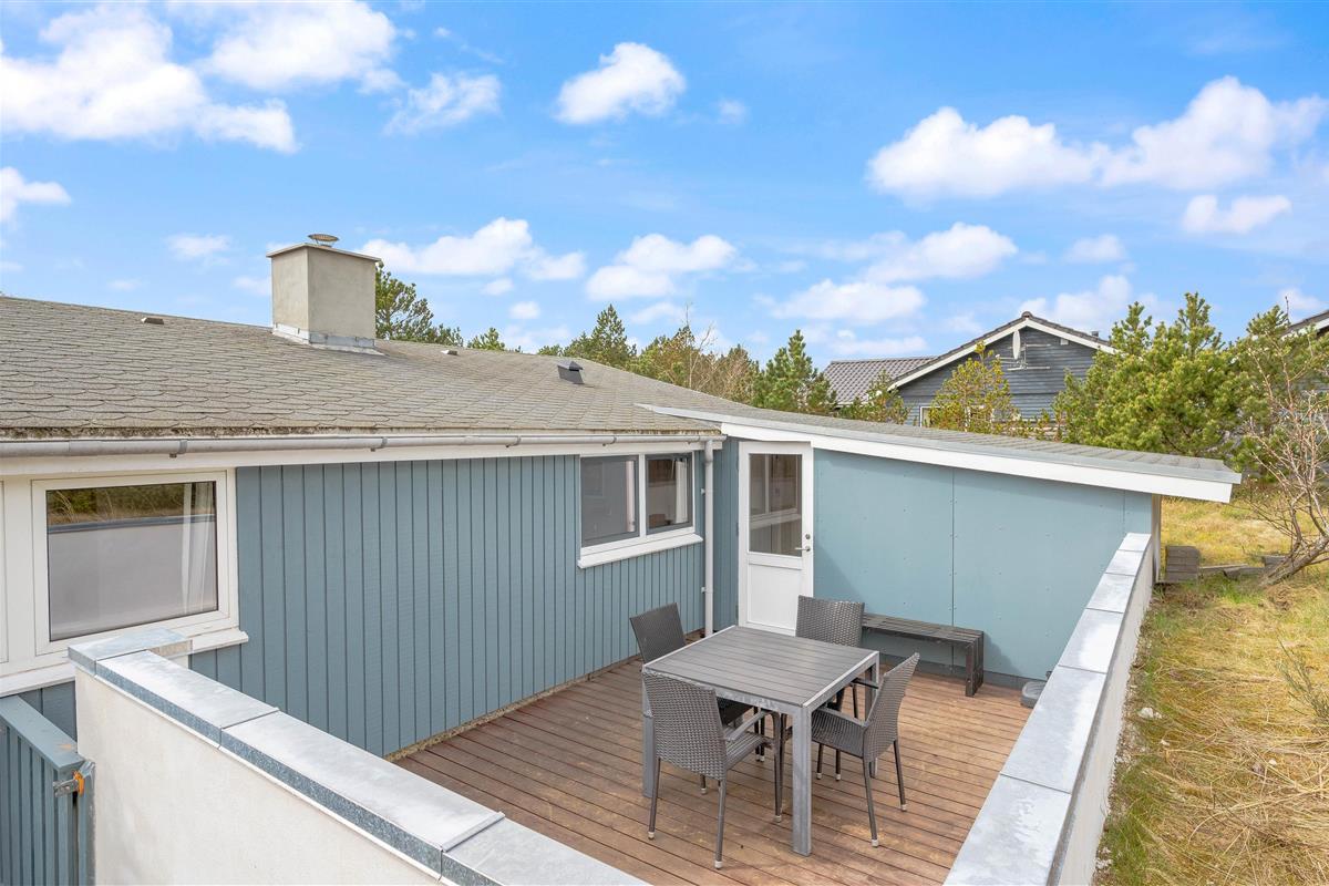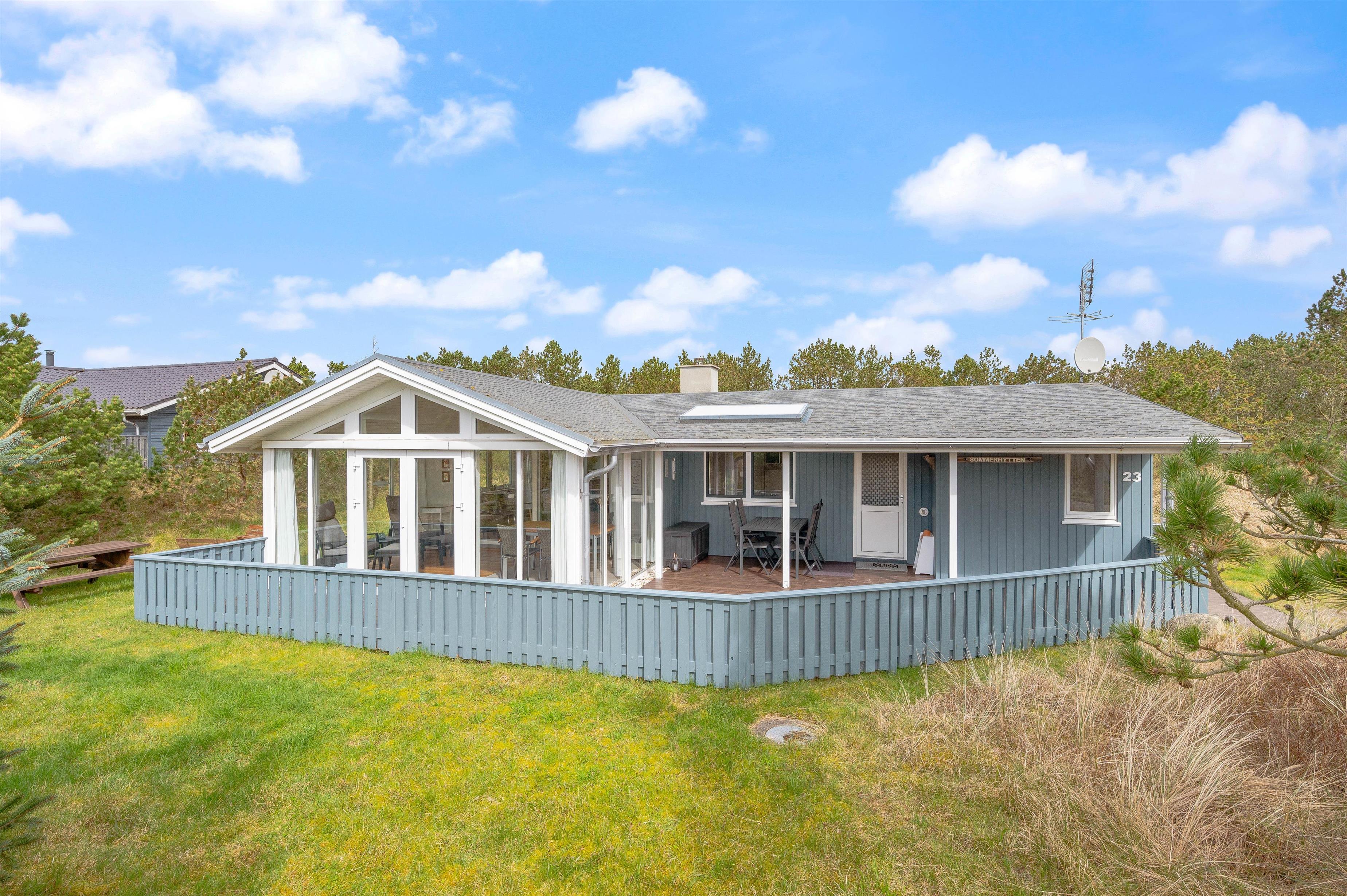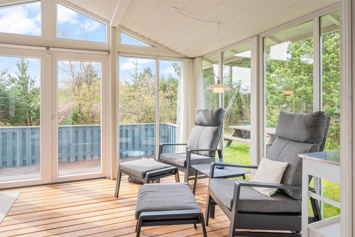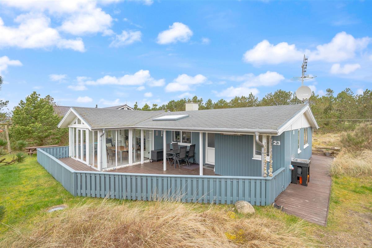 This well-maintained holiday home in Bjerregard sits on a partially sheltered plot. The holiday home features a bright conservatory leading to an enclosed, partially covered terrace - perfect for family barbecue evenings.