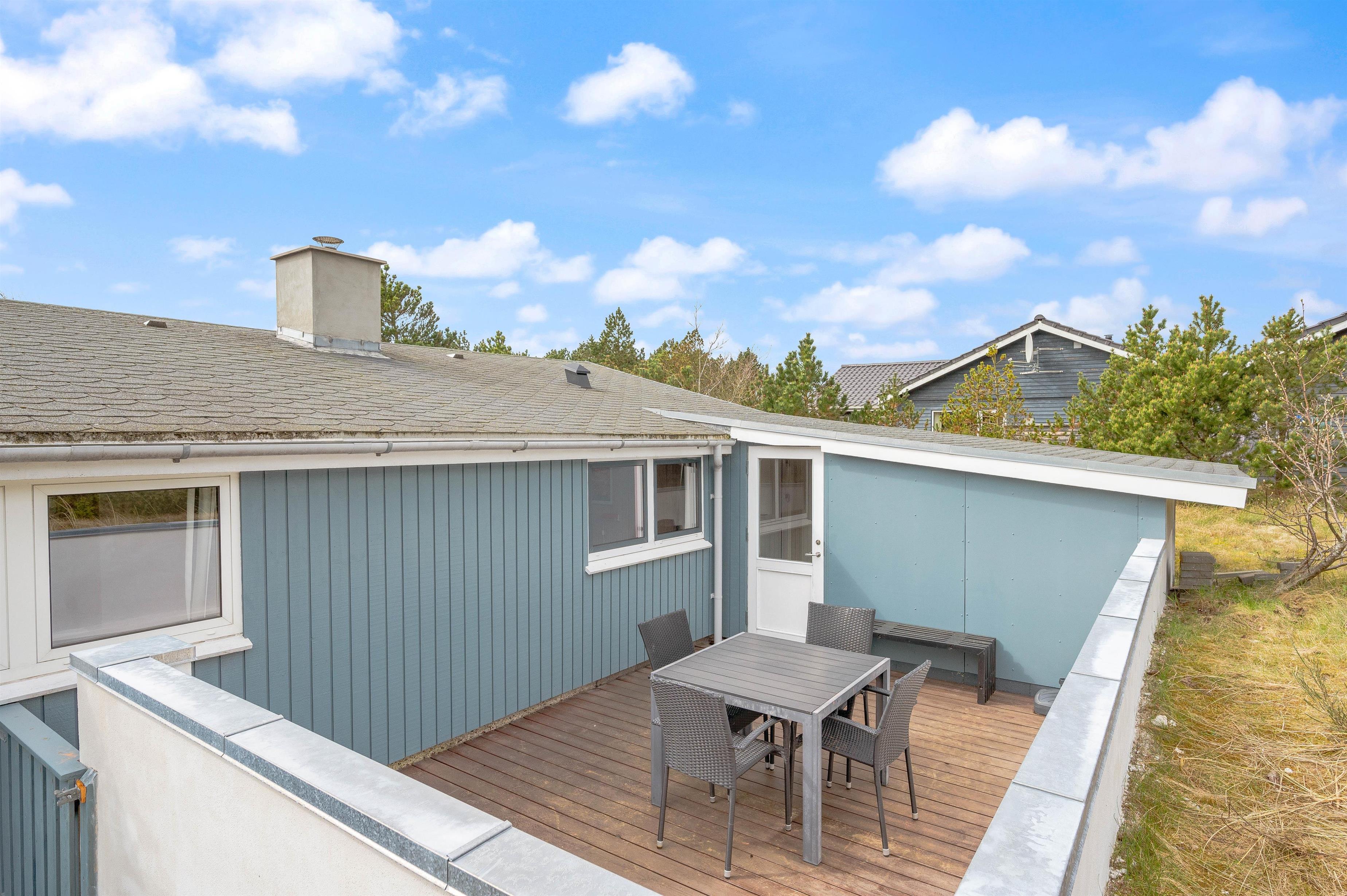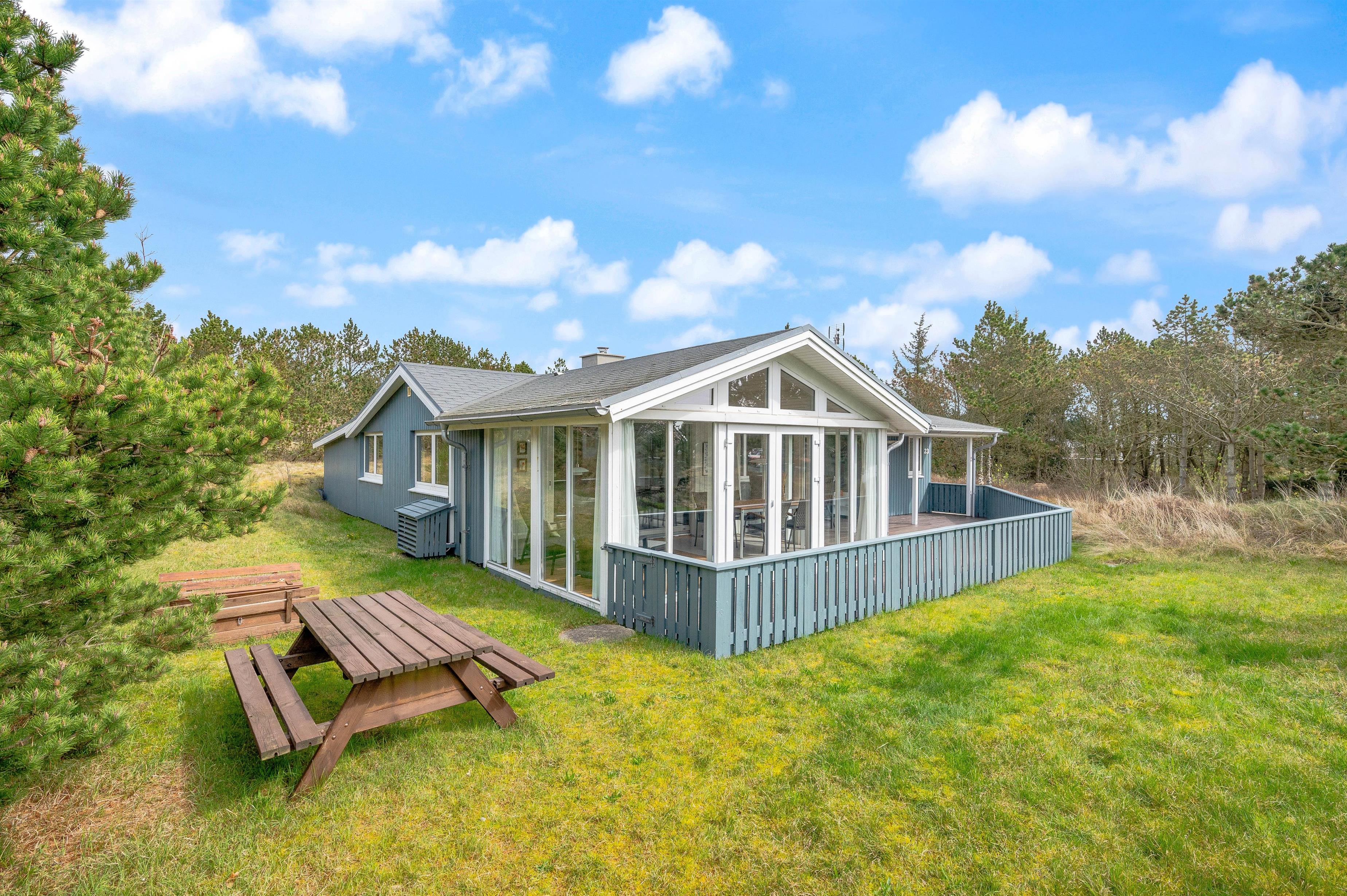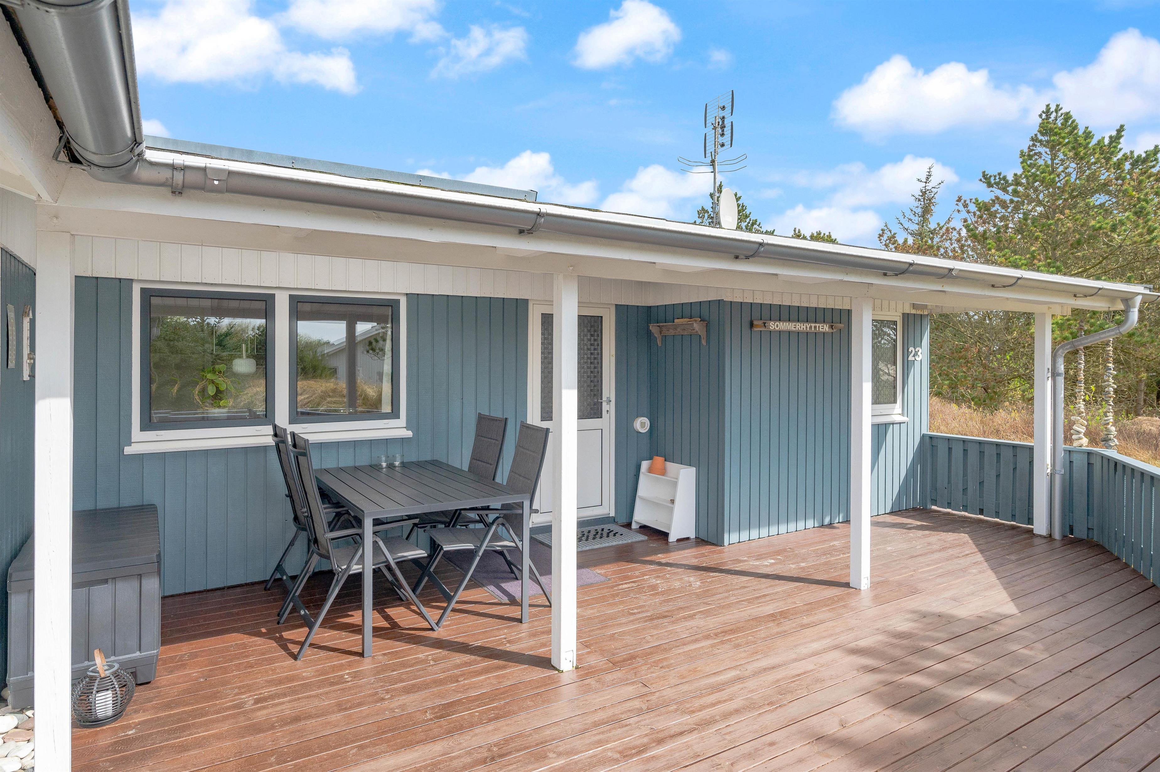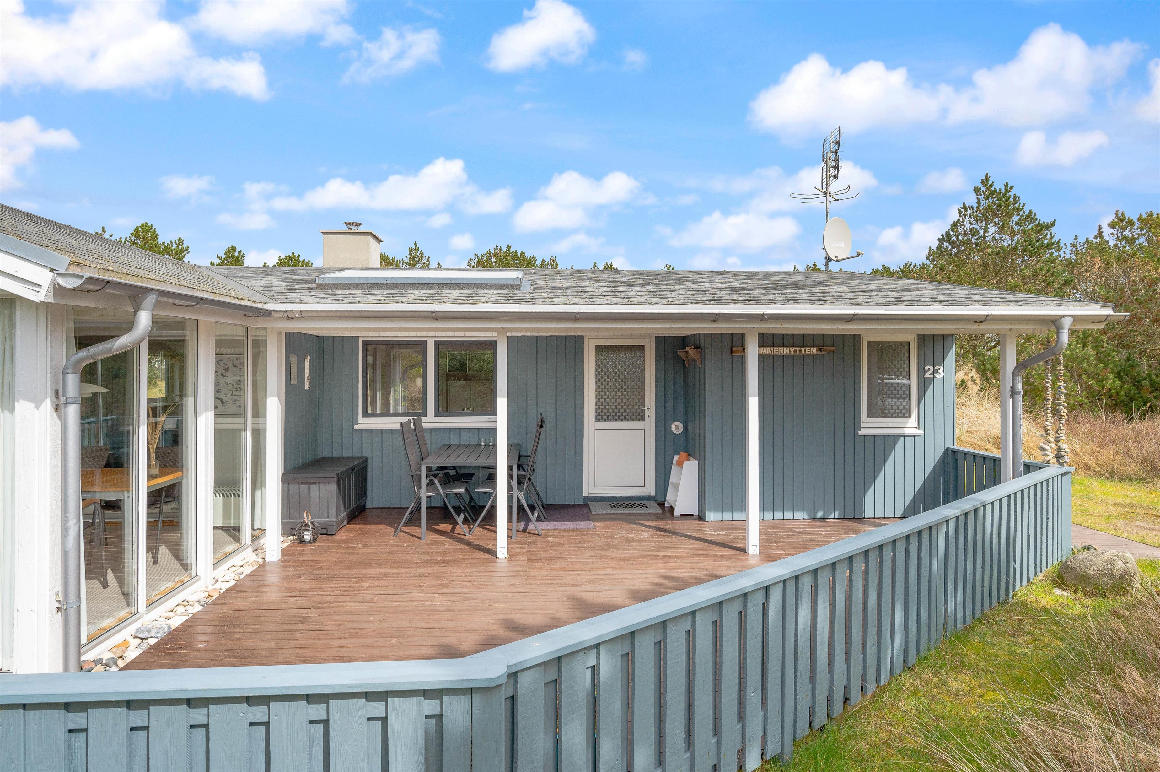 This well-maintained holiday home in Bjerregard sits on a partially sheltered plot. The holiday home features a bright conservatory leading to an enclosed, partially covered terrace - perfect for family barbecue evenings.