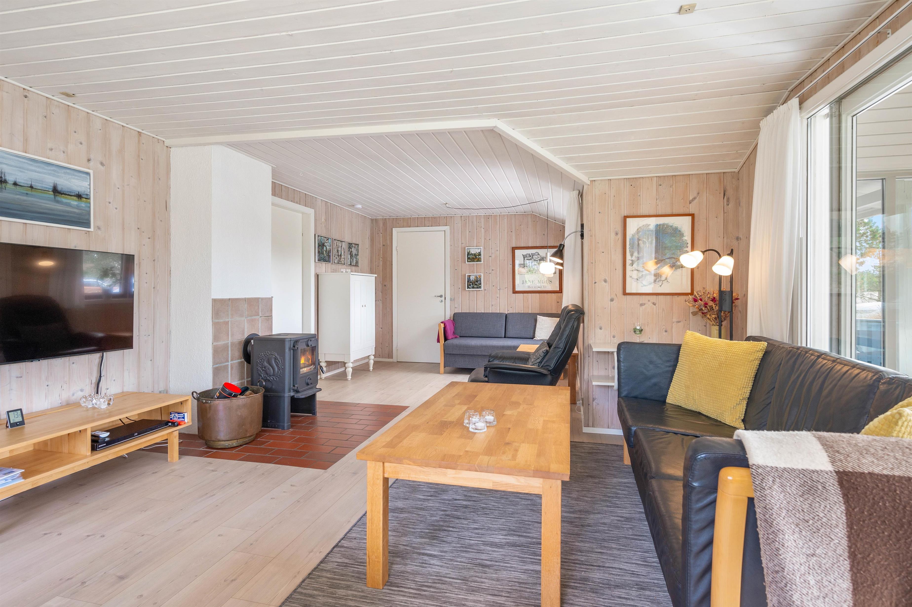 The living area features a wood-burning stove, providing both warmth and a cosy atmosphere on chilly days. It's the perfect spot to unwind after a long day in the fresh air at the beach. The bathroom with shower was completely renovated in 2013. The kitchen includes a 111-litre freezer, and there's an outdoor fish cleaning station - ideal for anglers.