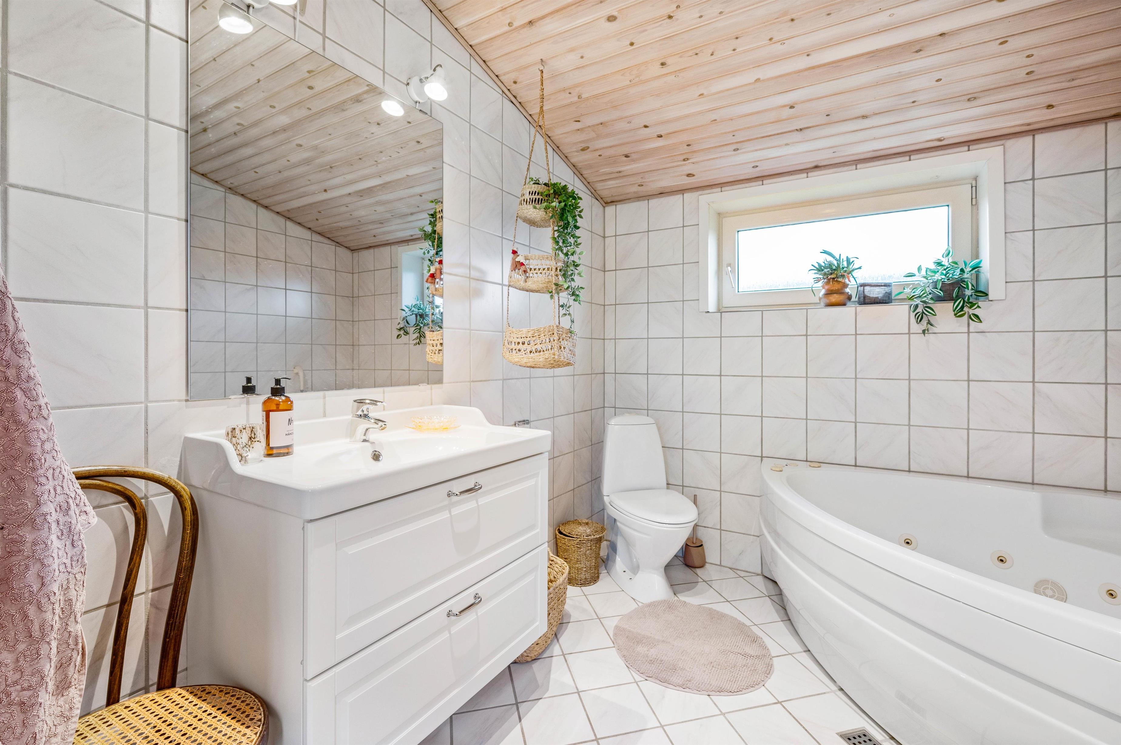 A wood-burning stove provides warmth after a lovely beach walk. The holiday home also features an energy-efficient heat pump for heating. The well-maintained kitchen is perfect for cooking, offering the chance to try out Danish recipes. The practical bathroom with underfloor heating features a whirlpool for relaxing soaks.