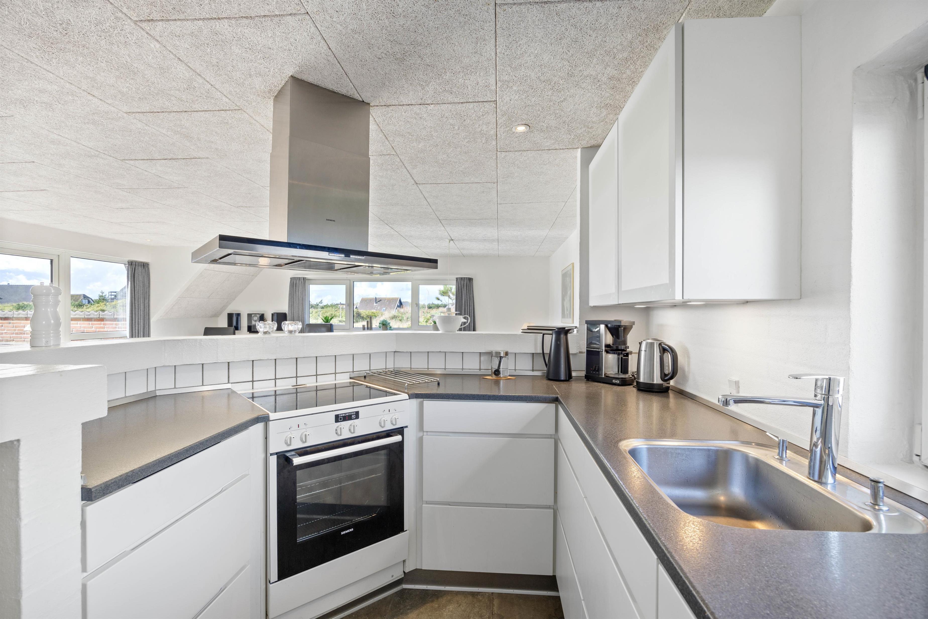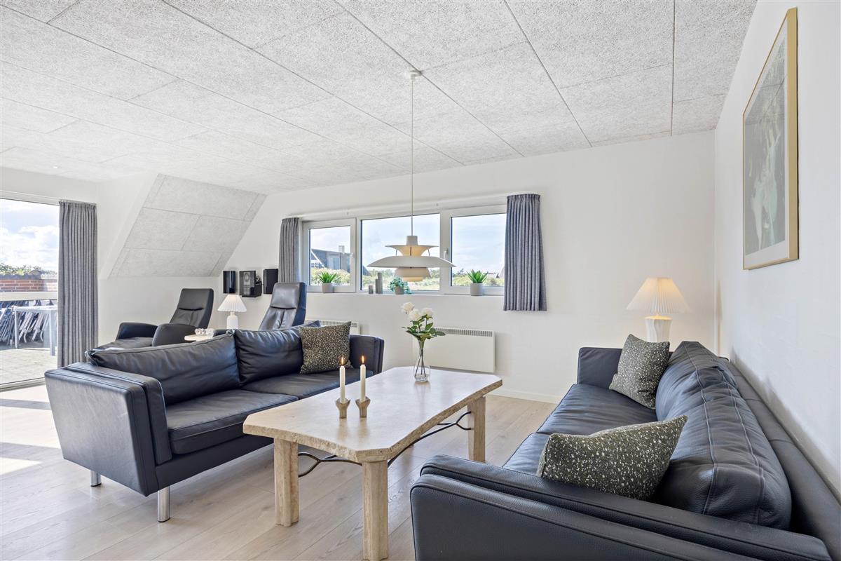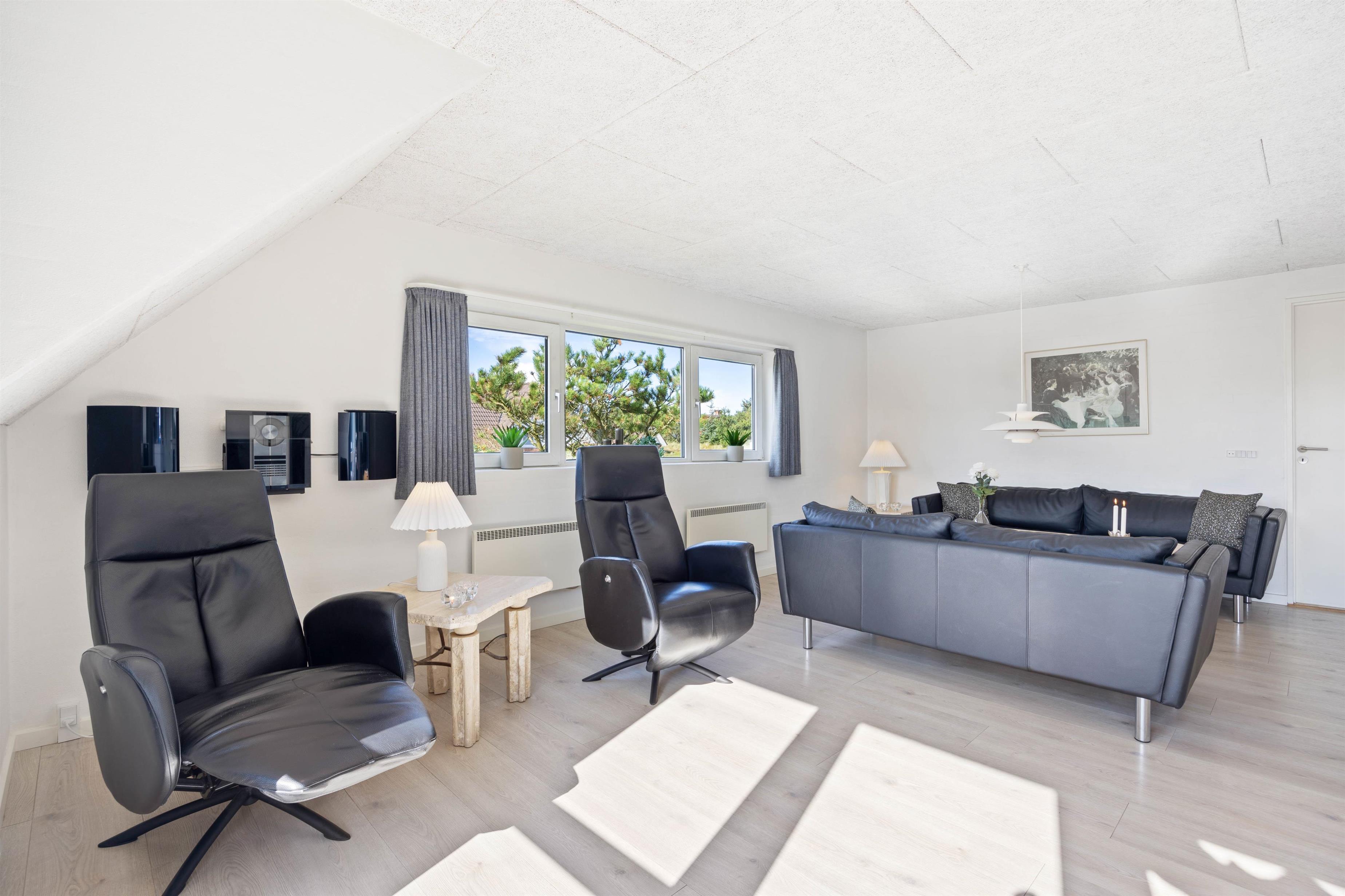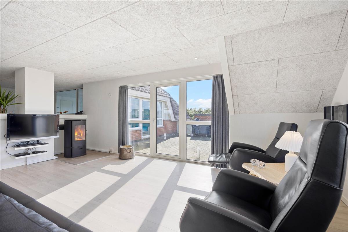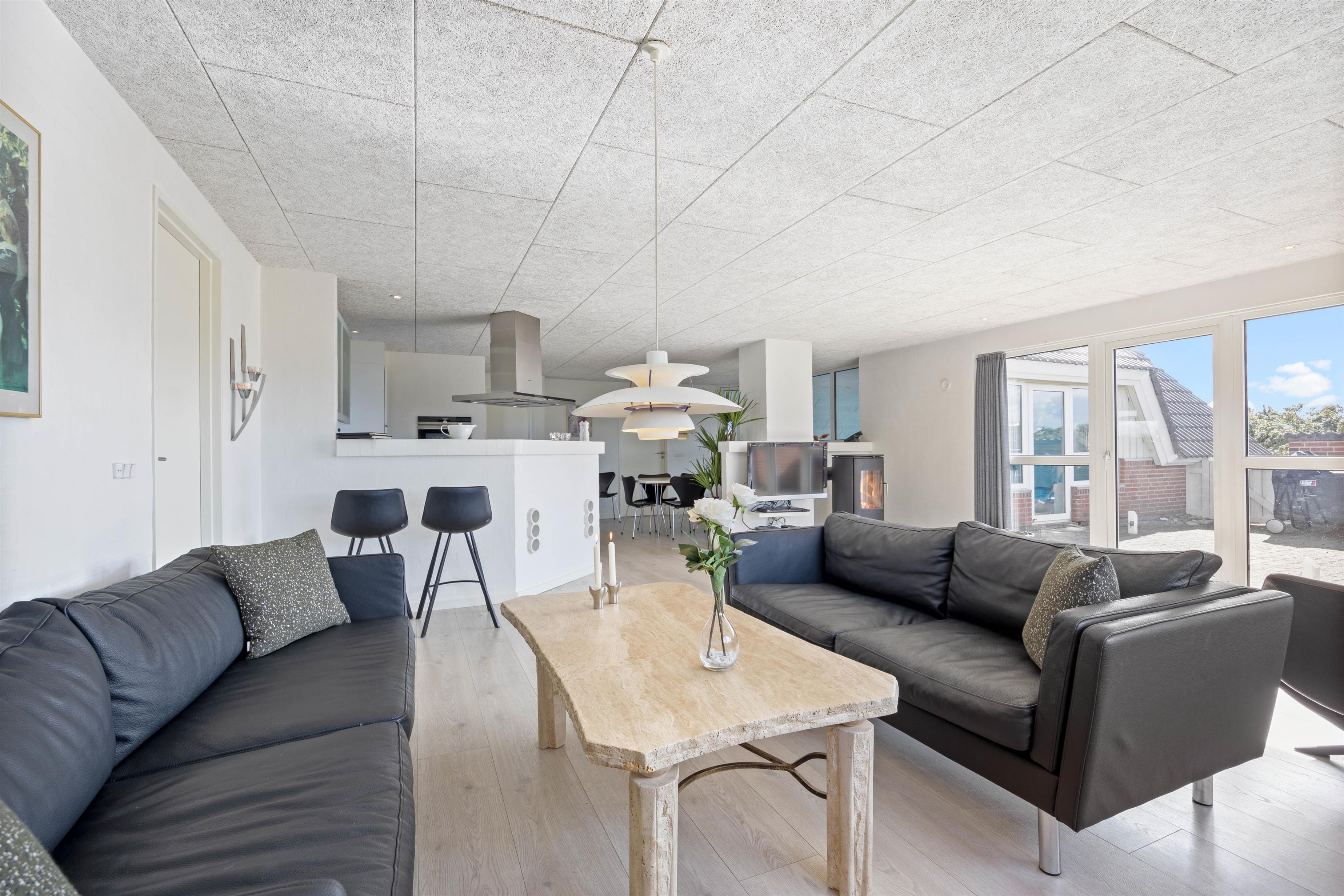 The welcoming, bright living area invites you to relax by the crackling fire of the wood-burning stove. A comfortable corner sofa with armchairs provides the perfect retreat for a relaxing holiday on the Danish West Coast. In addition to the wood-burner, a heat pump provides alternative heating for cooler days.