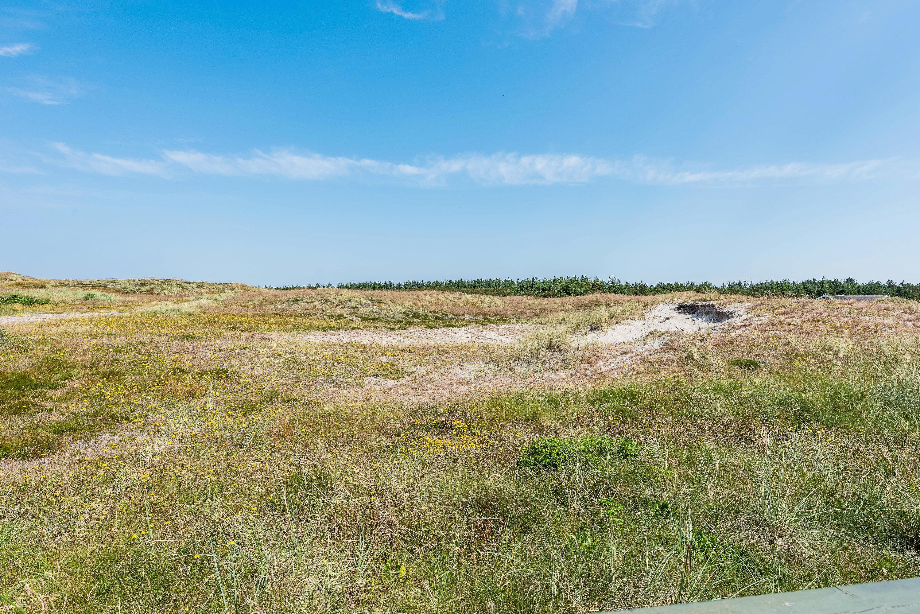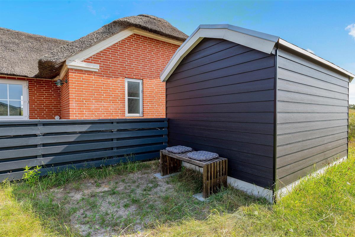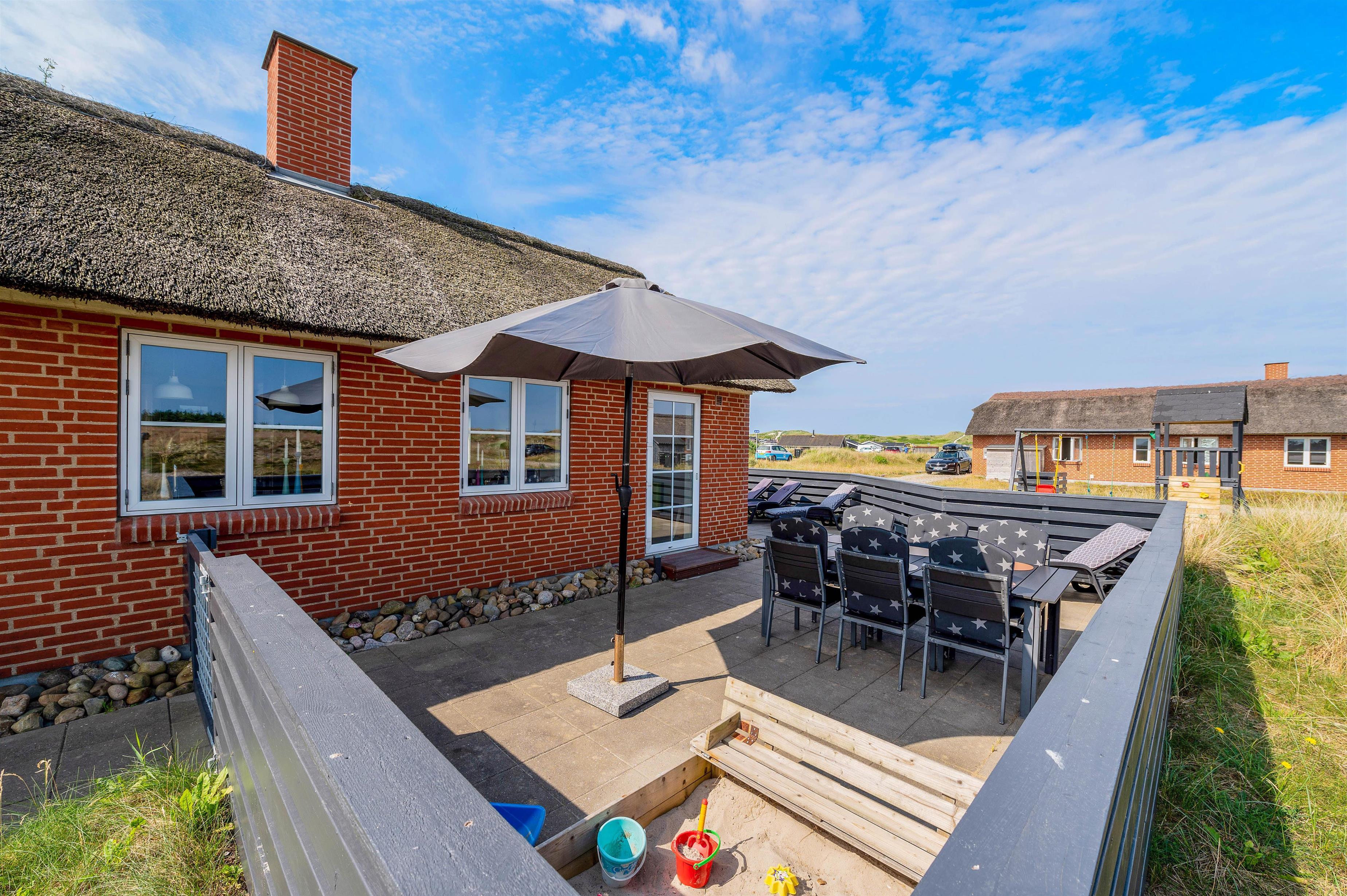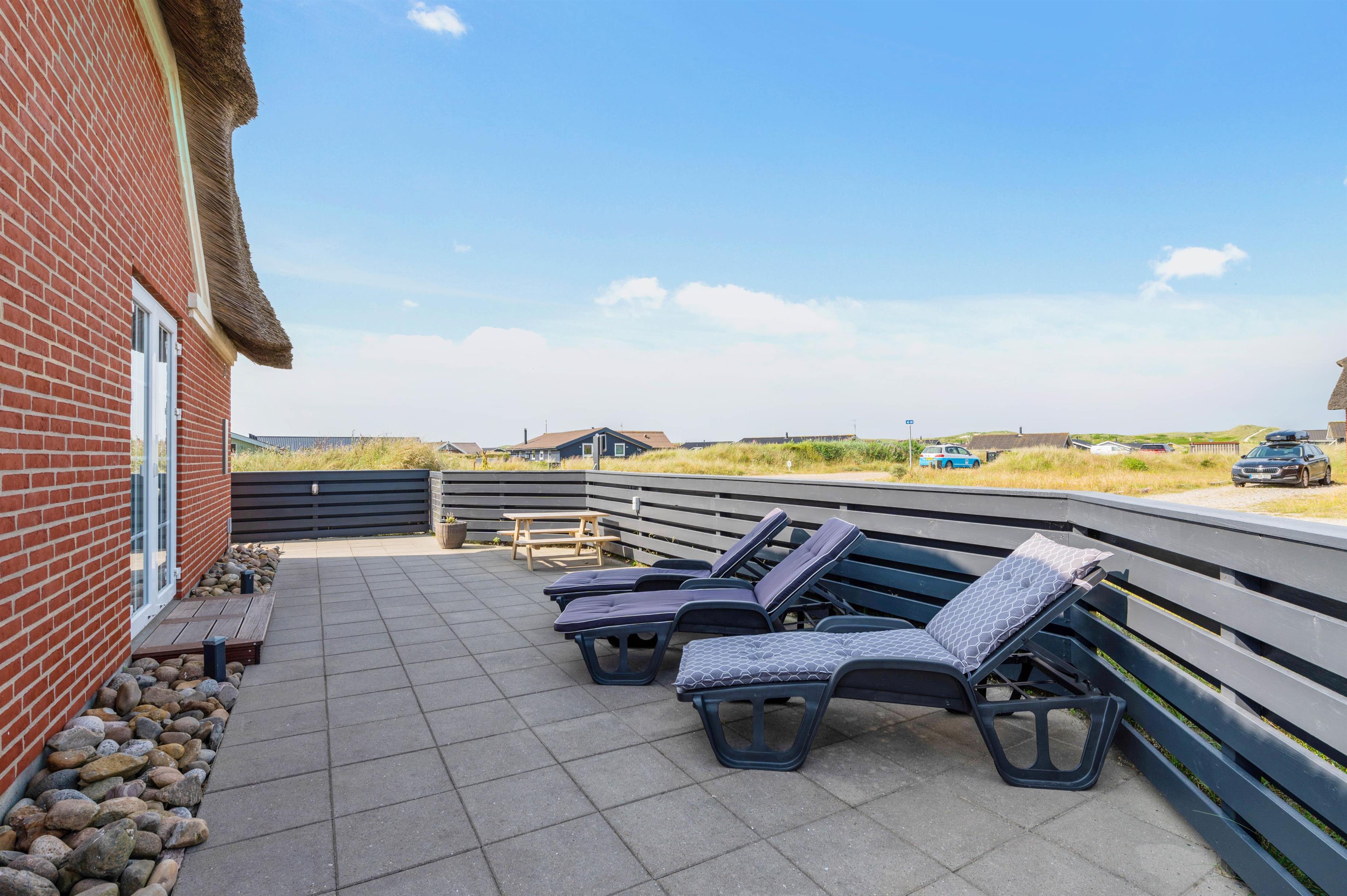 The outdoor area features an enclosed terrace on three sides of the holiday home, offering beautiful views over the surrounding heathland and dunes. The terrace provides various seating options and sun loungers - perfect for relaxing with a drink while enjoying the fresh sea air.