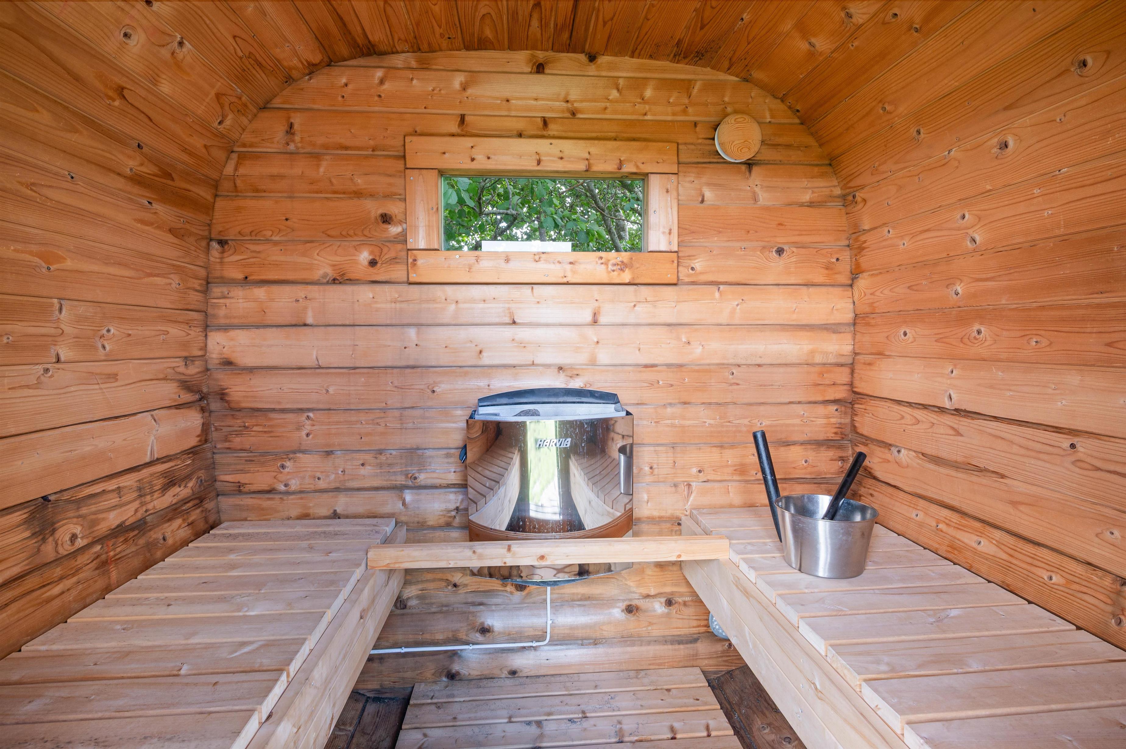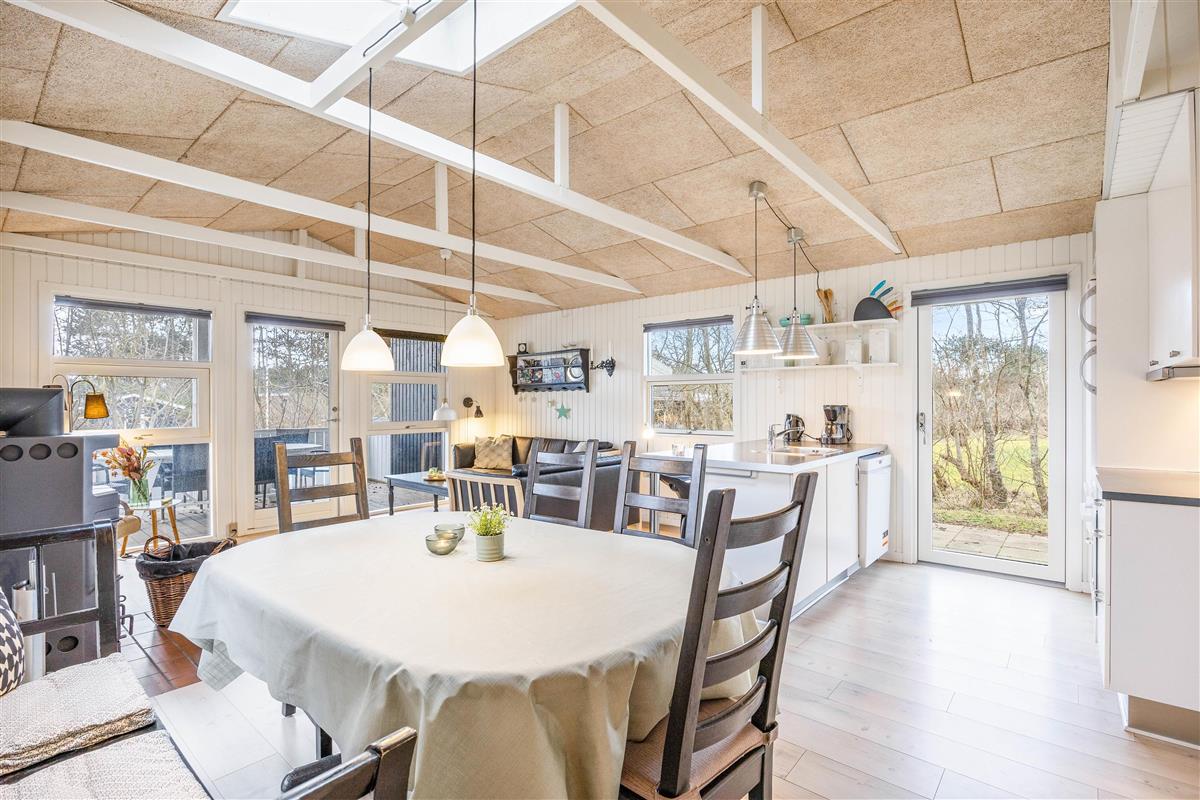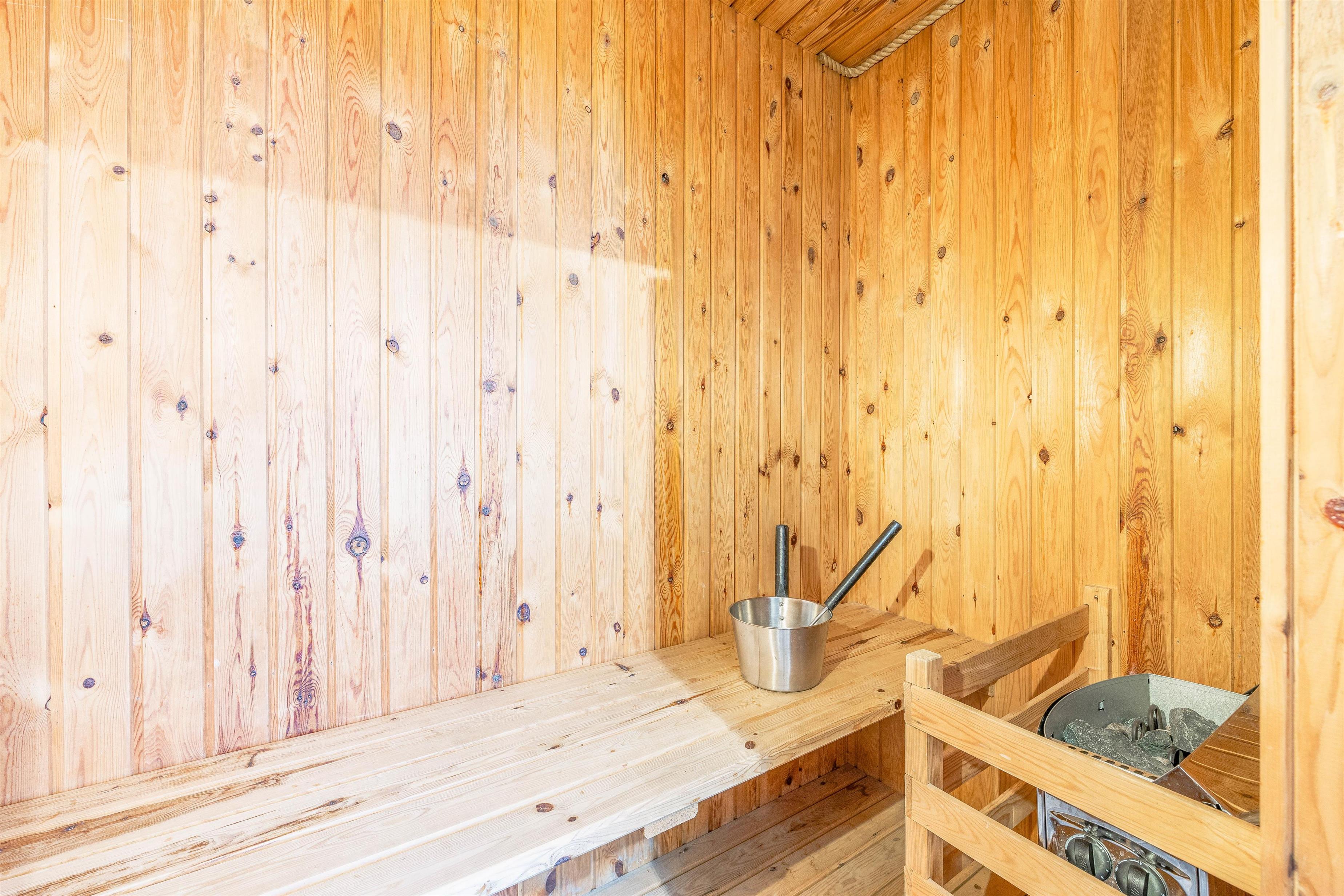 The dining table with kitchen bench adds to the cosy atmosphere, where some can enjoy board games while others relax on the sofa with a good book or film. The practical bathroom features underfloor heating and a sauna where you can truly unwind. The holiday home also includes a washing machine and tumble dryer, ensuring fresh laundry throughout your stay.