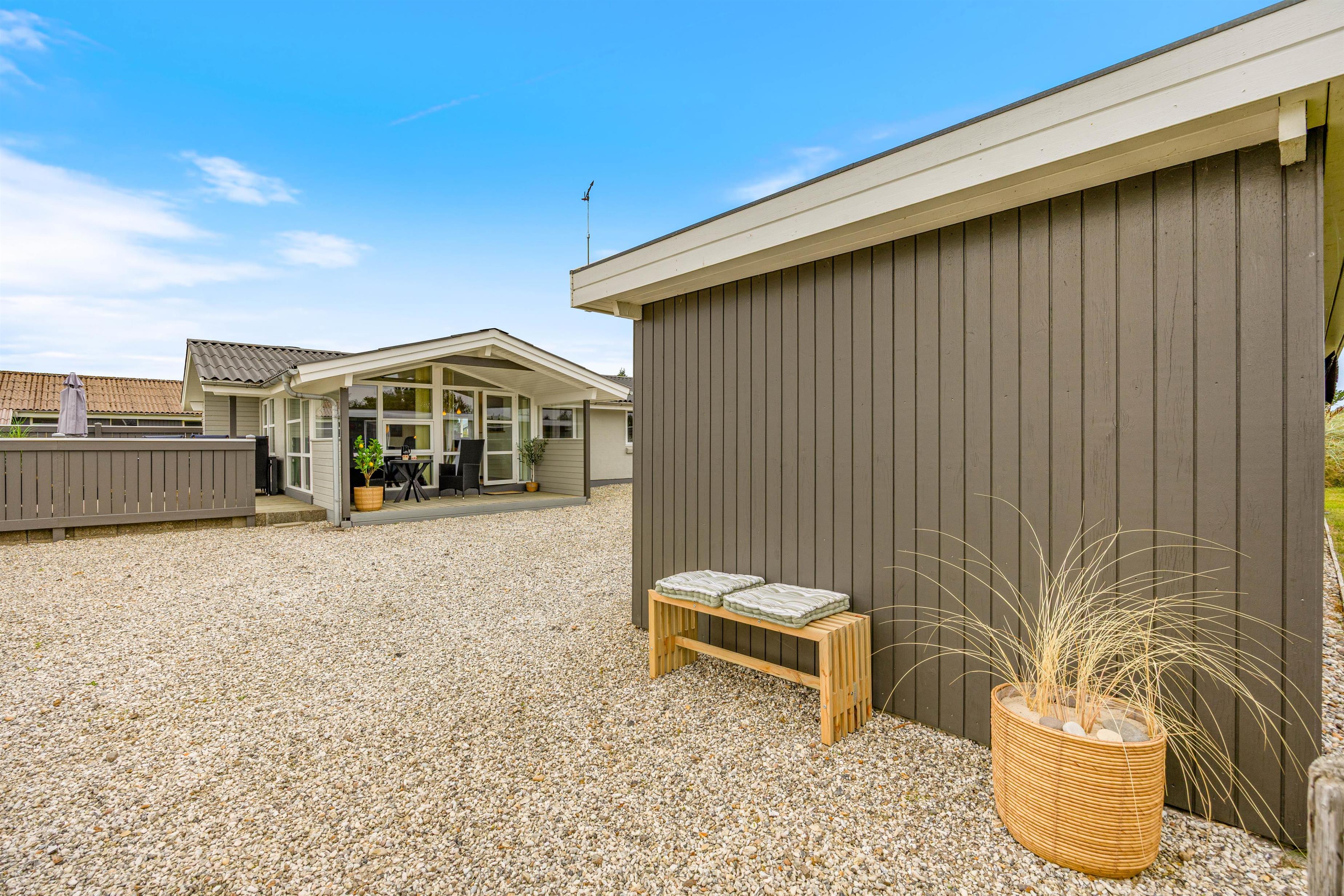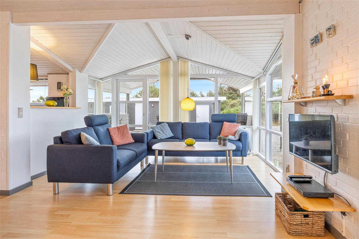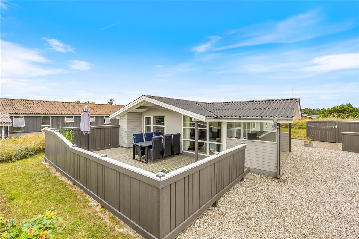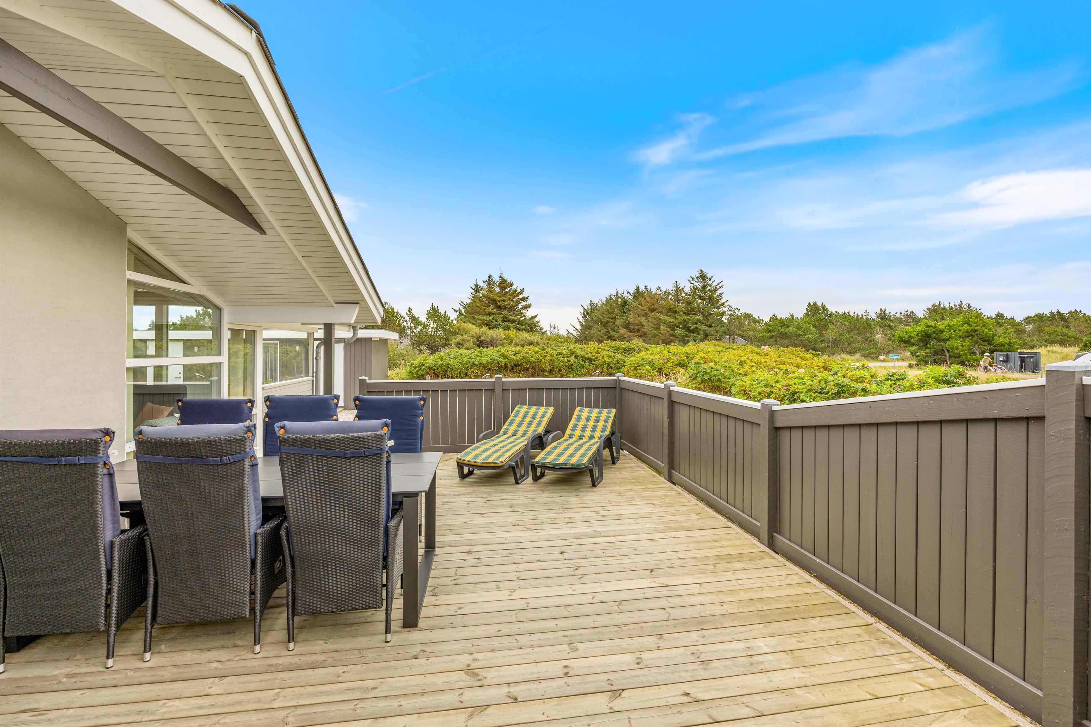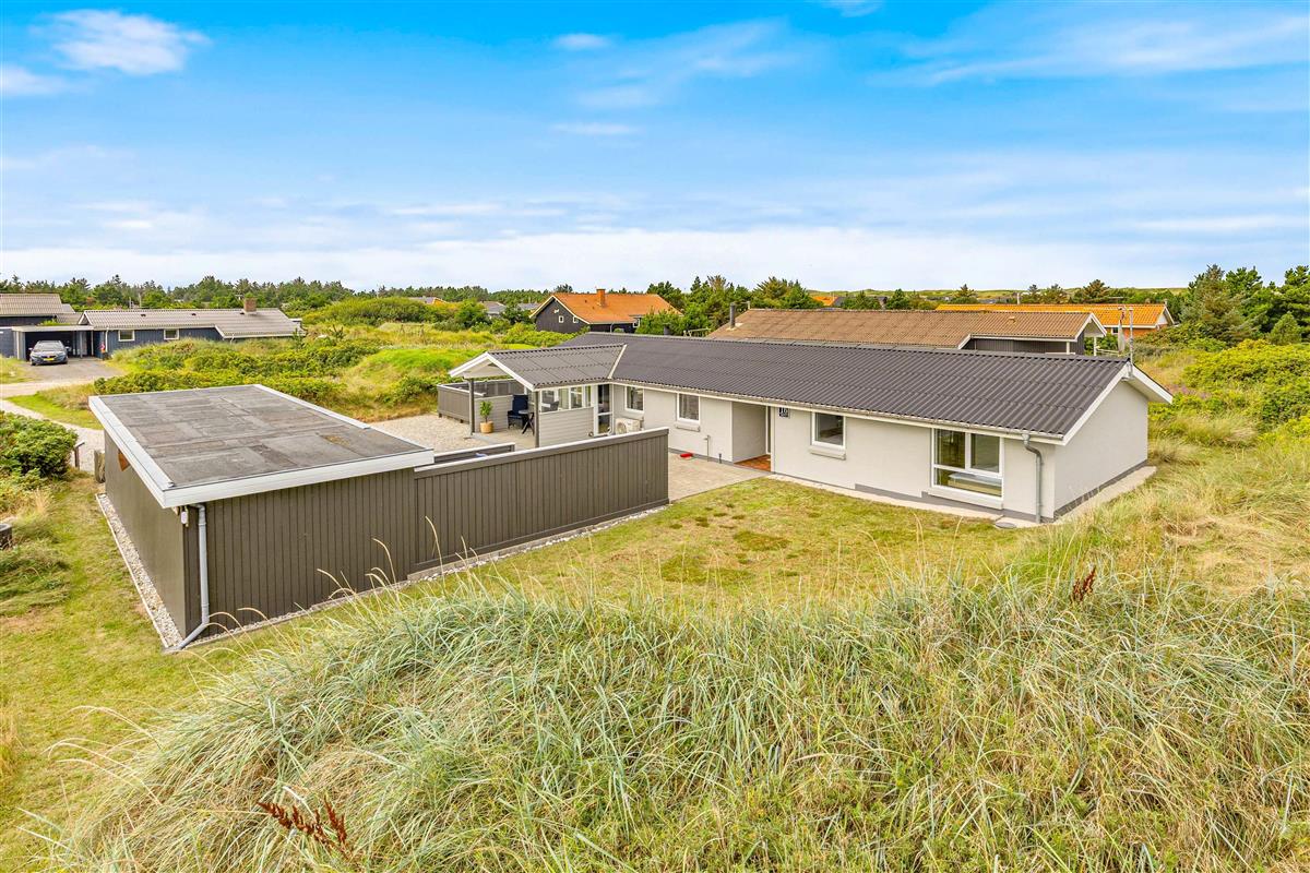 Direkt vom Wohnzimmer aus betretet ihr die abgeschirmte Terrasse, die euch windgeschützt und sonnig zugleich empfängt – der perfekte Ort für den ersten Kaffee am Morgen oder ein ruhiges Abendessen an der frischen Luft. Eine zweite, überdachte Terrasse bietet zusätzlichen Raum im Freien und lädt auch dann zum Verweilen ein, wenn das Wetter einmal nicht mitspielt. Rund um das Ferienhaus erwartet euch ein Naturgrundstück, das zum Spielen, Entdecken oder einfach zum Durchatmen einlädt – mit dem Duft von Heide und der typischen Landschaft der dänischen Westküste als stimmungsvolle Begleitung.
