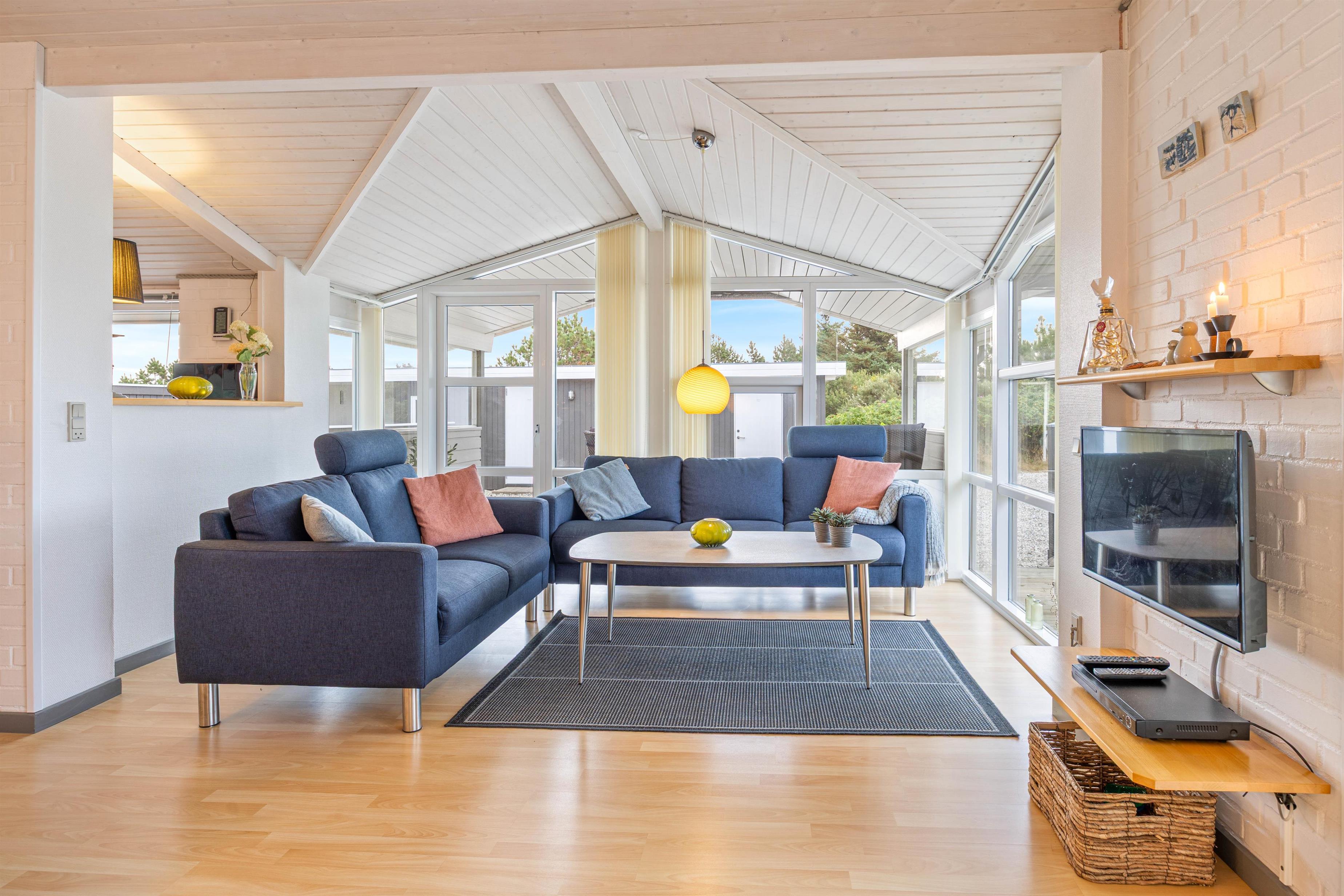 Sobald ihr die Tür öffnet, empfängt euch ein lichtdurchfluteter Wohnbereich, in dem ein knisternder Kaminofen für Hygge-Atmosphäre sorgt. Auf der gemütlichen Sofalandschaft könnt ihr es euch bequem machen und den Blick durch die großen Fenster in die umliegende Dünenlandschaft schweifen lassen – ein perfekter Ort zum Entspannen nach einem Tag an der frischen Luft.