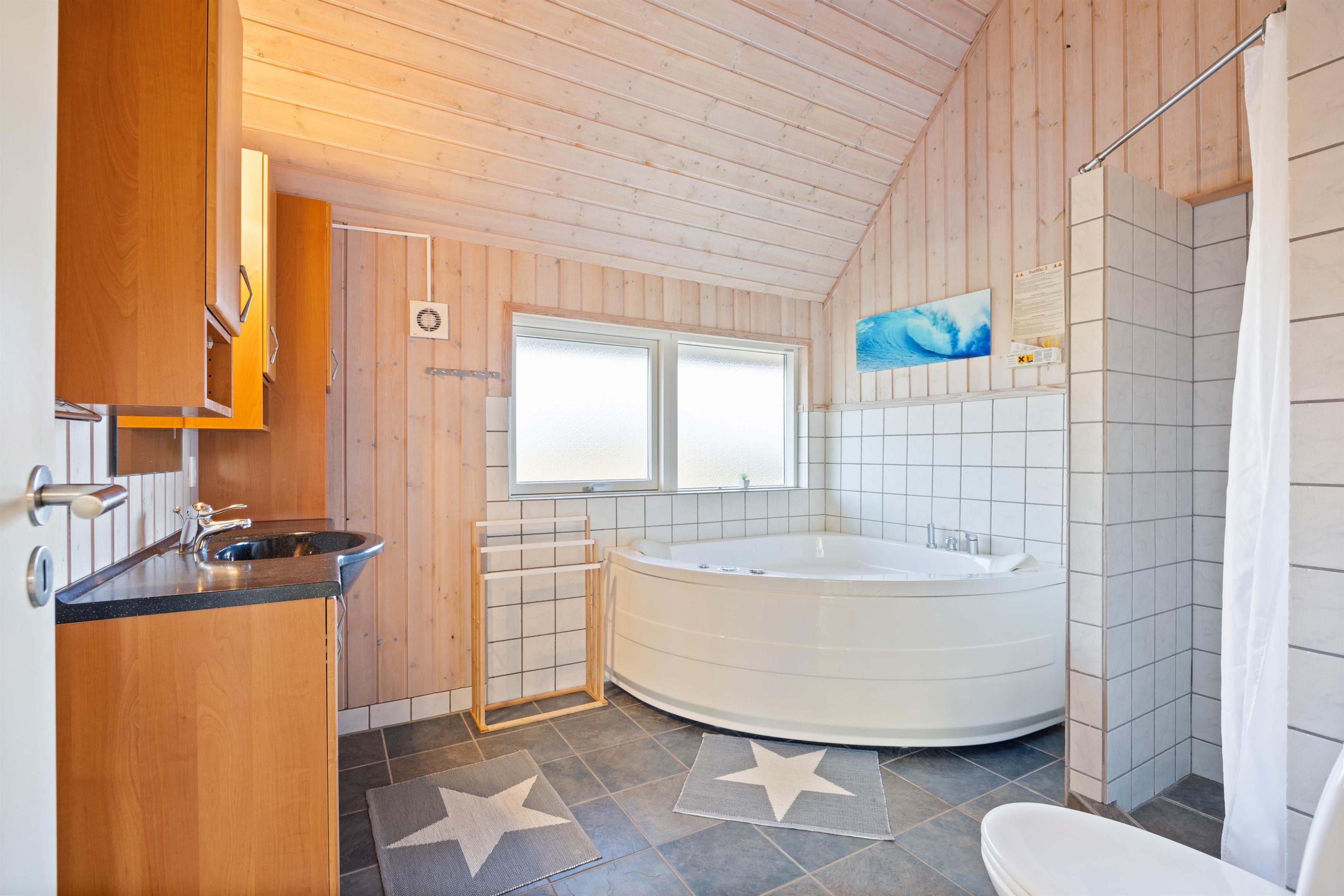Both bathrooms include a WC, shower and underfloor heating. The larger bathroom features a whirlpool, perfect for relaxing after a long day exploring nature. The holiday home also comes equipped with a washing machine, tumble dryer and dishwasher, ensuring you'll always have clean, dry clothes and won't need to worry about washing up.
