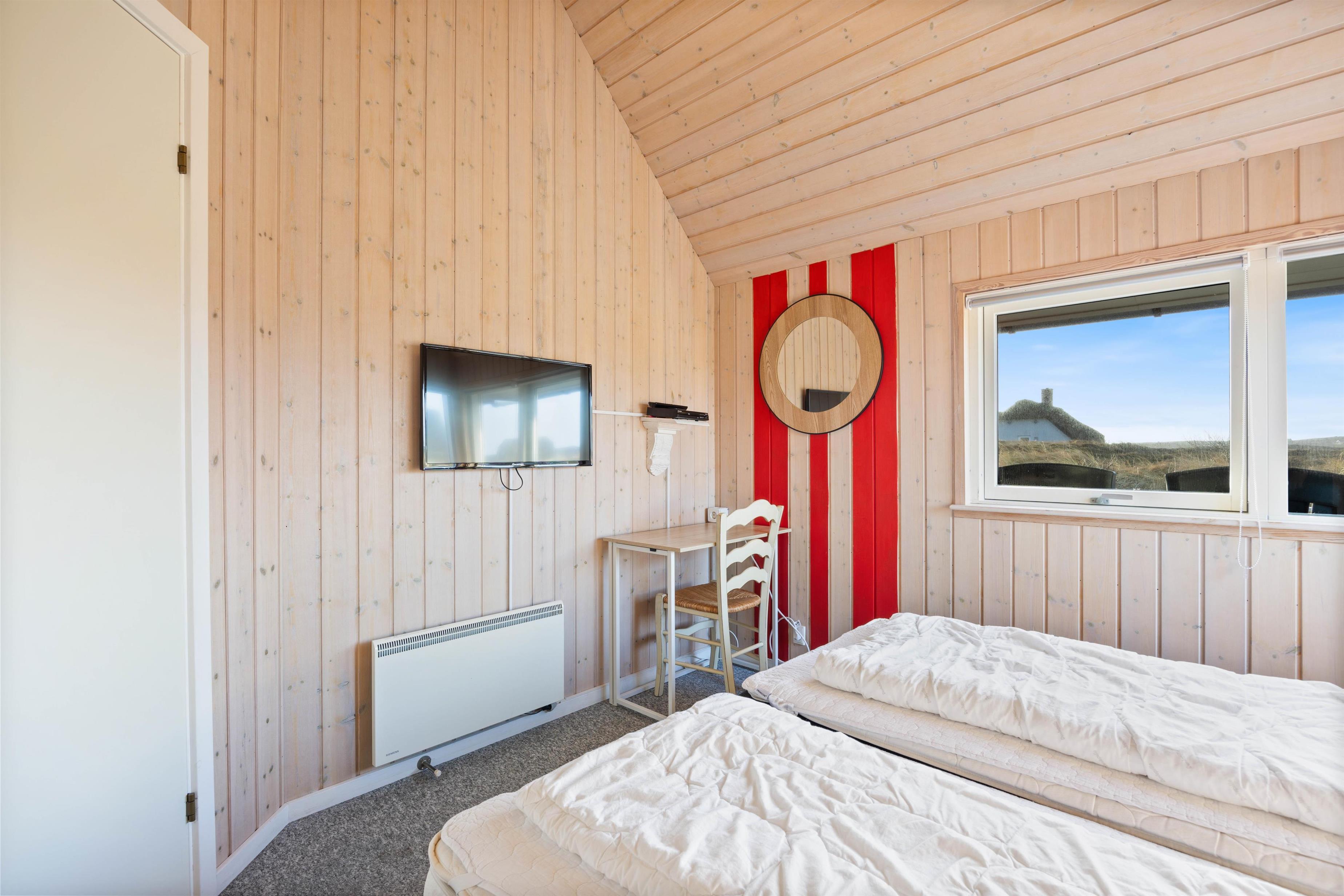 From the large living area and south-facing terrace, you'll enjoy beautiful views across the heath to the dunes. Here you can curl up on the comfortable sofa, light the wood-burning stove, and enjoy time with family and friends. This welcoming holiday home features 4 bedrooms and a bathroom on each side of the living room.