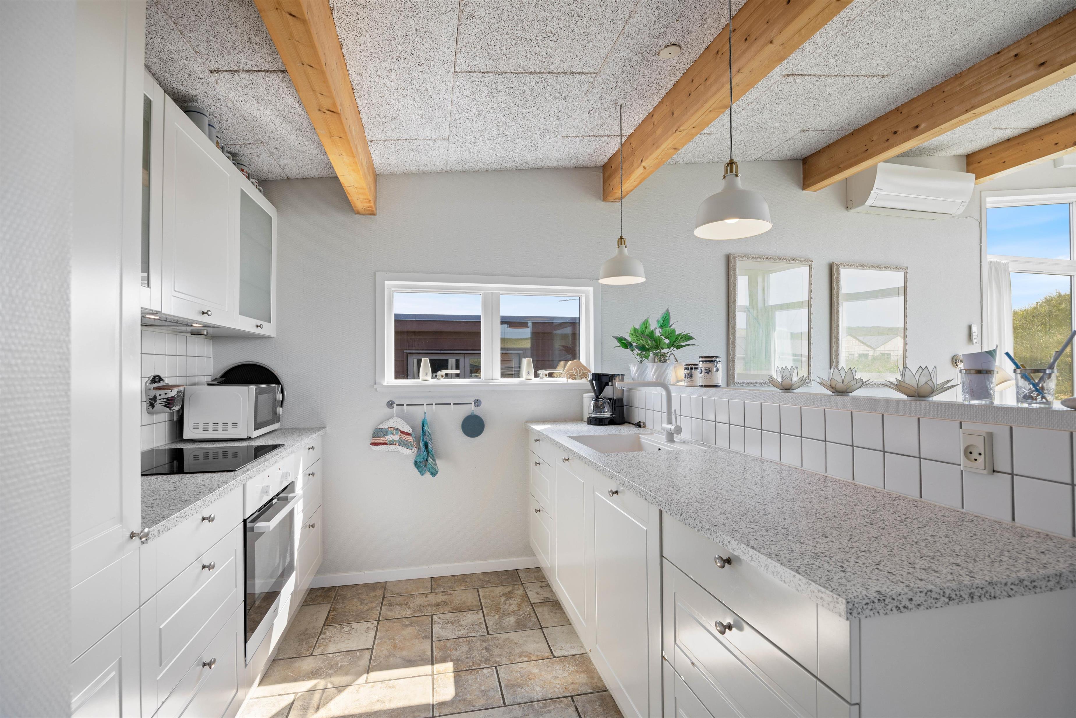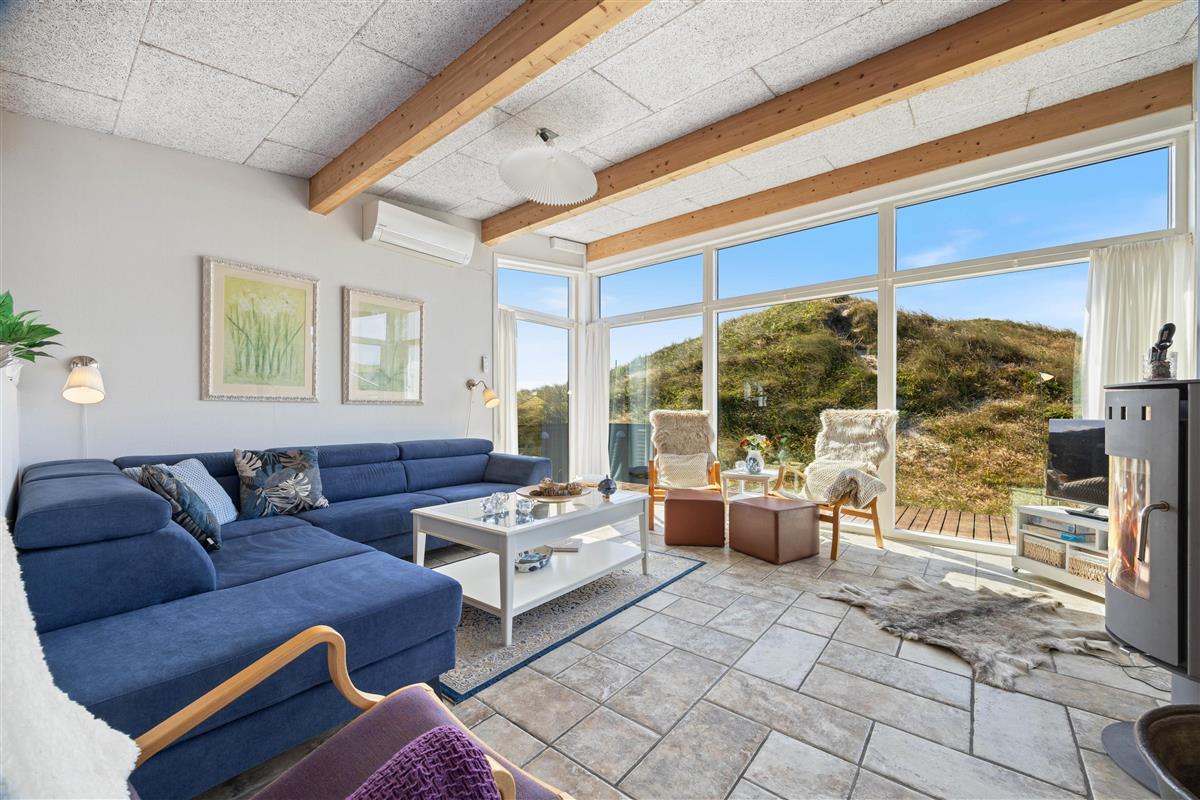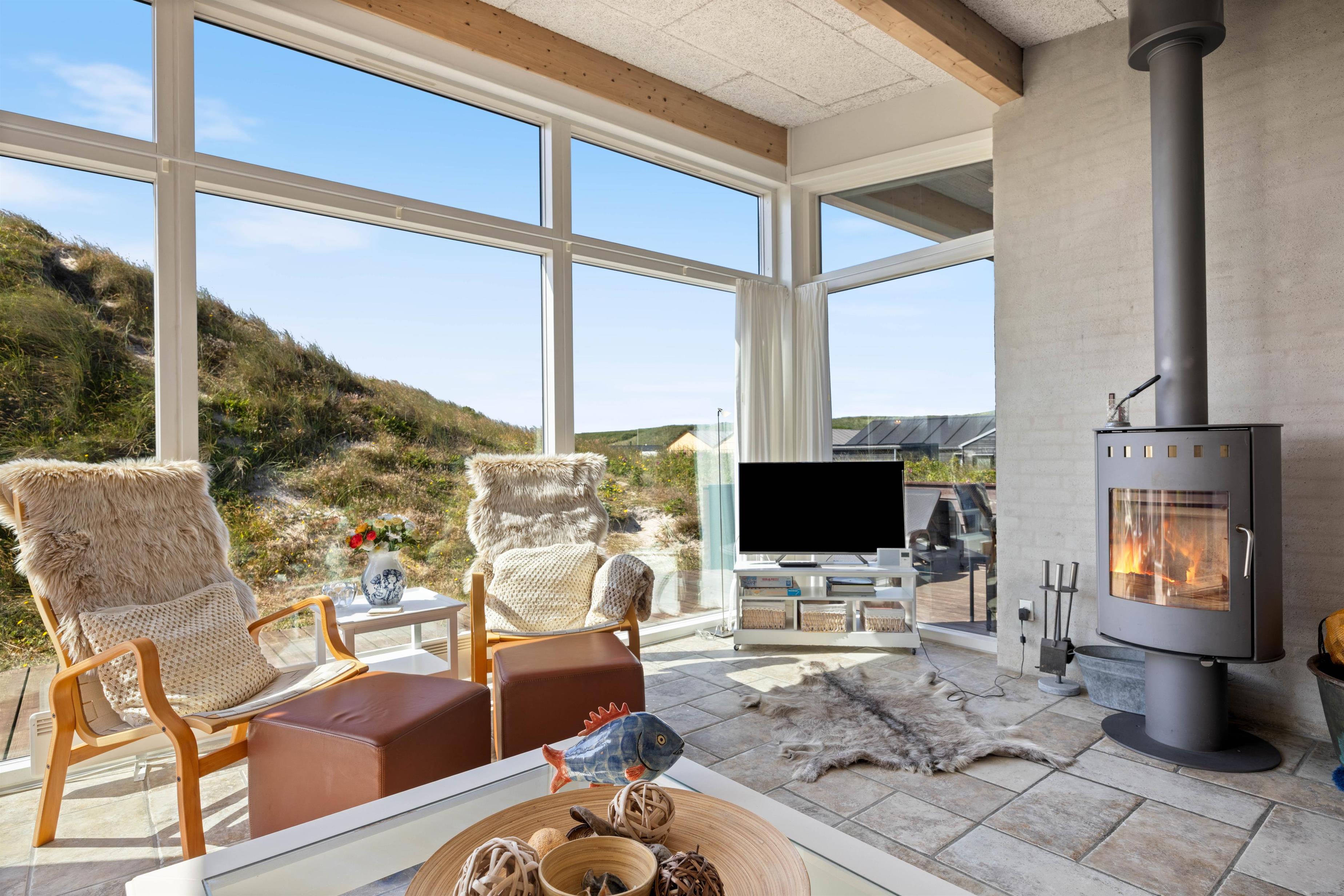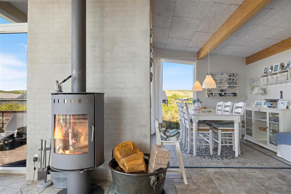 A few steps separate the living and sleeping areas. The light-filled open-plan living and dining area with open kitchen sits on the upper level. Here too, great attention has been paid to stylish, coordinated furnishings. Relax on the comfortable sofa for evening television, while enjoying unique views across the dunes. A crackling wood-burning stove provides that cosy Danish 'hygge' feeling. For energy-efficient heating, there's also a heat pump.