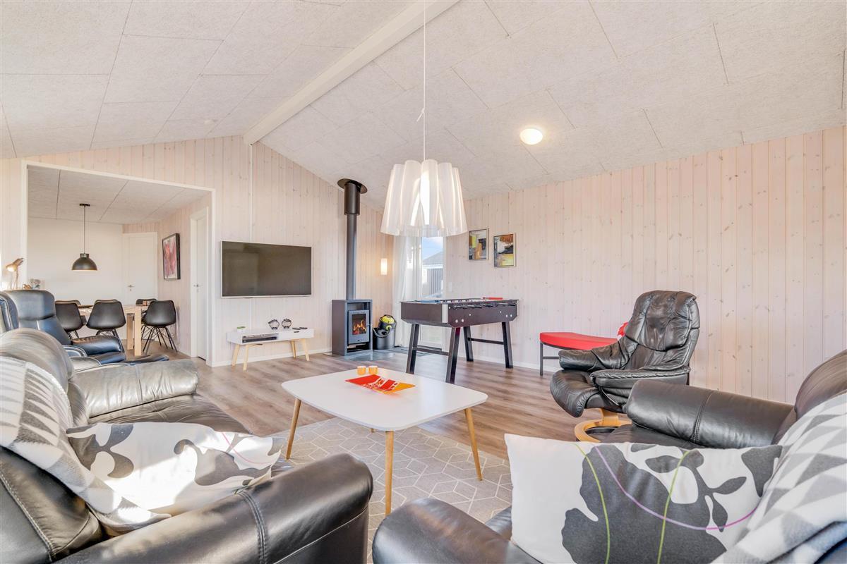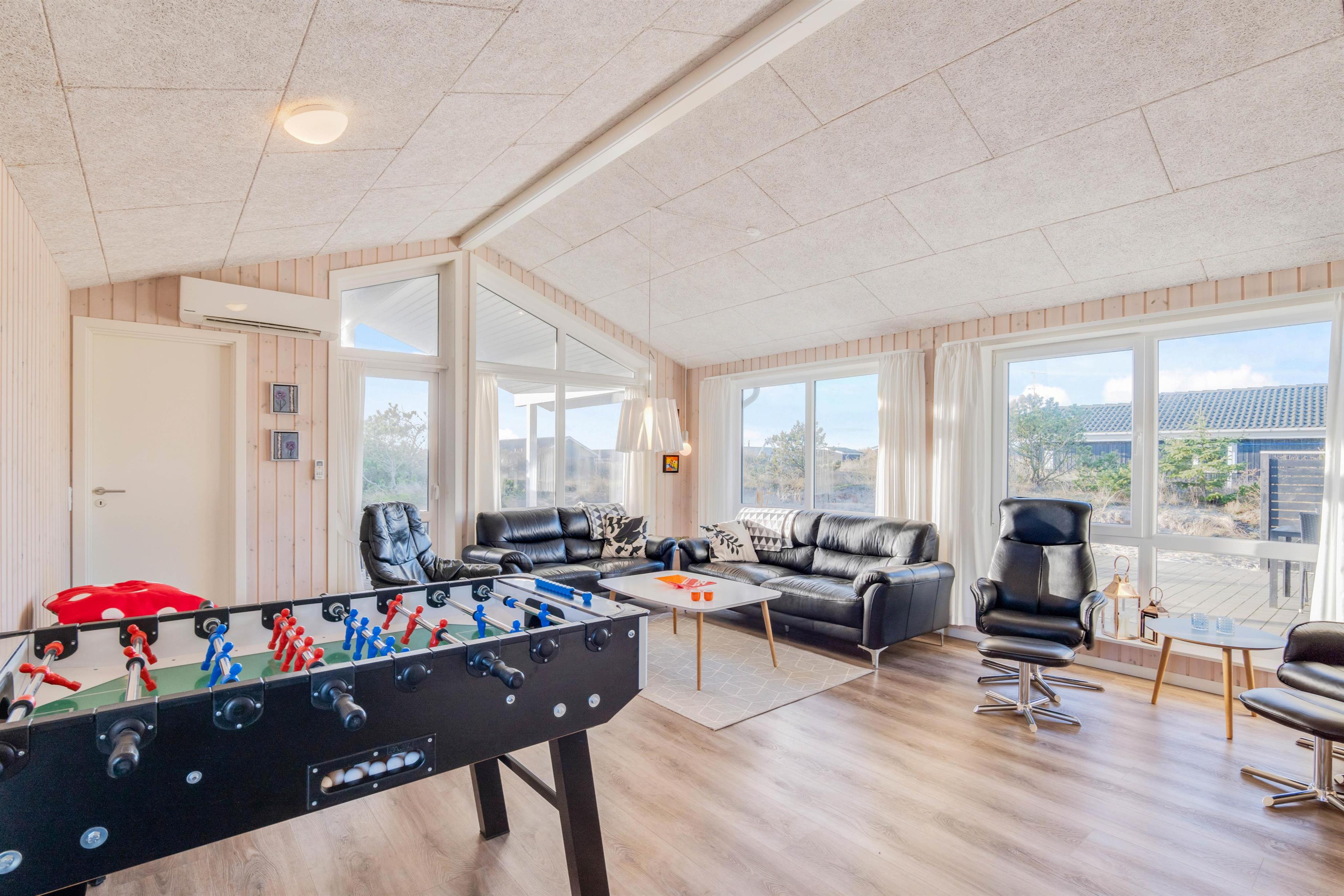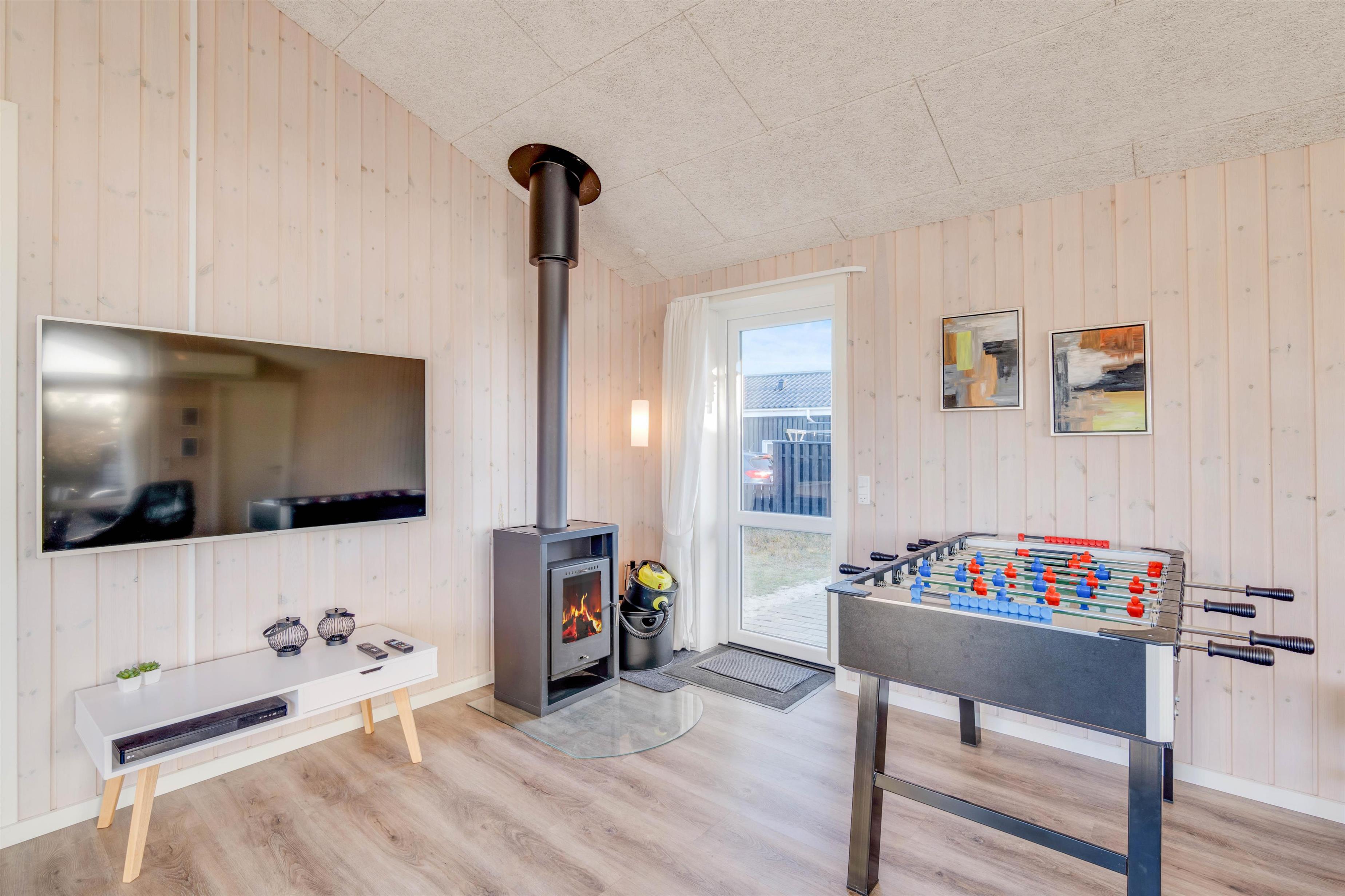 The living area features high ceilings and large windows, creating a bright and welcoming space, while the wood-burning stove adds extra Danish 'hygge' comfort. Spend sociable evenings with the whole family, whether enjoying a DVD night in the comfortable TV corner or challenging each other to a game of table football.