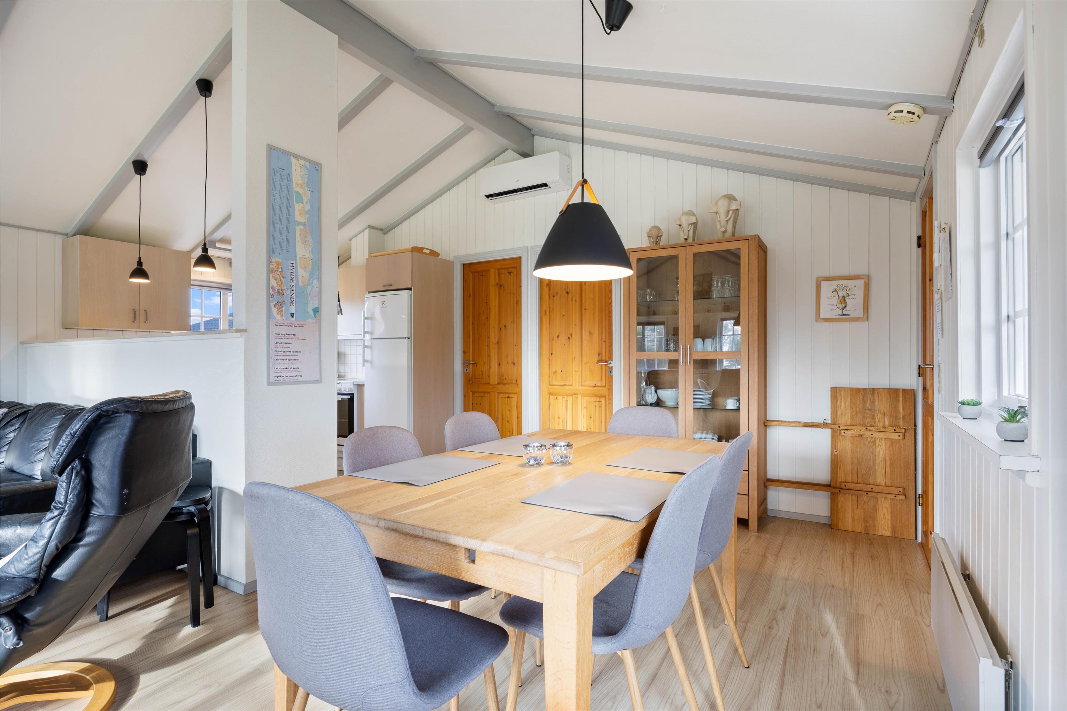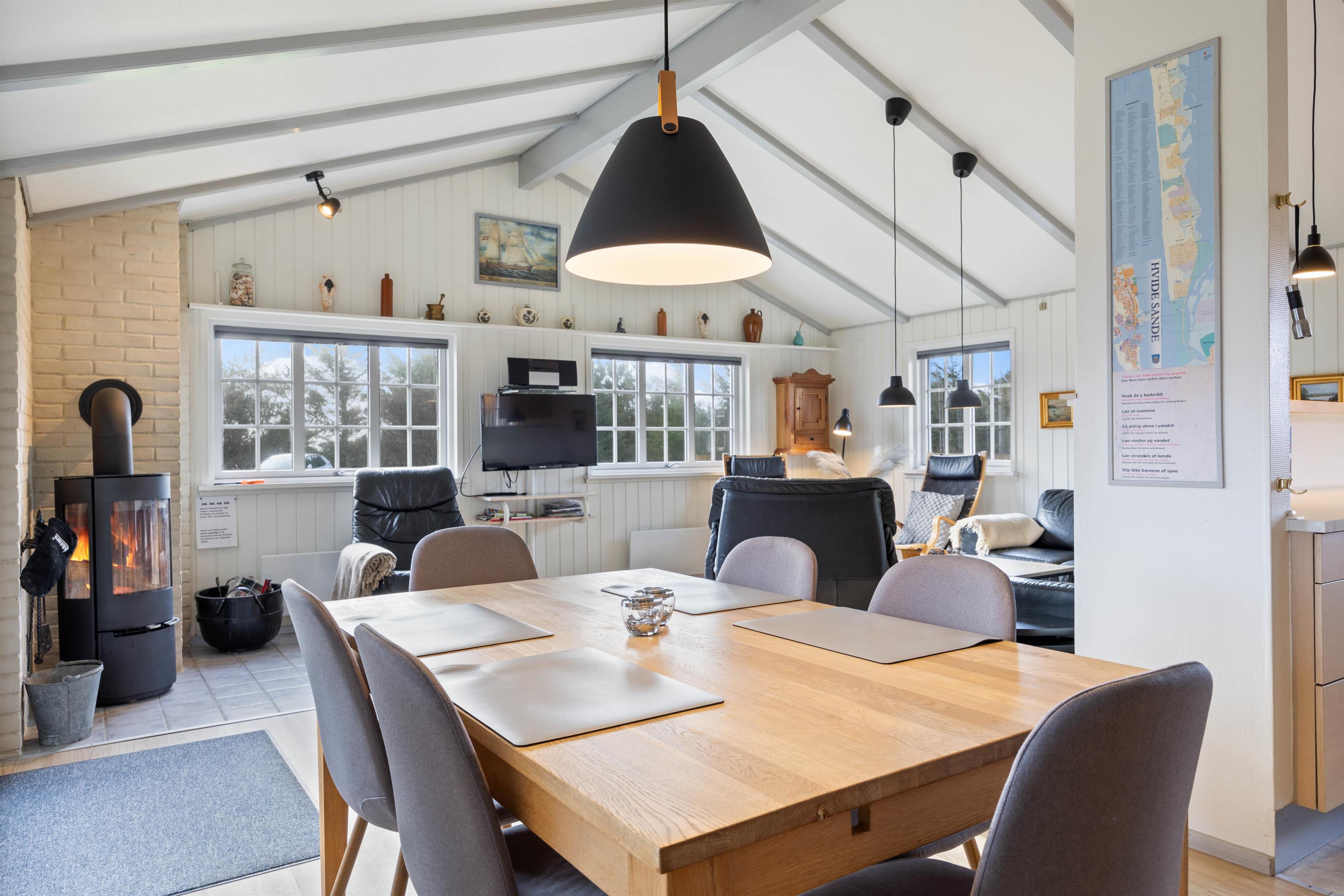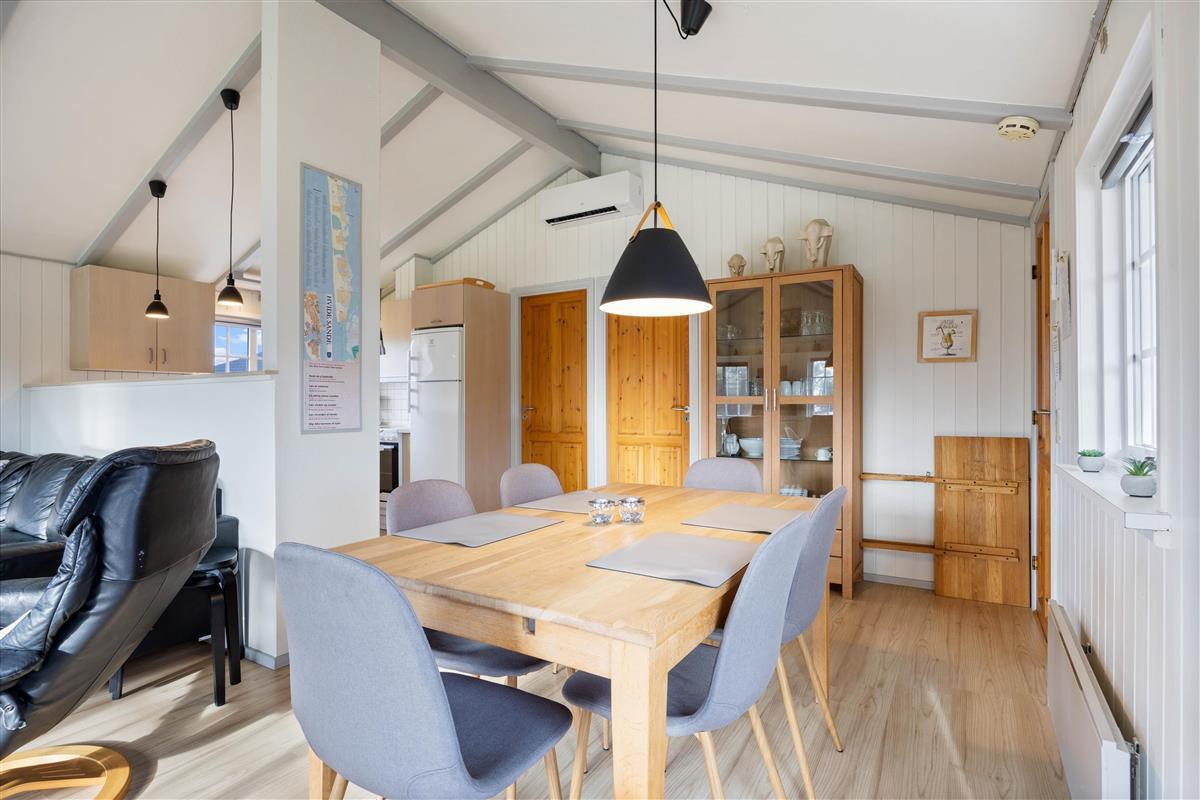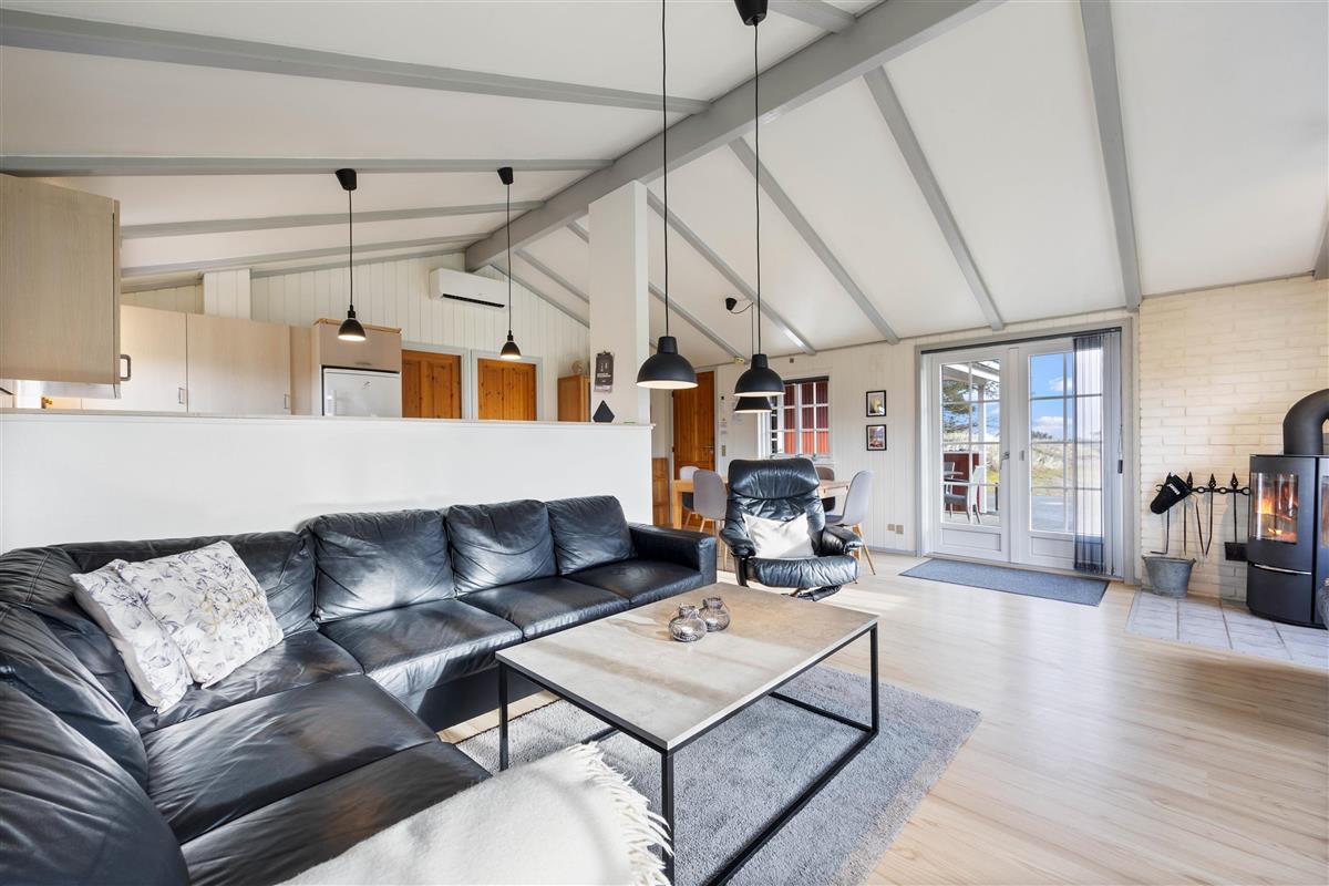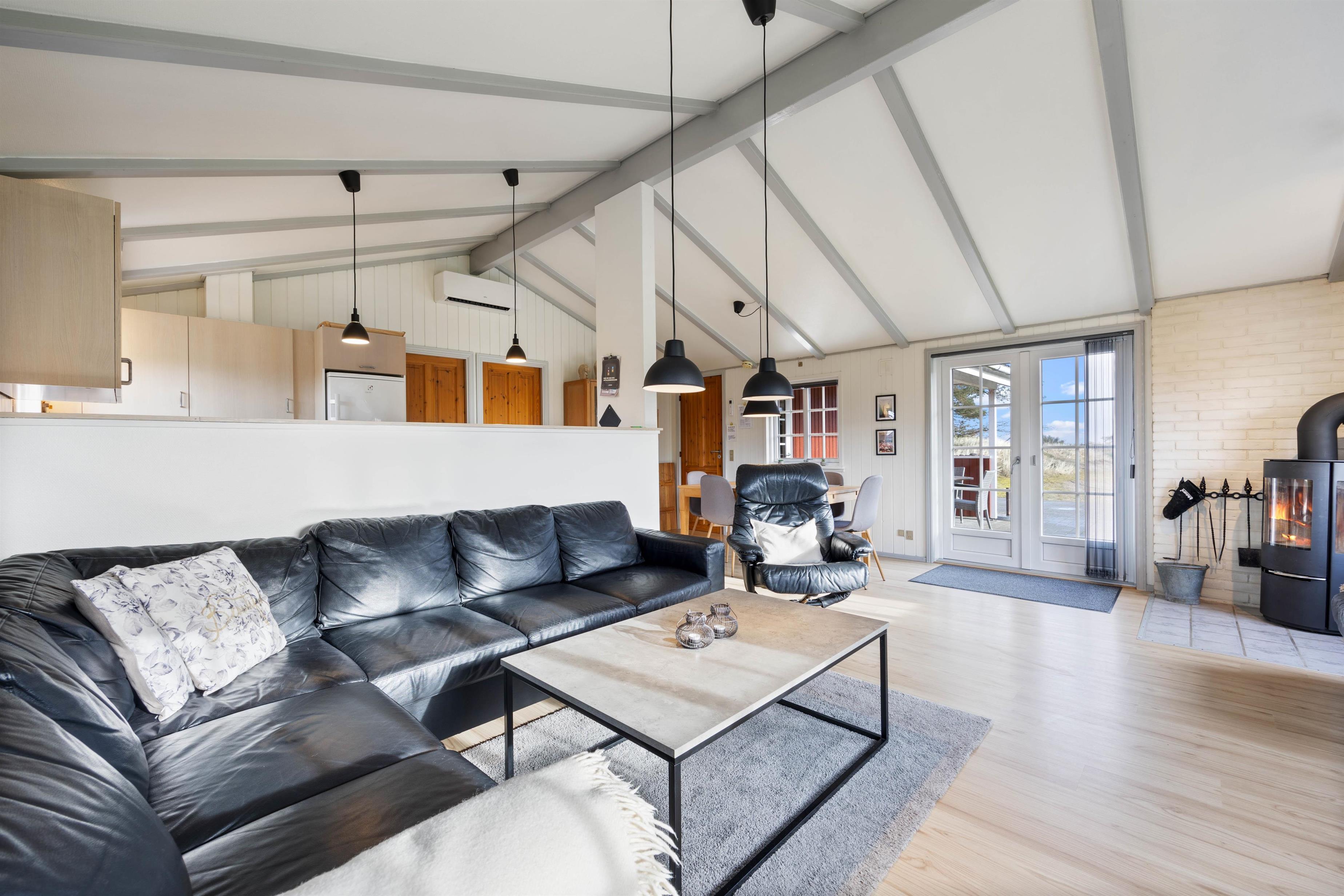 This holiday home features a spacious open-plan living area where you can spend quality time together. The living room, kitchen and dining area are combined in one space, allowing everyone to pursue different activities while remaining connected. Some can relax by the wood-burning stove and enjoy the views through the numerous windows, while others play board games at the dining table. Along with the stove, an energy-efficient heat pump provides heating throughout.