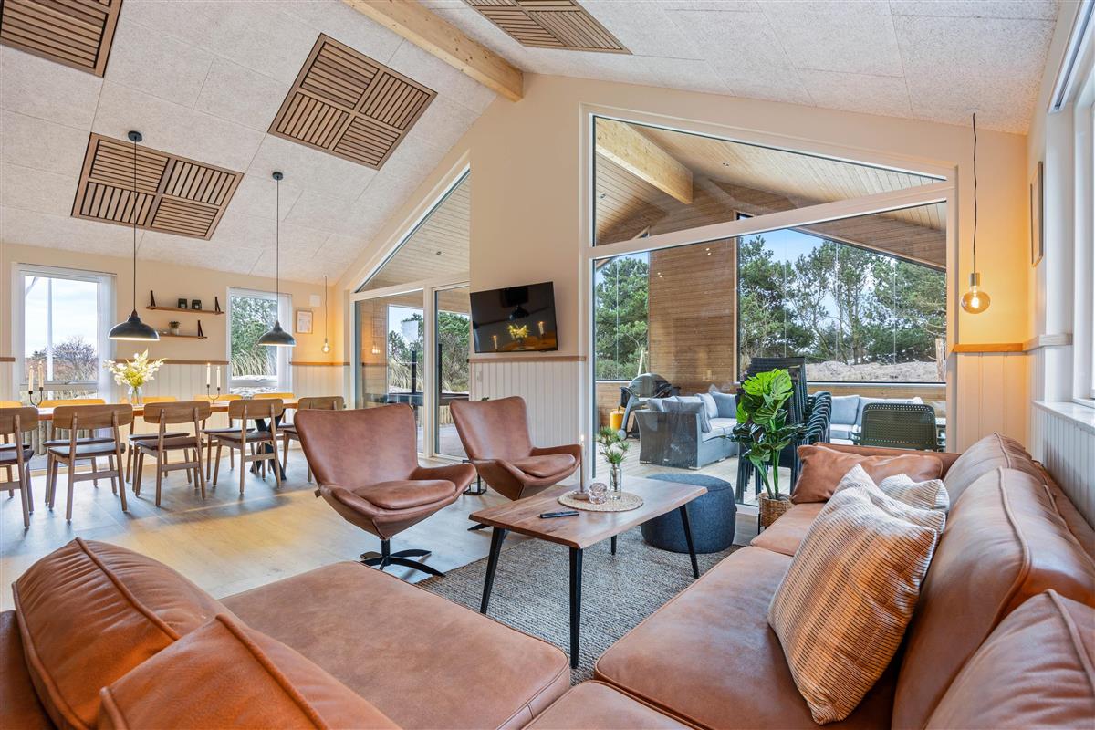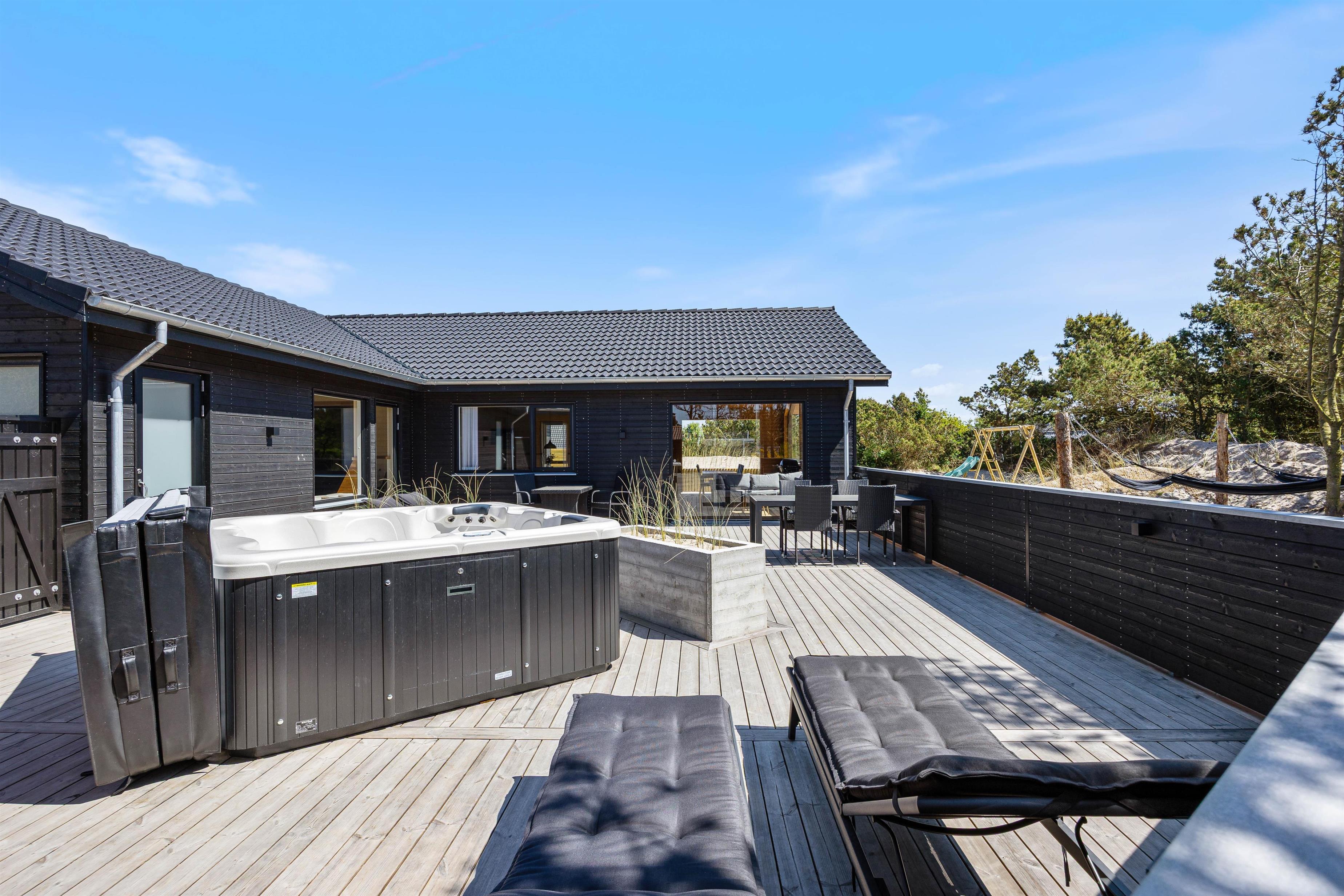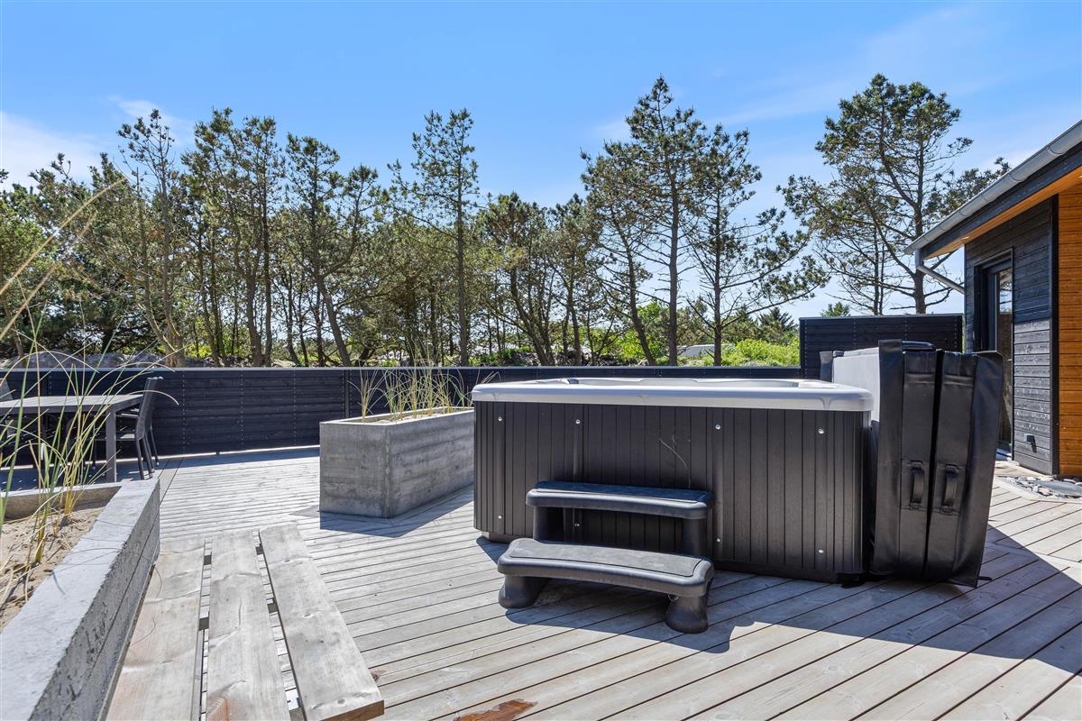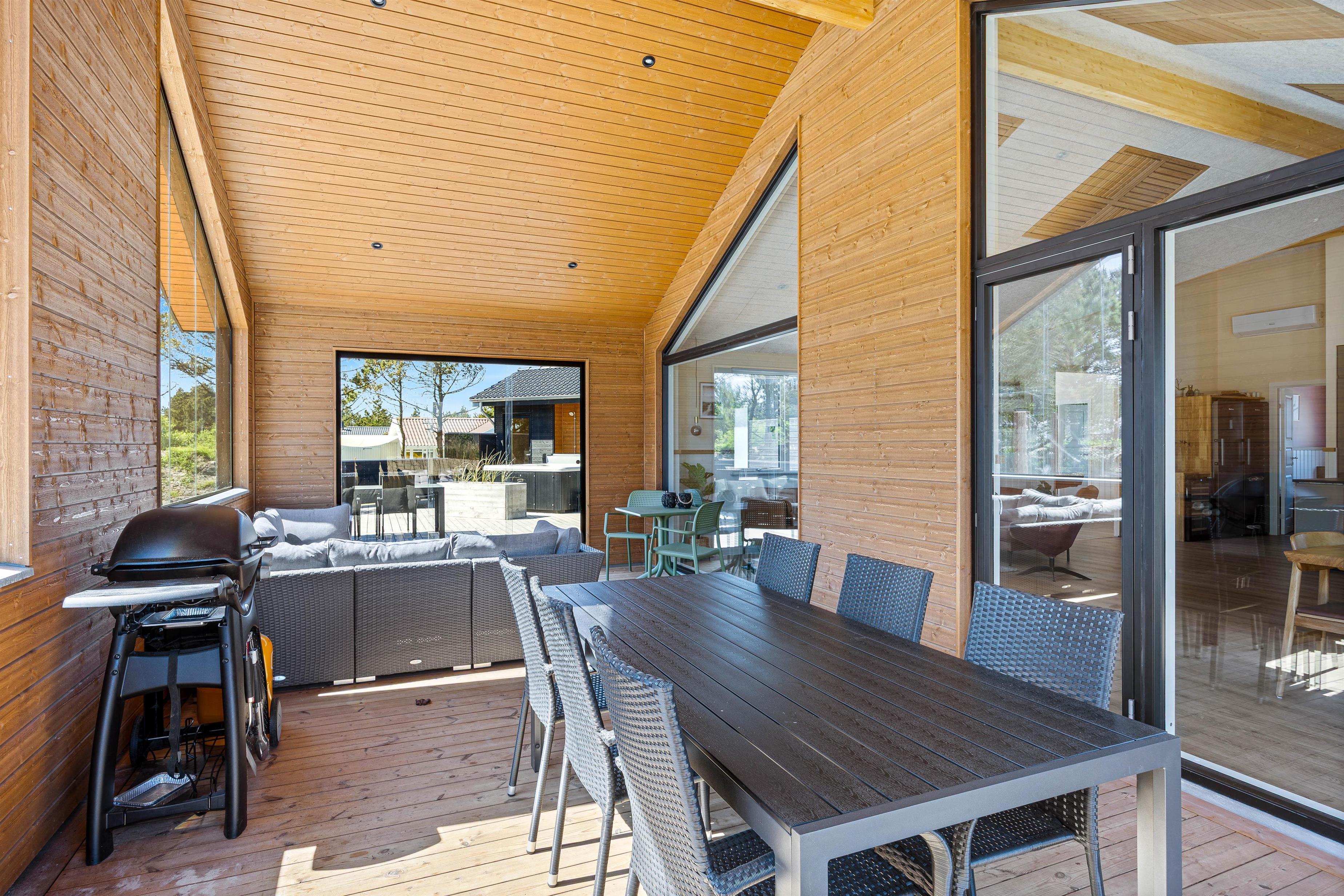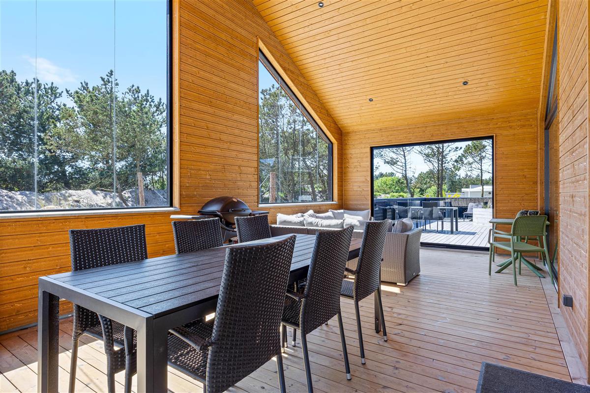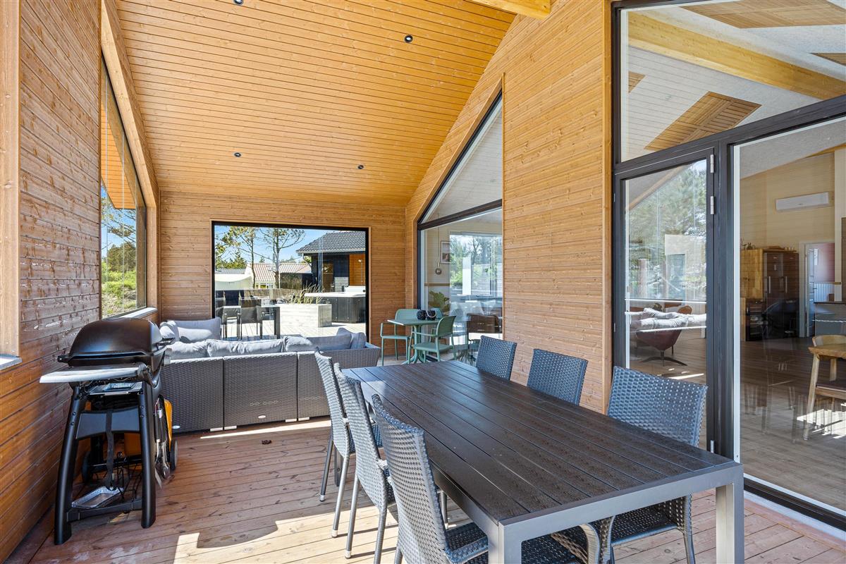 The holiday home at Bjerregårdsvej 57 is impressive both inside and out. Outside, you'll find a beautiful, enclosed, partially covered terrace area. Here, children and/or dogs can run freely while you relax in the sunshine, drink coffee, or read a good book. Garden furniture, sun loungers, and a gas barbecue are all provided!