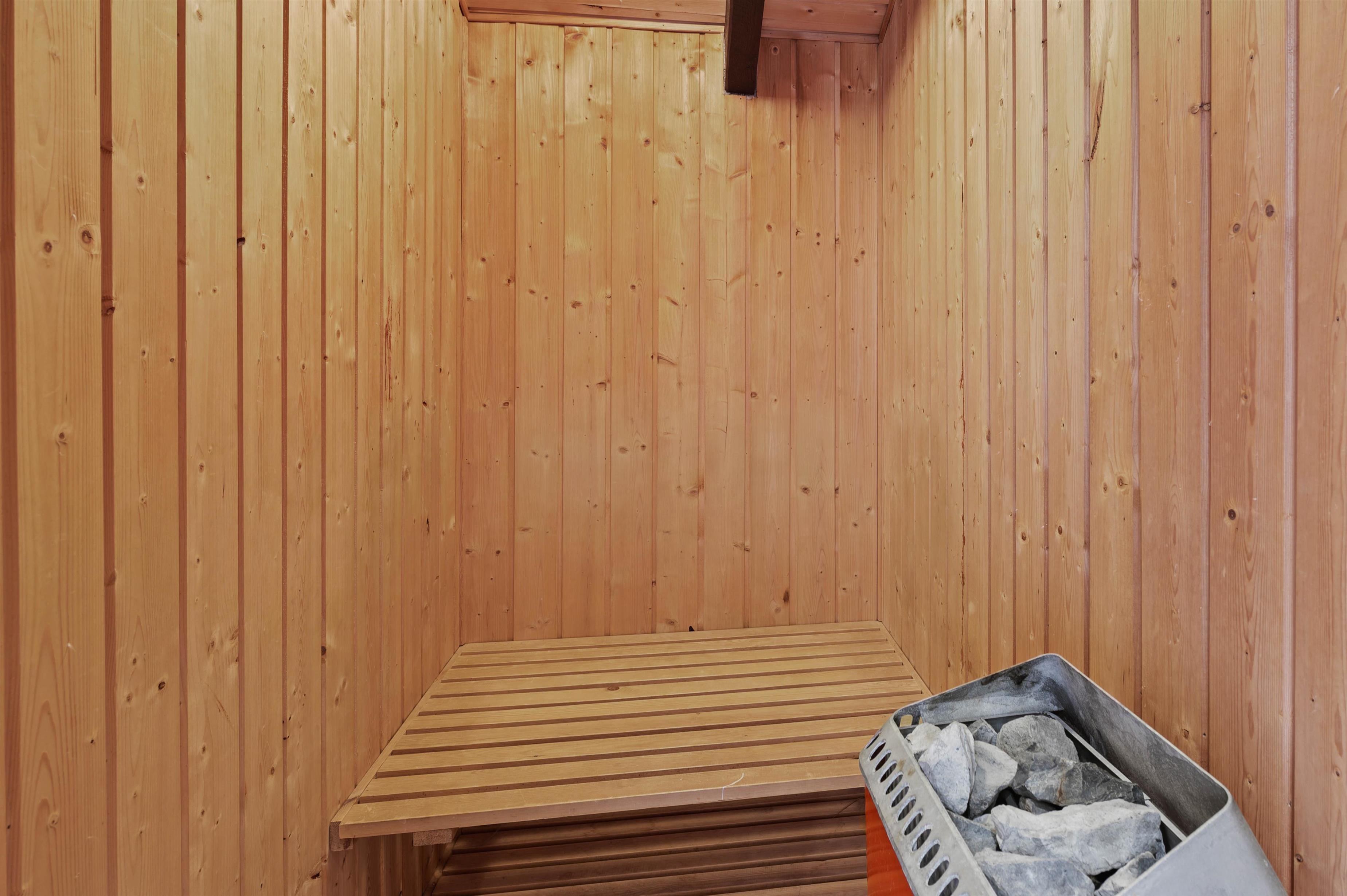The adjoining open-plan kitchen is practically equipped with everything needed for preparing delicious meals. Naturally, the integrated dishwasher takes care of the cleaning up, leaving you more time to relax. The brightly tiled bathroom features underfloor heating and connects to the sauna, where you can unwind in soothing warmth.