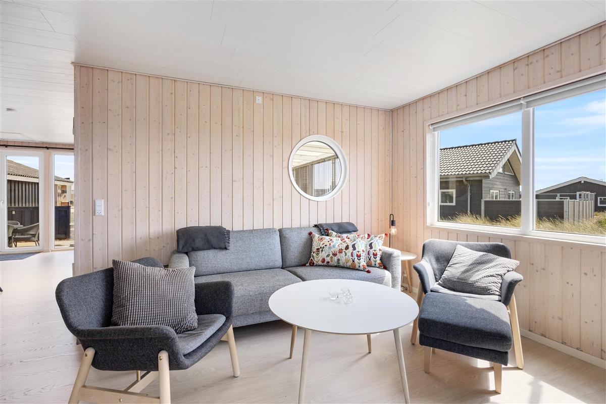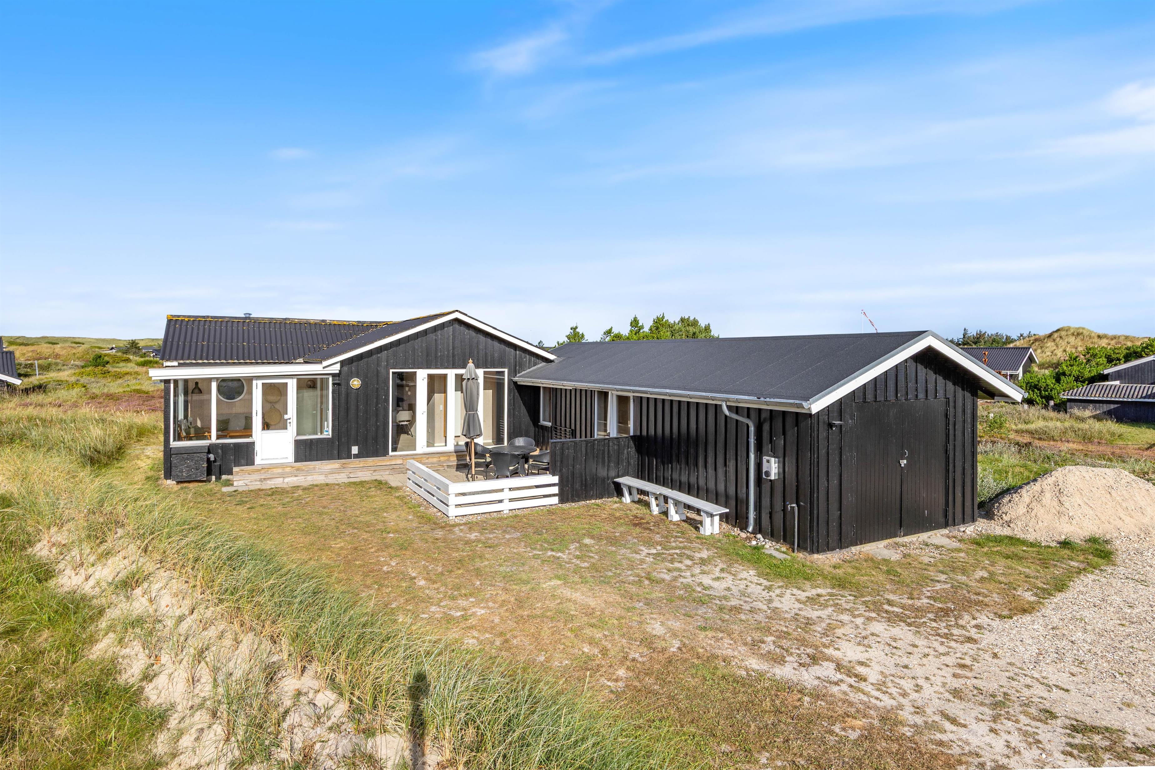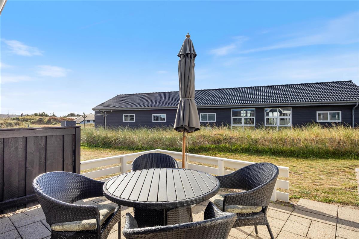 The approximately 1,300 m² natural plot offers plenty of space to unwind and soak up the sun. The open terrace is equipped with comfortable garden furniture – perfect for enjoying the fresh West Coast air. In the evening, you can fire up the grill and enjoy a glass of wine or a cold beer in good company.