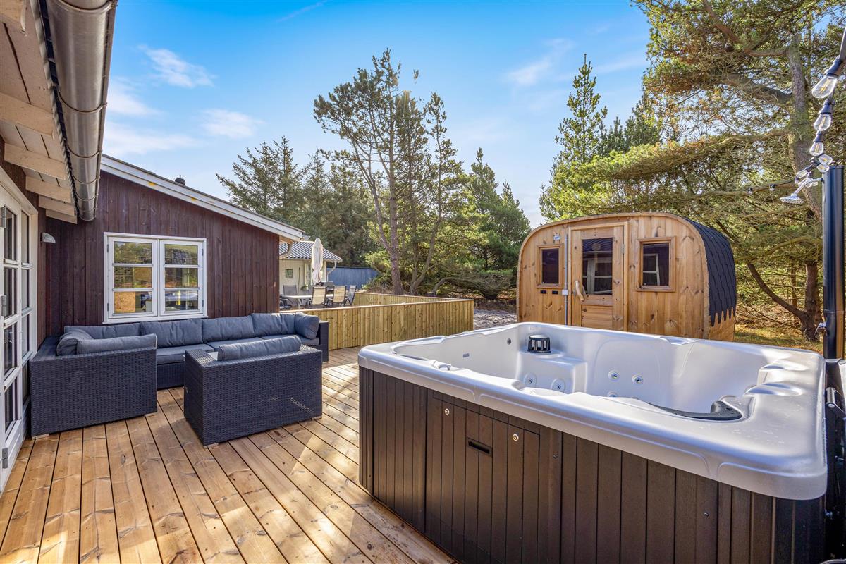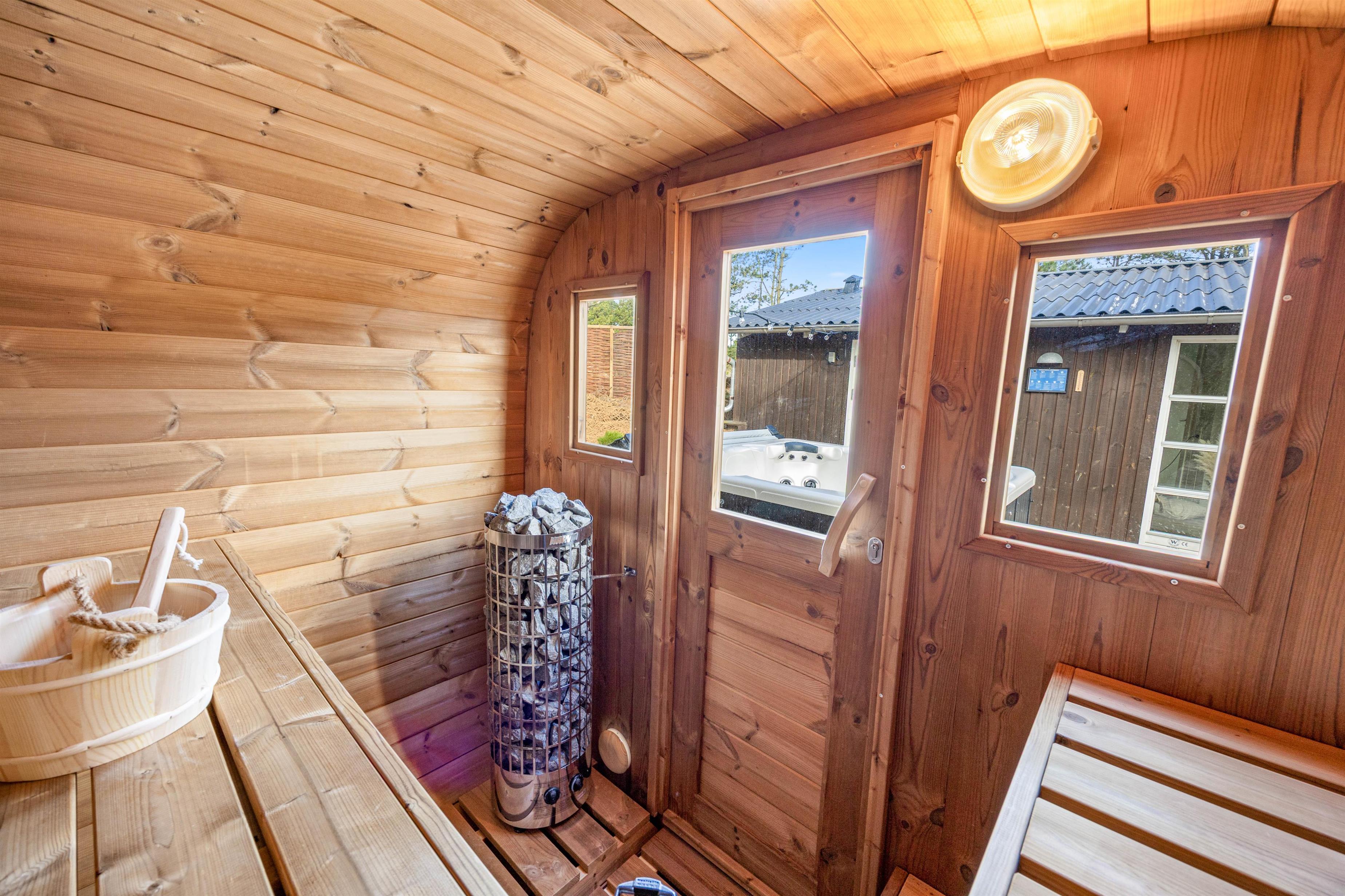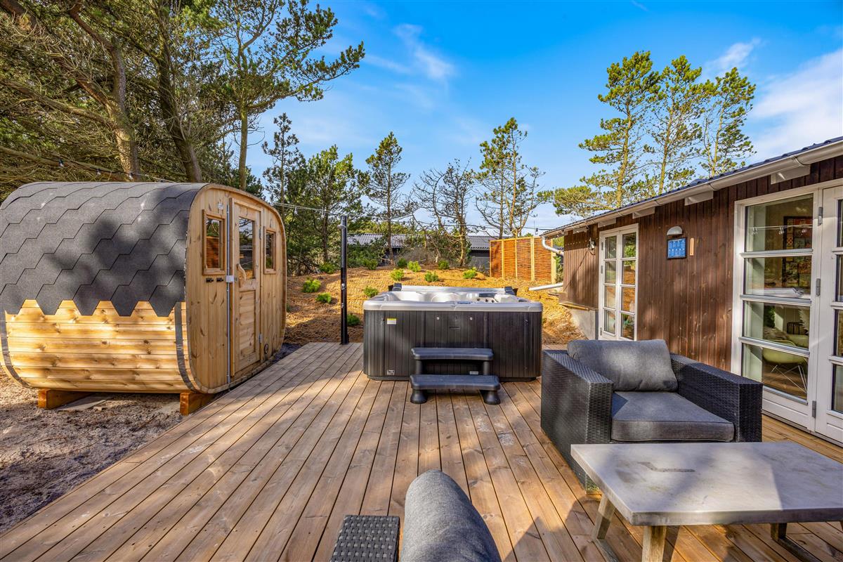 On the terraces, you can fully enjoy the natural surroundings and green environment, which invite both sunbathing and playing with the children. As an extra luxury, there is both an outdoor spa and an outdoor sauna, where you can completely relax and enjoy the holiday atmosphere – no matter the season. Thanks to the good screening from bushes and trees, you can enjoy your holiday undisturbed and spend long, cozy evenings grilling under the open sky.