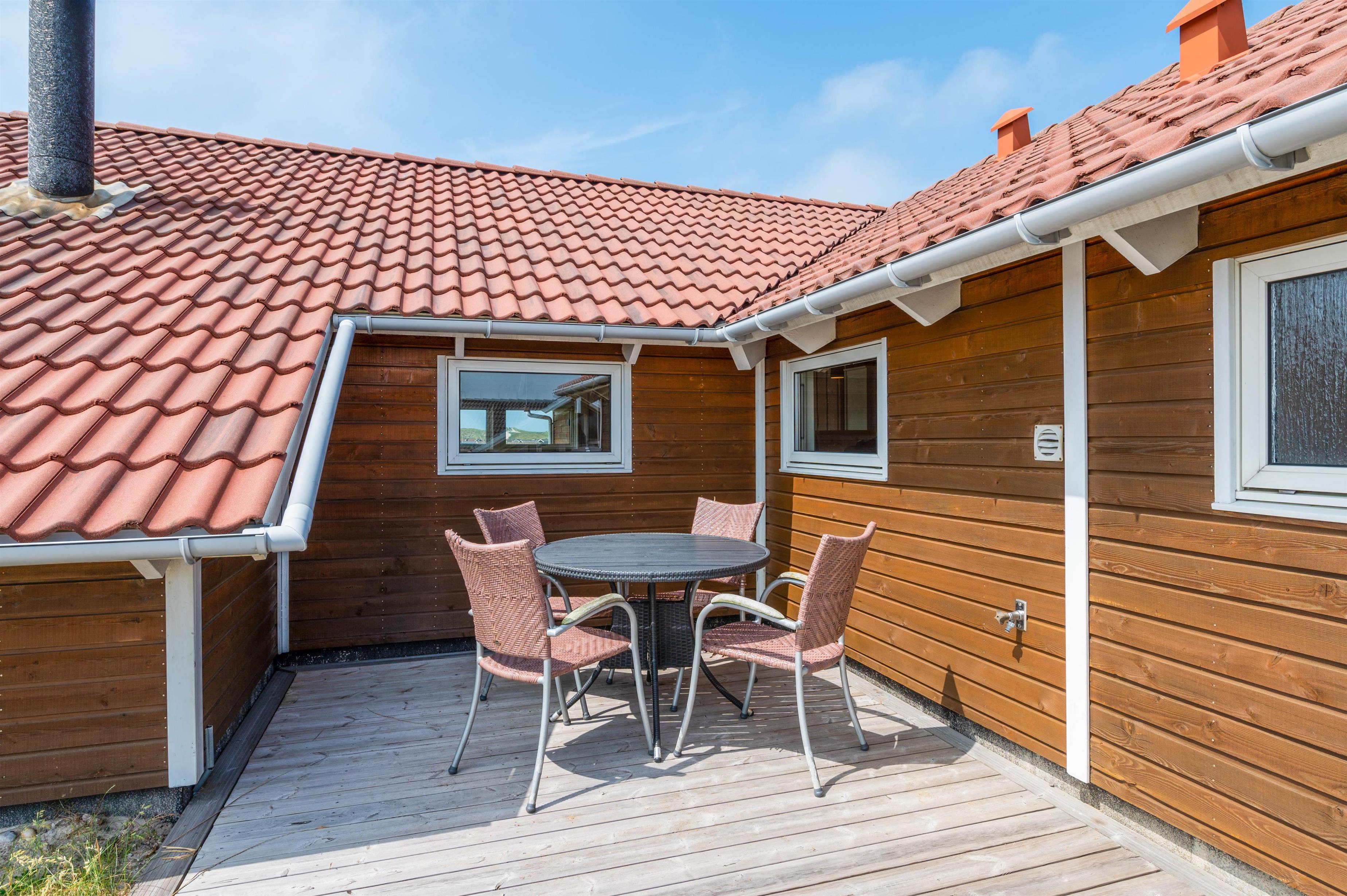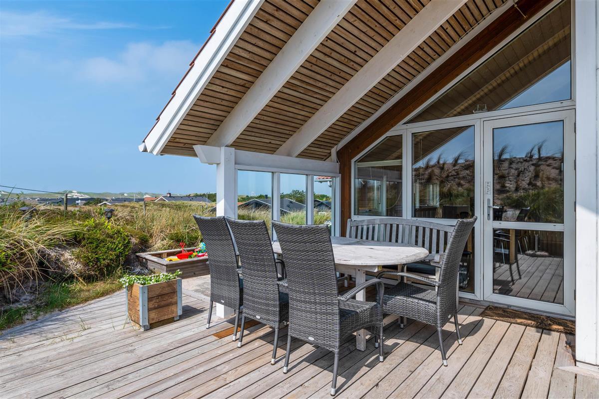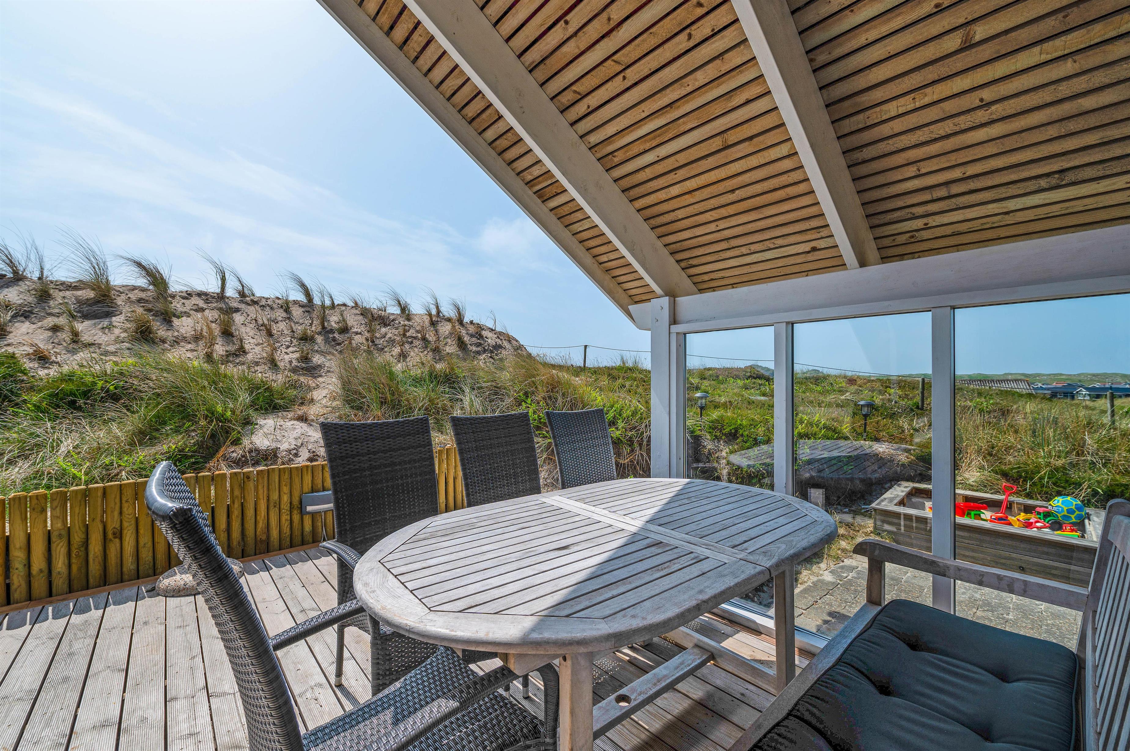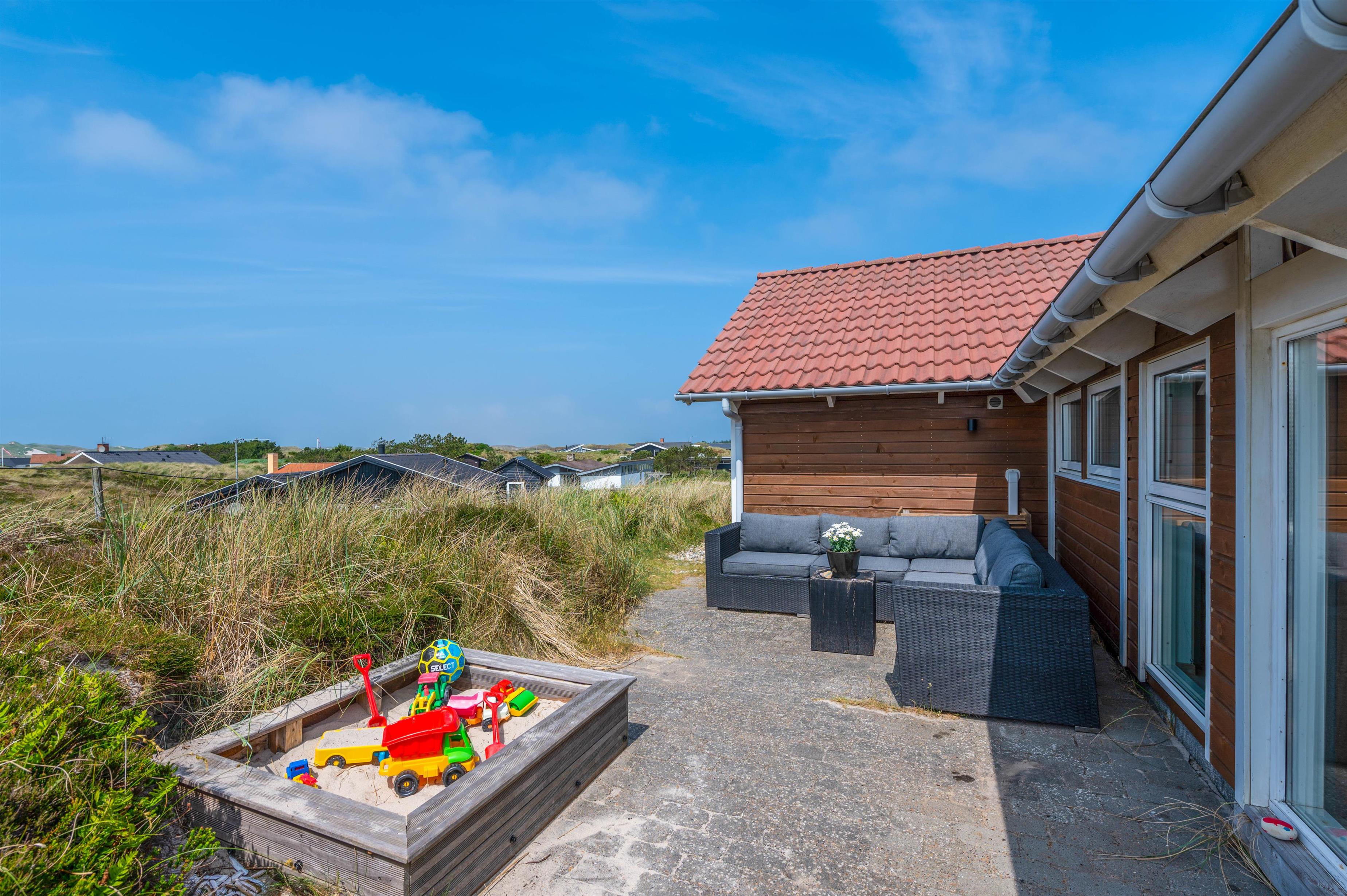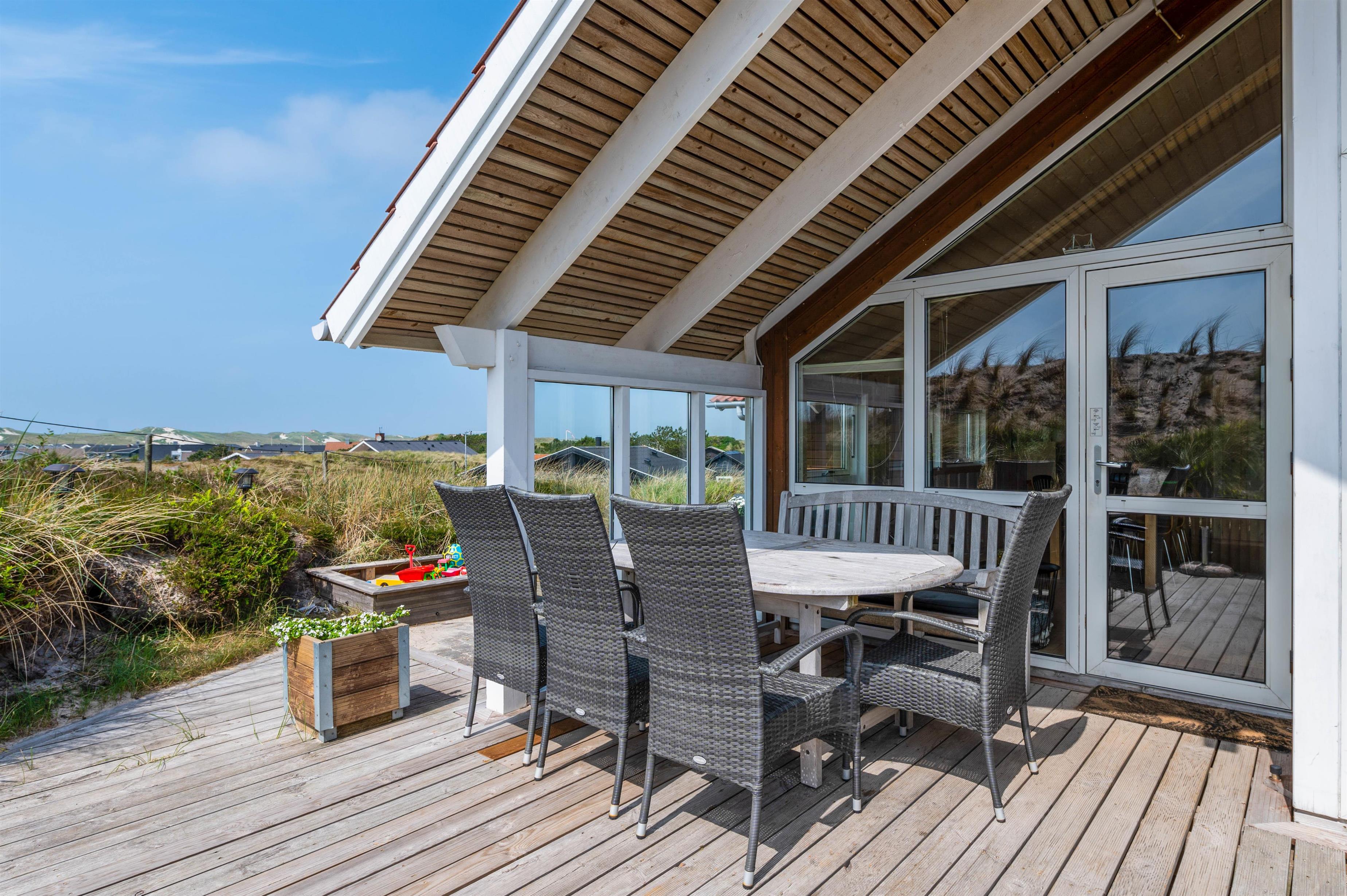 The holiday home sits atop a dune plot, offering unique panoramic views over the picturesque surroundings. Comfortable garden furniture invites you to linger outdoors. Enjoy freshly brewed coffee and unwind while children play in the sandpit or on the swing. Thanks to partially covered terrace areas, you can sit outside even in the rain and enjoy the fresh sea air.