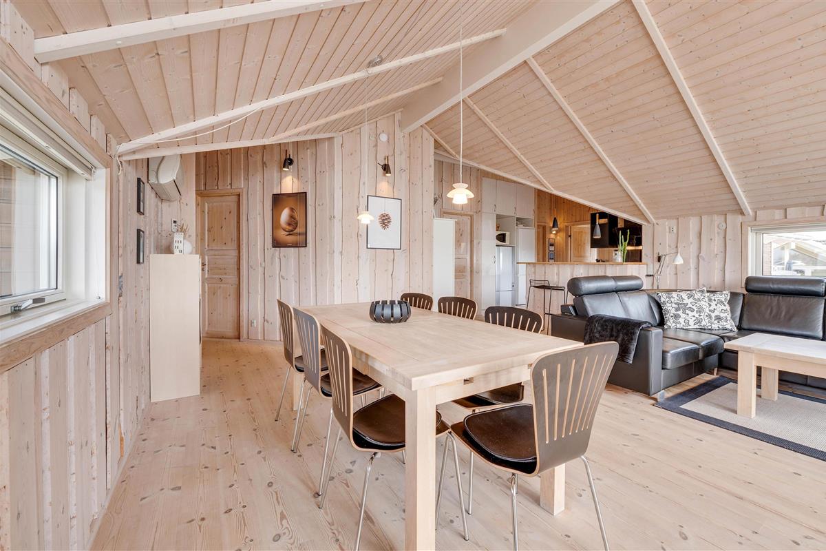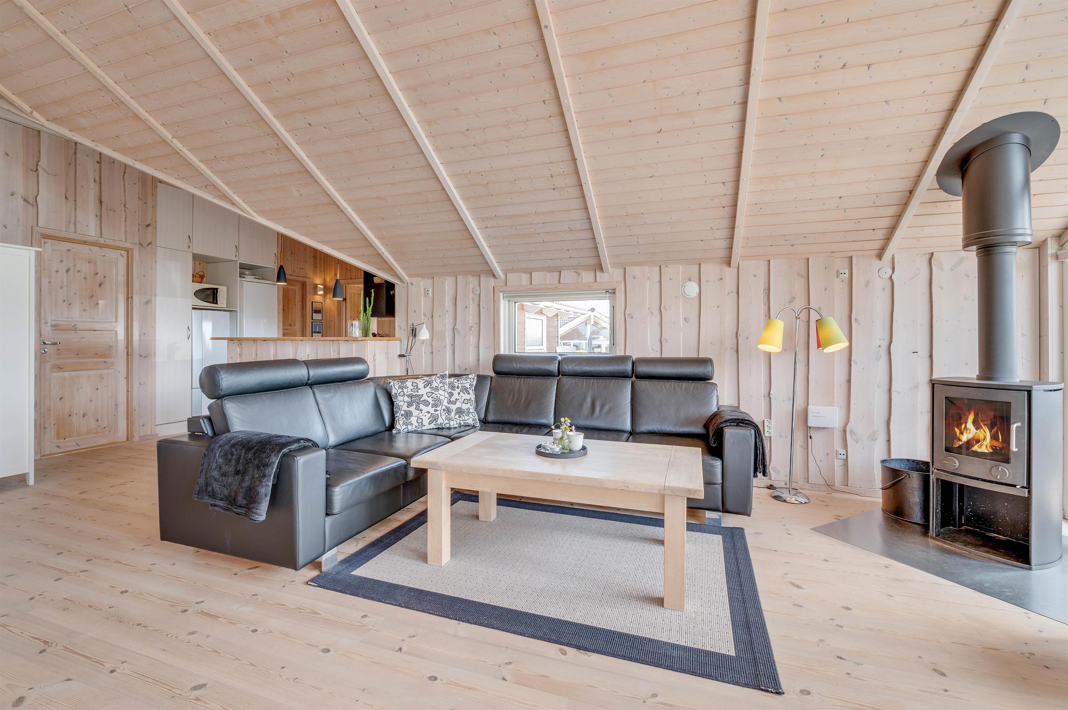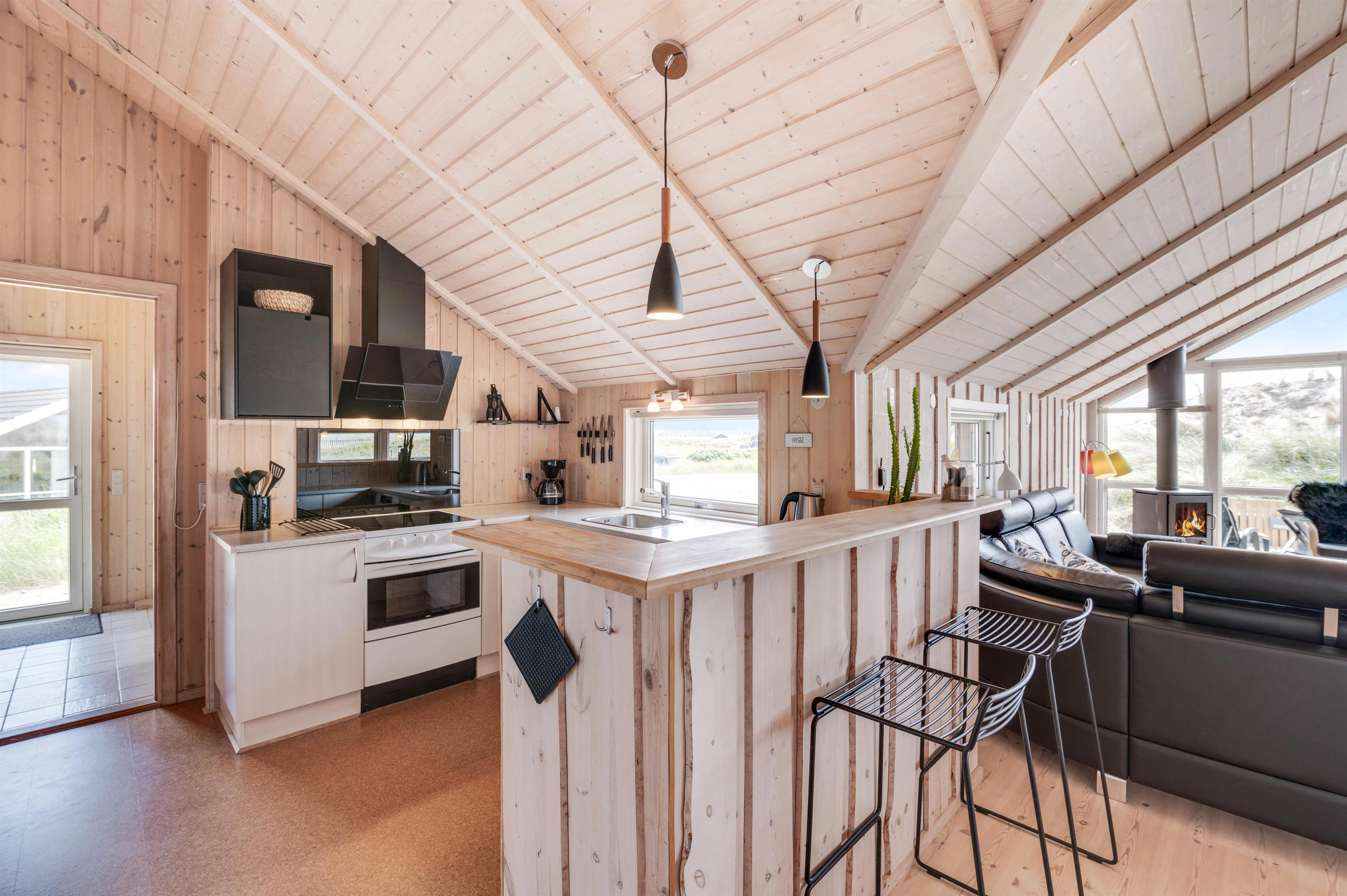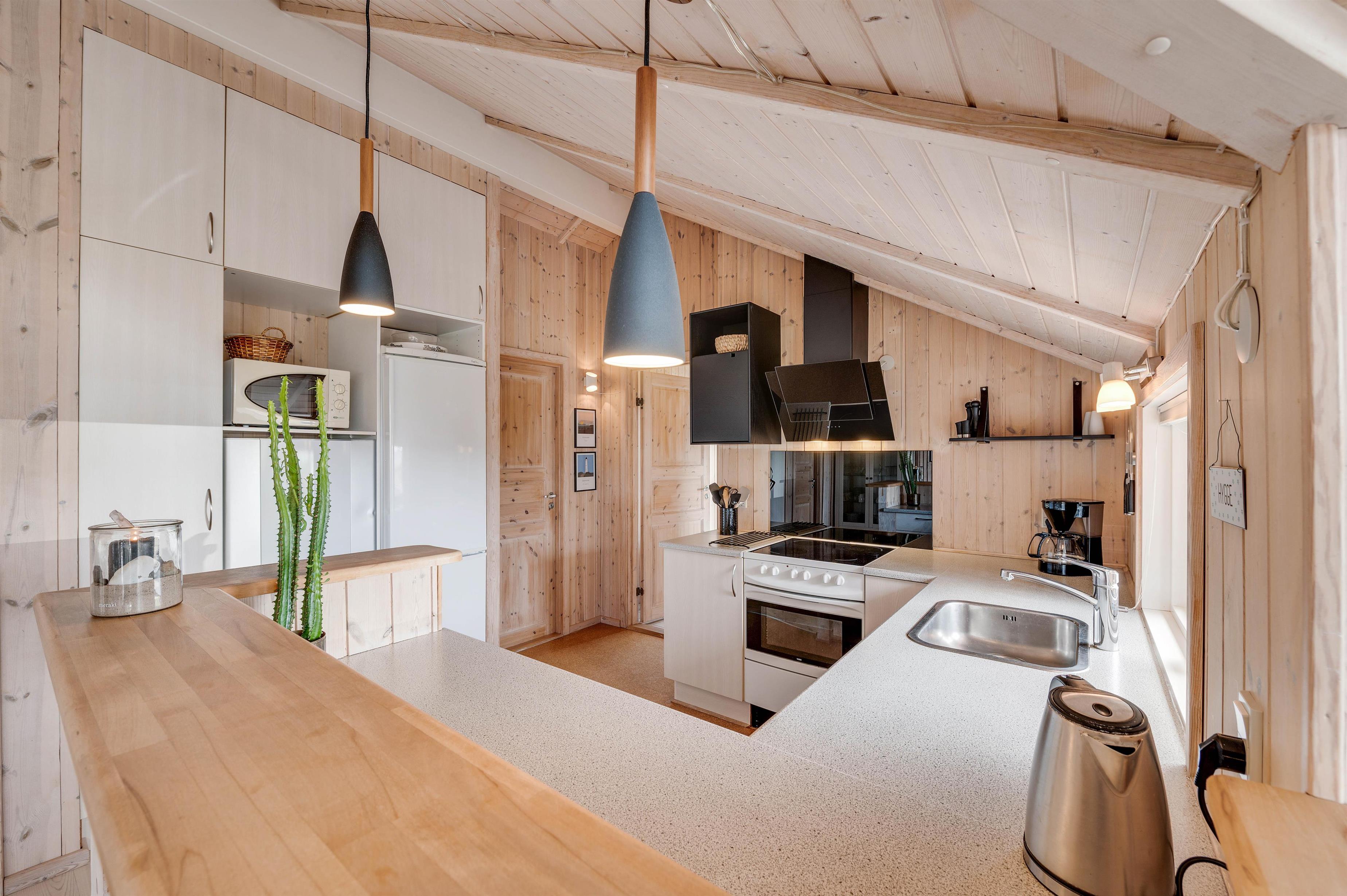 The spacious dining table is perfect for sociable evenings playing board games. A flat-screen TV with Chromecast is also available for cosy film nights. The energy-efficient heat pump quickly brings the holiday home to a comfortable temperature. The kitchen, equipped with modern fitted appliances, is ready for communal cooking sessions. Why not try preparing a Scandinavian menu?
