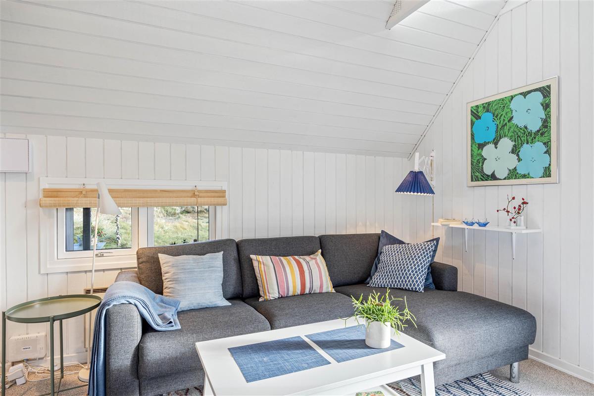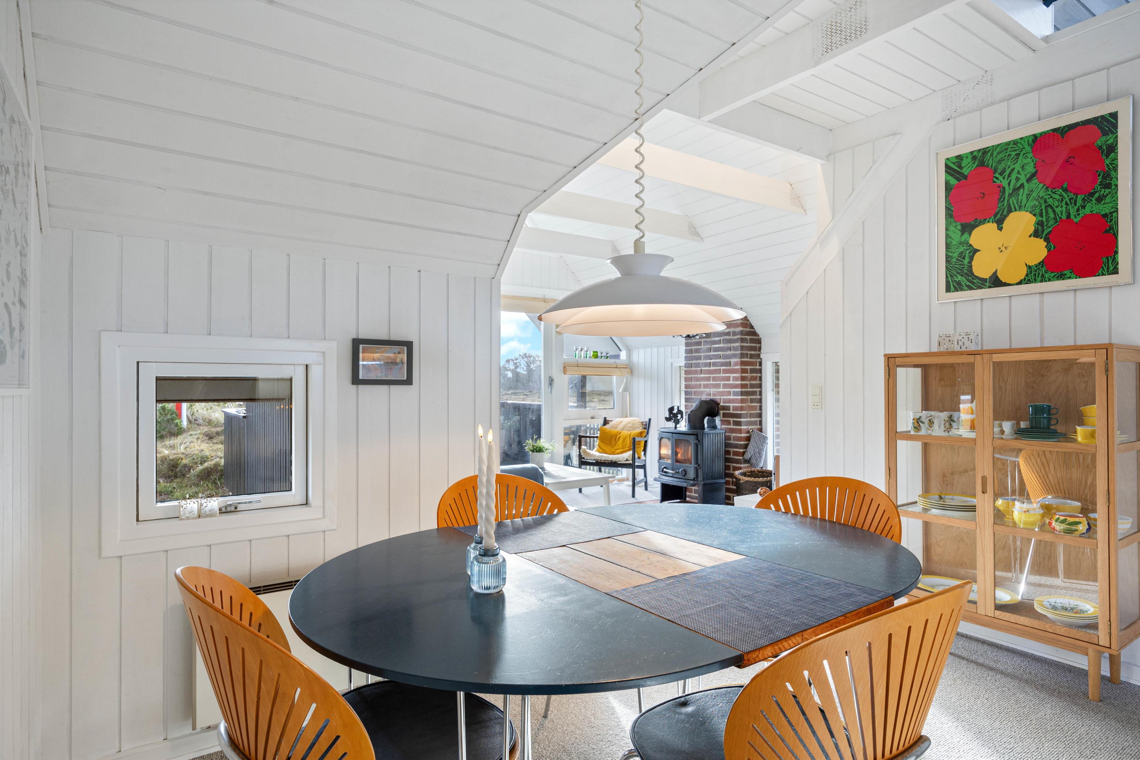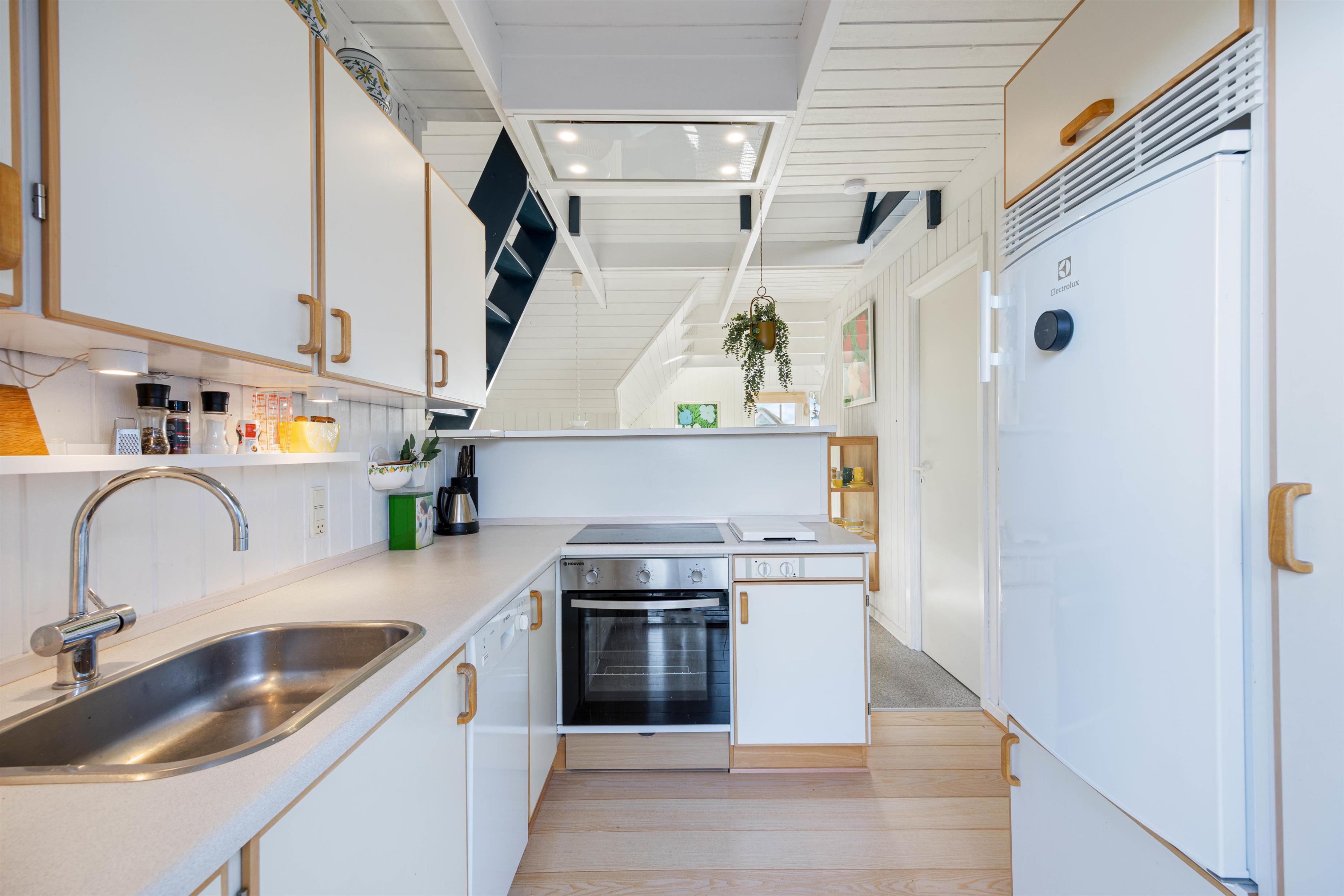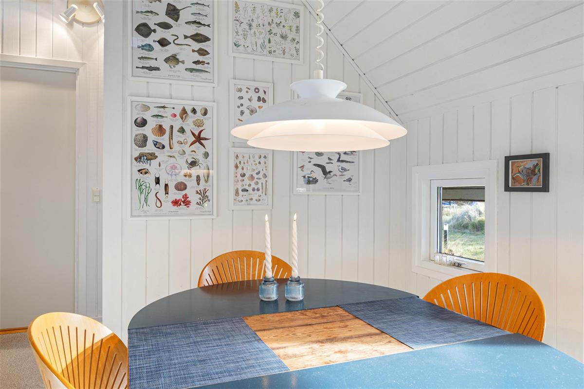 The holiday home at Nymandsbjerg 9 accommodates four people across three bedrooms: two with double beds and one with bunk beds measuring 70 x 185 cm. From the small hallway, you enter the dining area which connects the kitchen and living room.