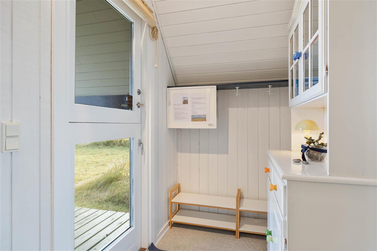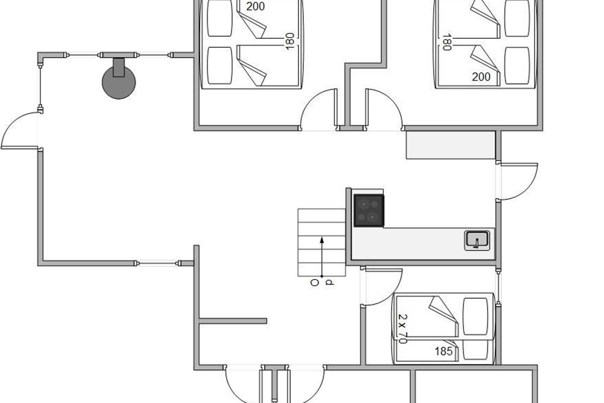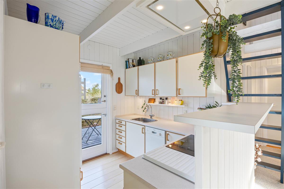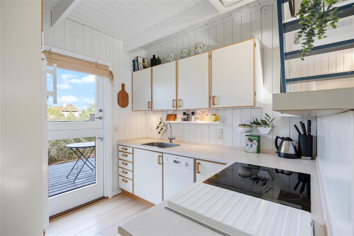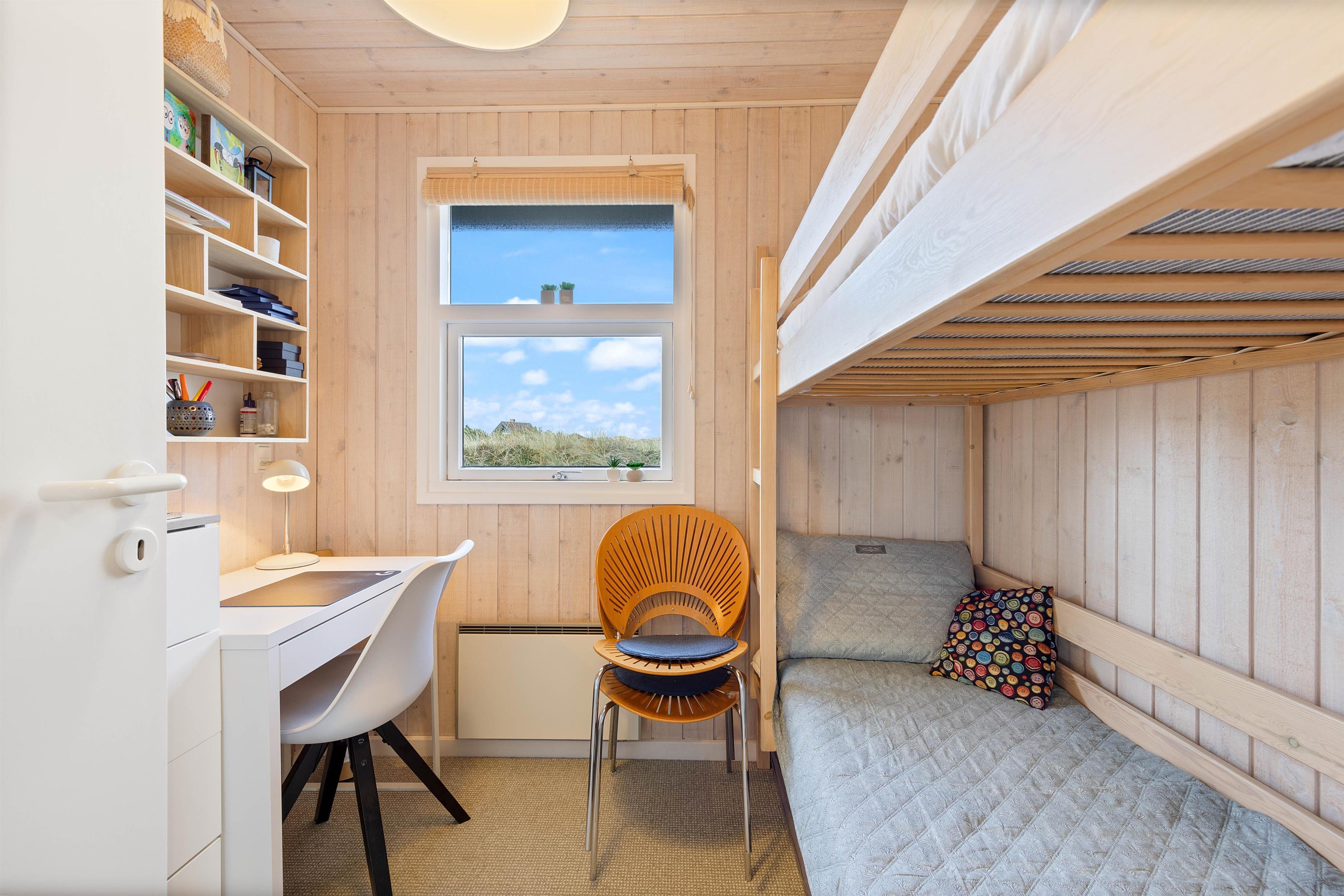 The holiday home at Nymandsbjerg 9 accommodates four people across three bedrooms: two with double beds and one with bunk beds measuring 70 x 185 cm. From the small hallway, you enter the dining area which connects the kitchen and living room.