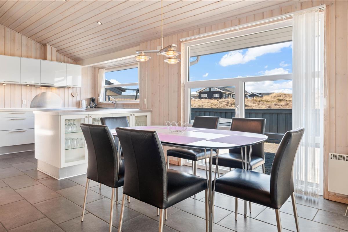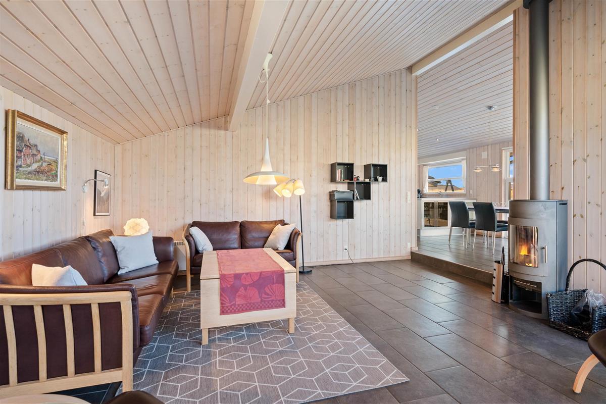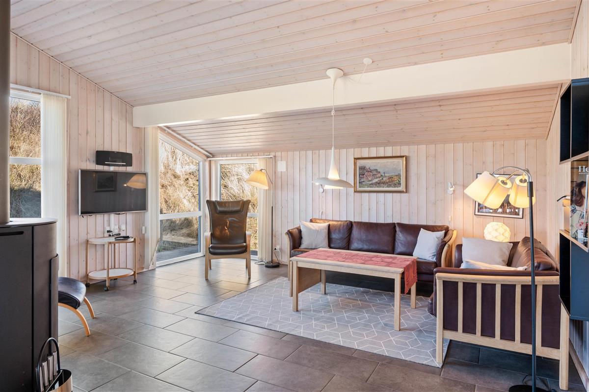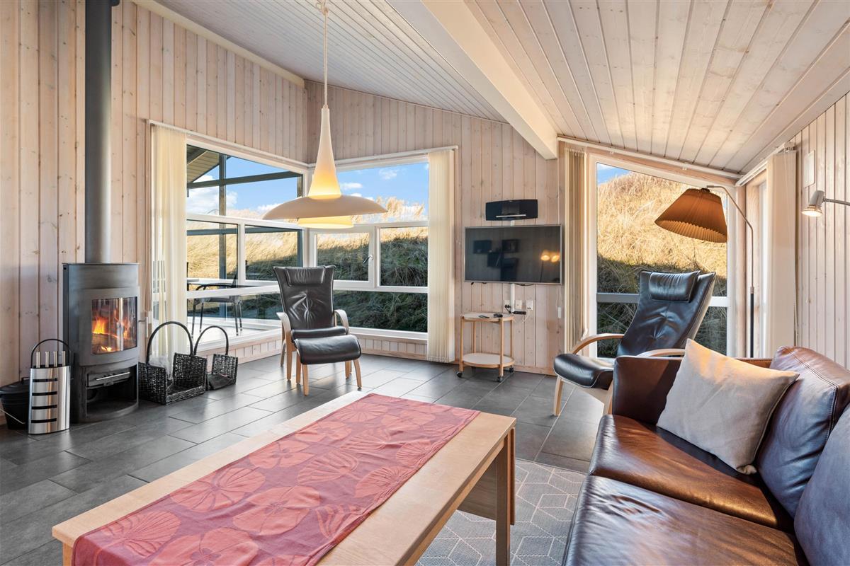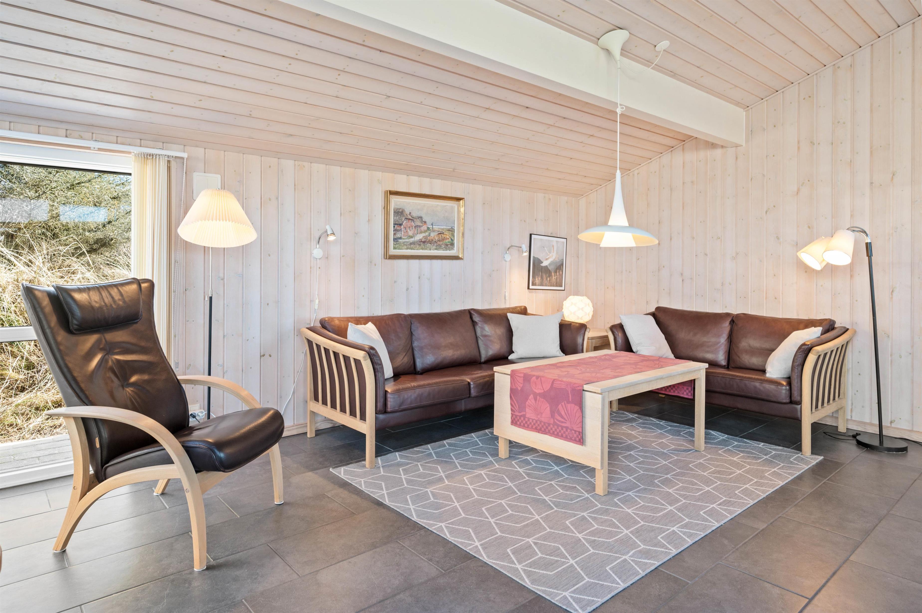 Stylishly furnished, this holiday home in Bjerregård radiates typical holiday charm. The living area features a beautiful wood-burning stove providing cosy warmth throughout the year. Spread across the sofa and armchairs, you can reflect on your day with everyone while enjoying a glass of wine and listening to the crackling of the fire.