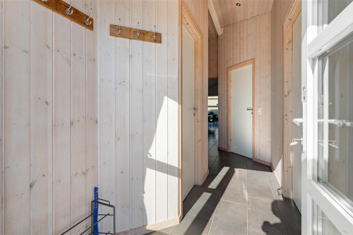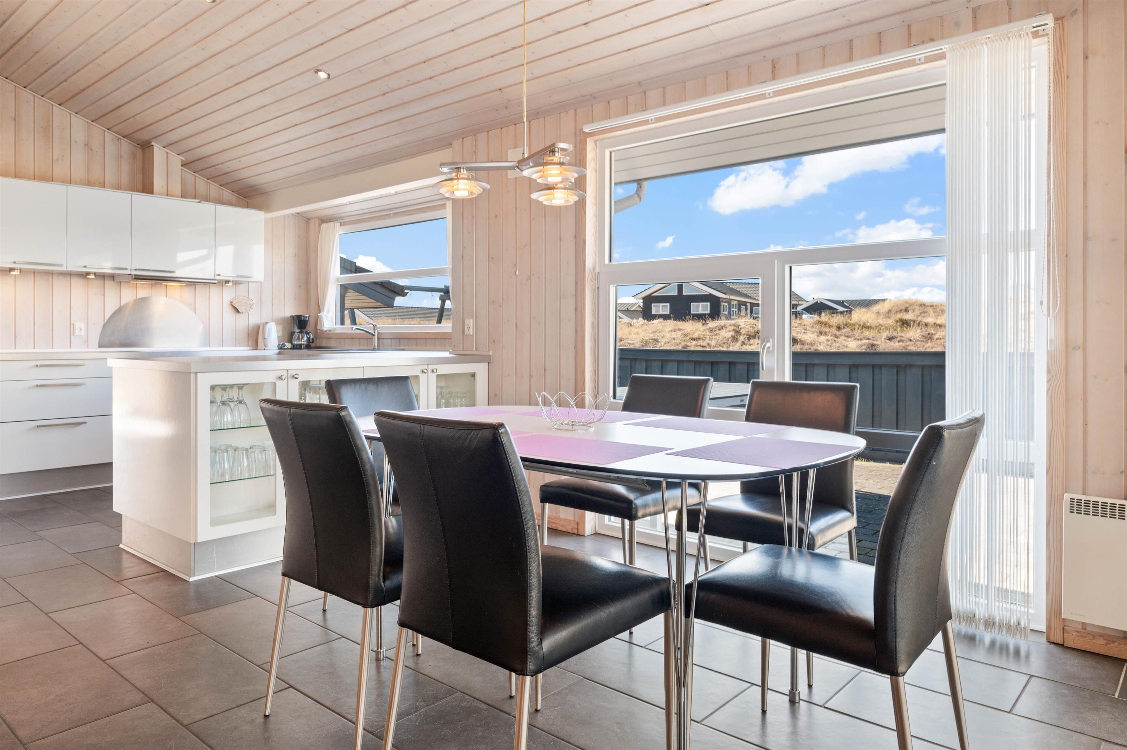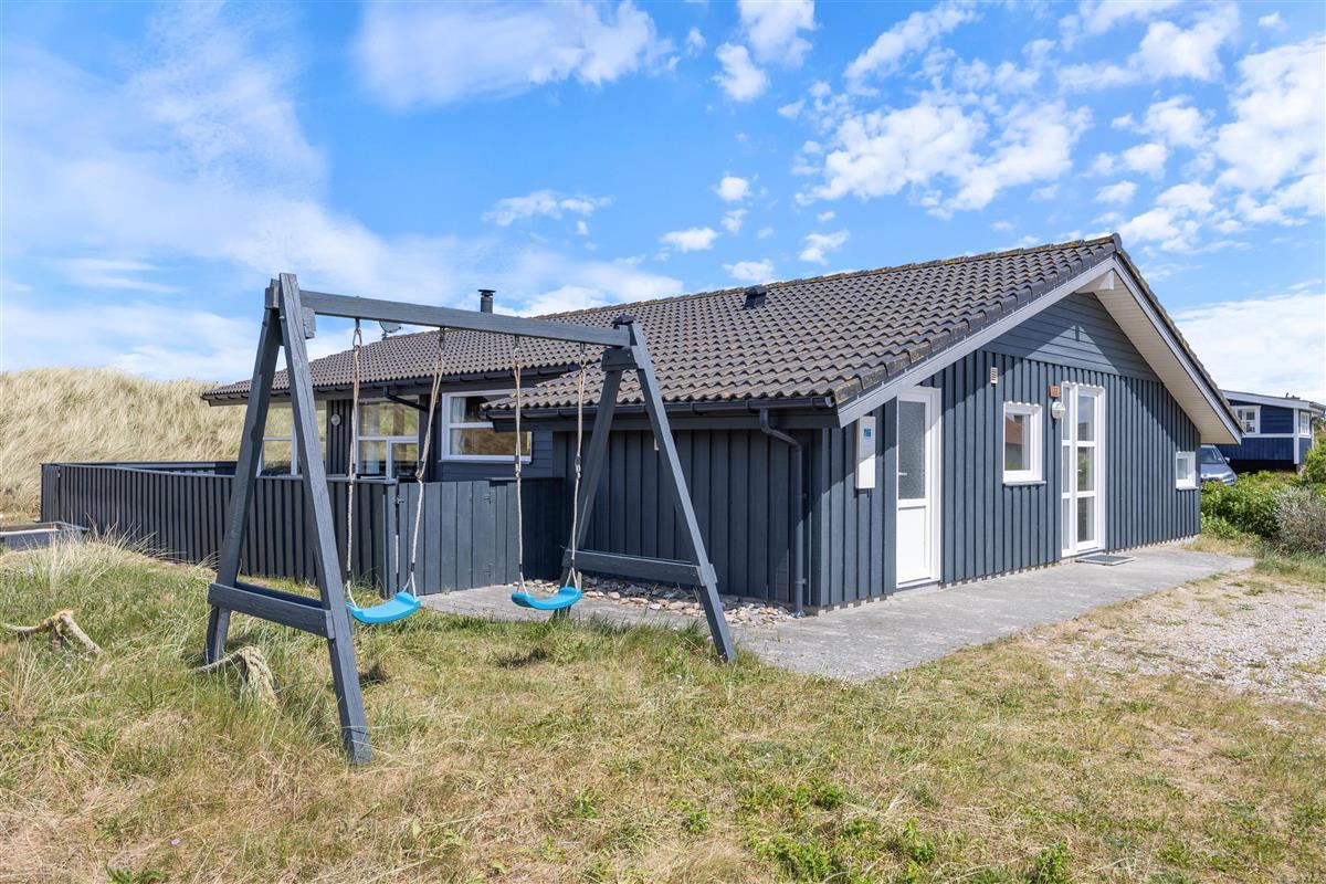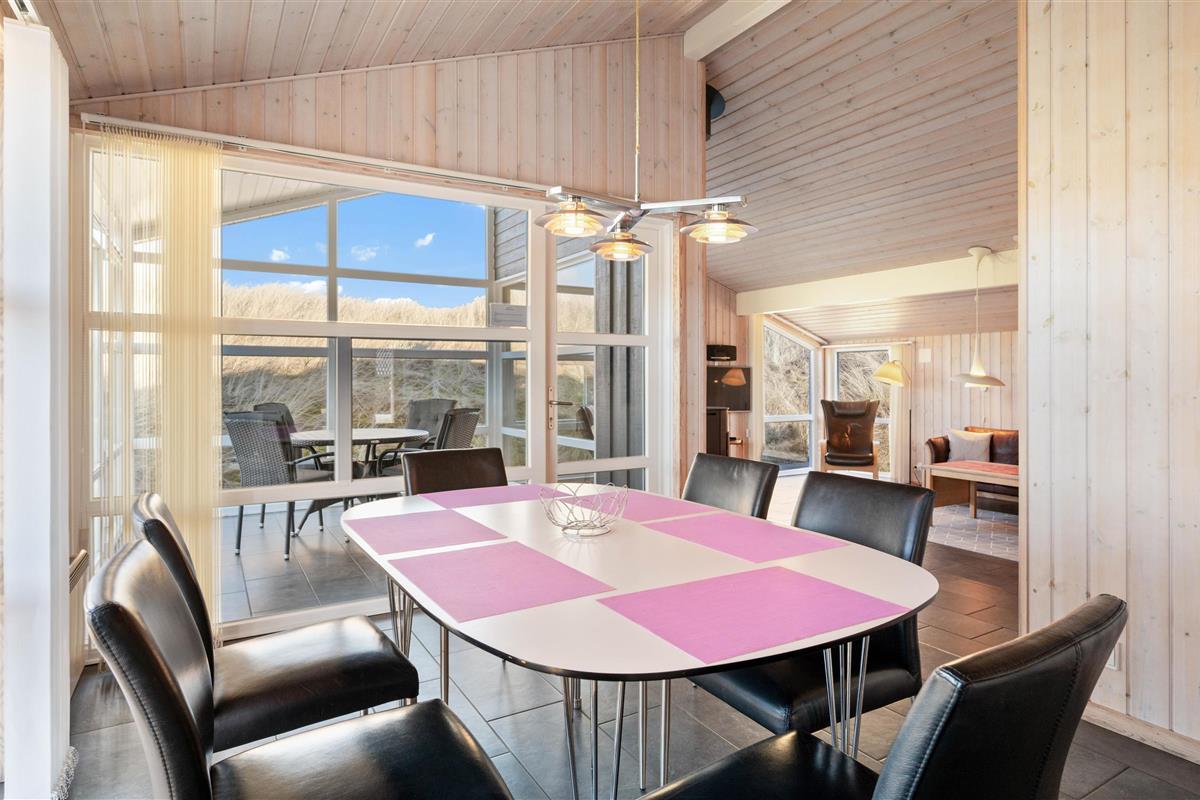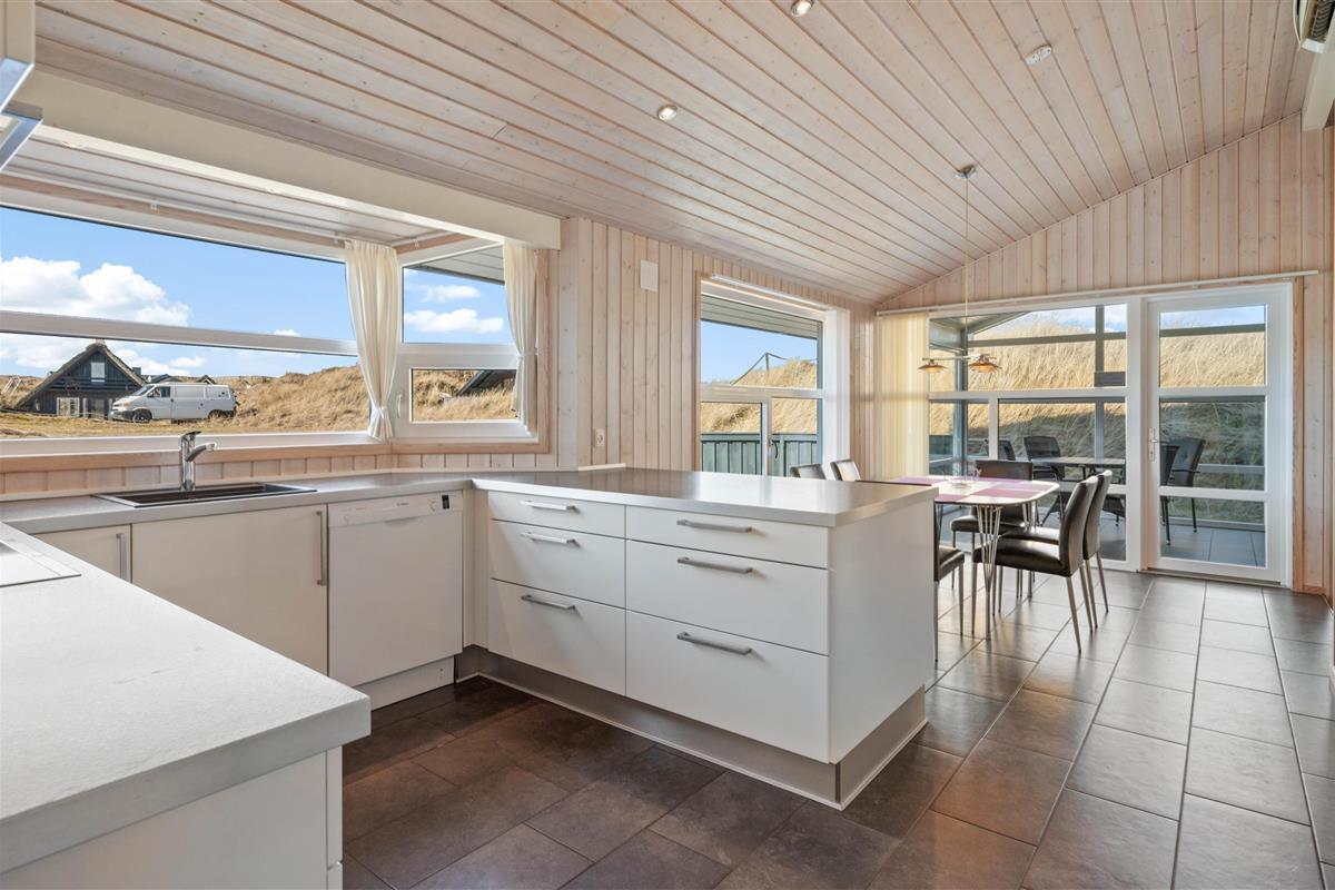 Stylishly furnished, this holiday home in Bjerregård radiates typical holiday charm. The living area features a beautiful wood-burning stove providing cosy warmth throughout the year. Spread across the sofa and armchairs, you can reflect on your day with everyone while enjoying a glass of wine and listening to the crackling of the fire.