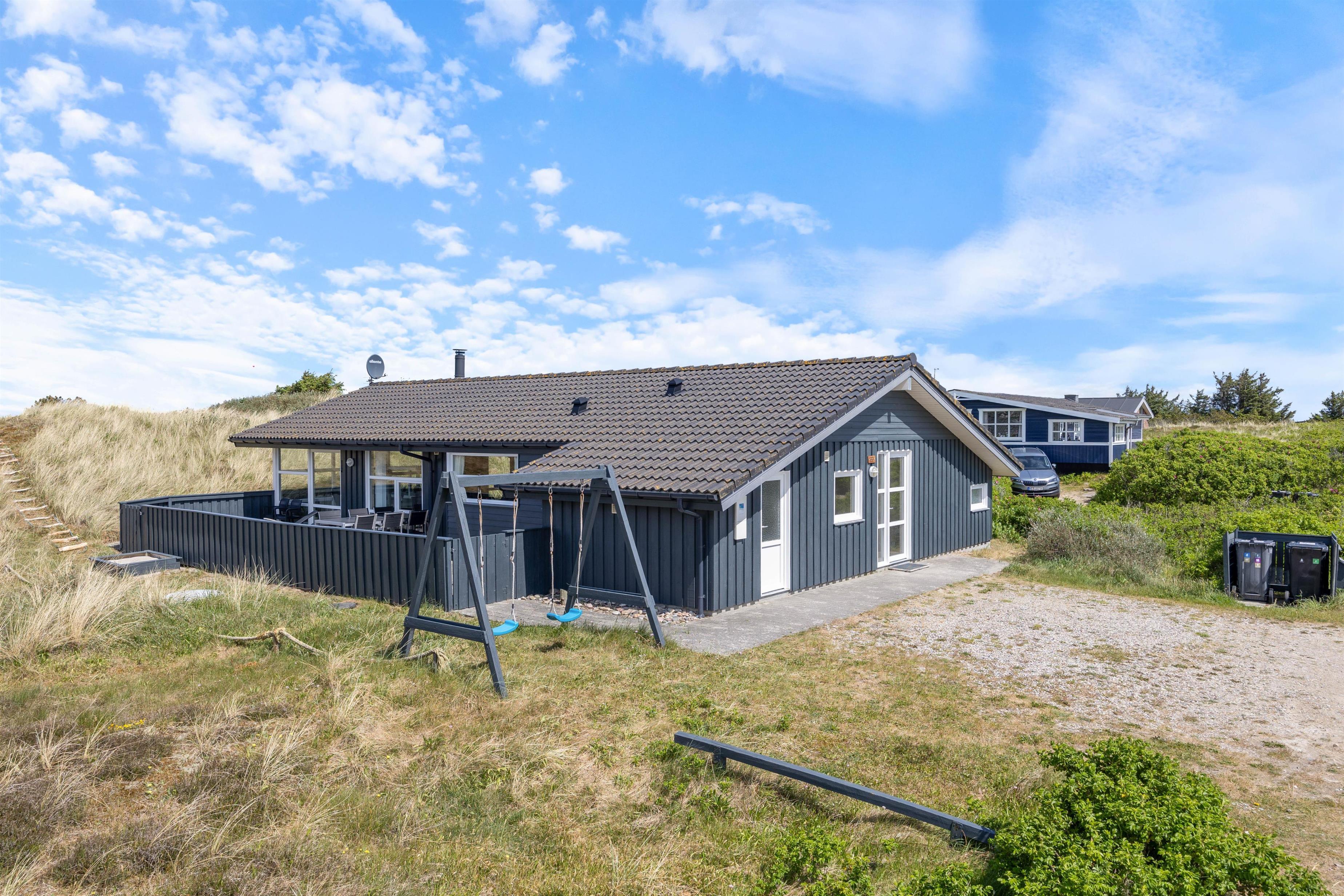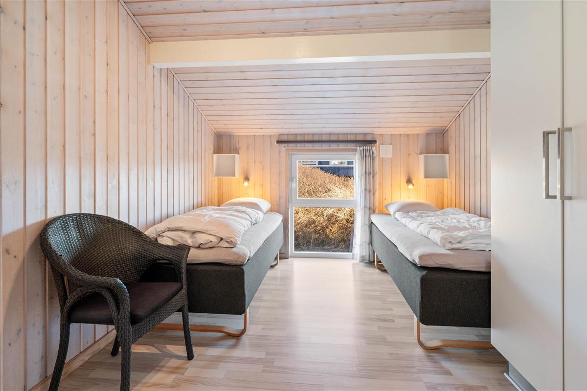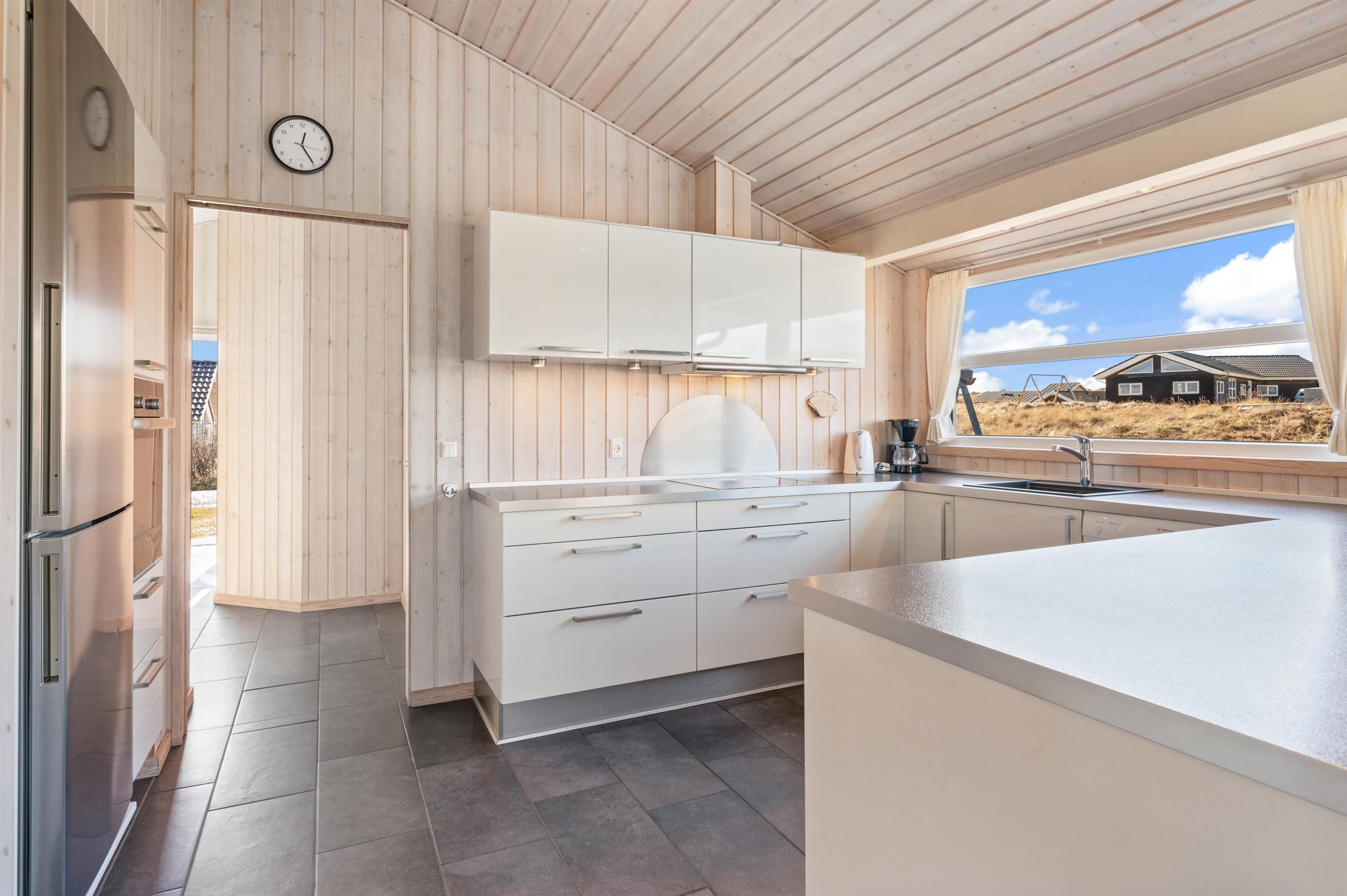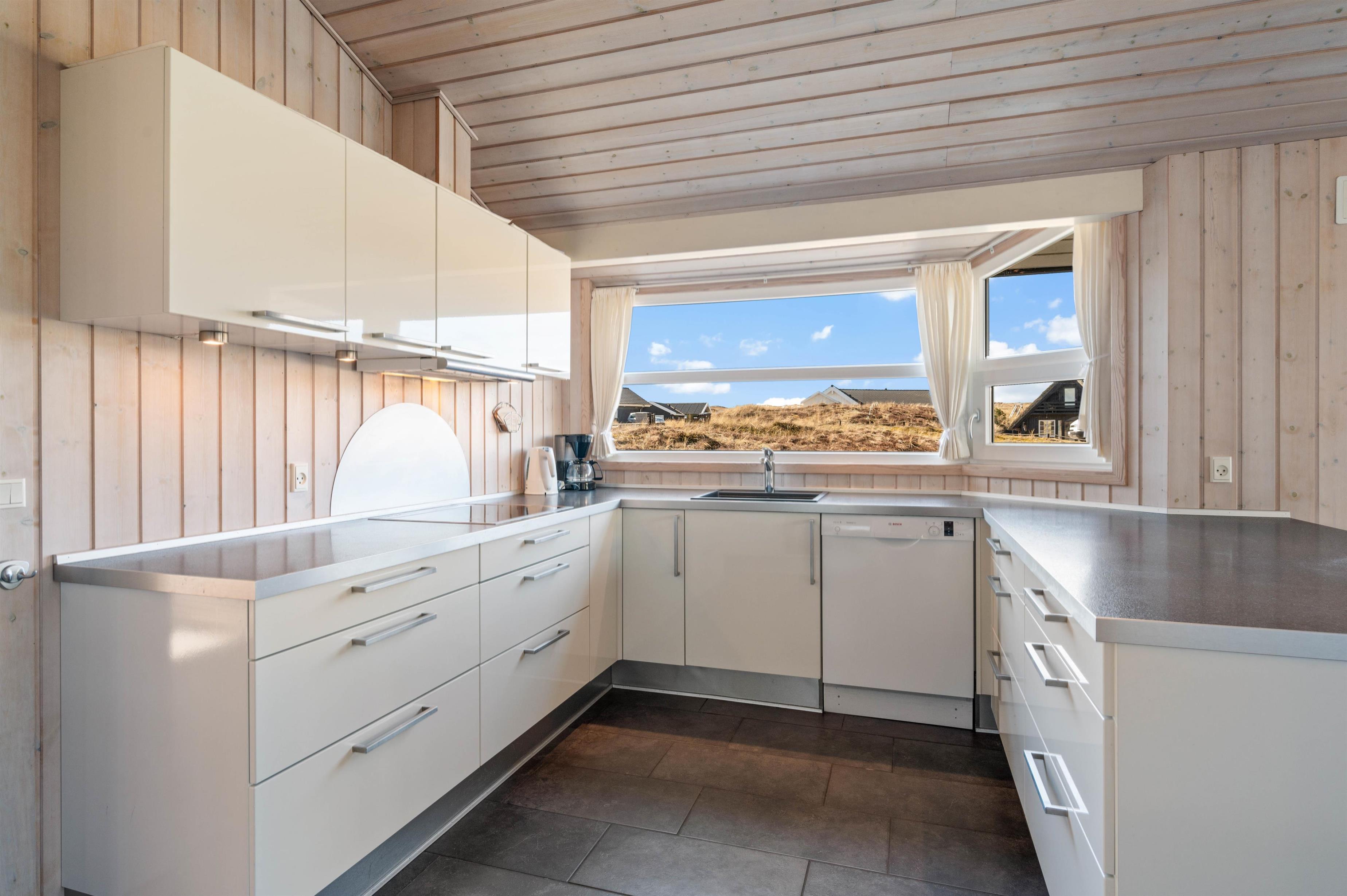 Stylishly furnished, this holiday home in Bjerregård radiates typical holiday charm. The living area features a beautiful wood-burning stove providing cosy warmth throughout the year. Spread across the sofa and armchairs, you can reflect on your day with everyone while enjoying a glass of wine and listening to the crackling of the fire.