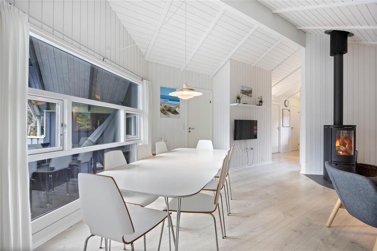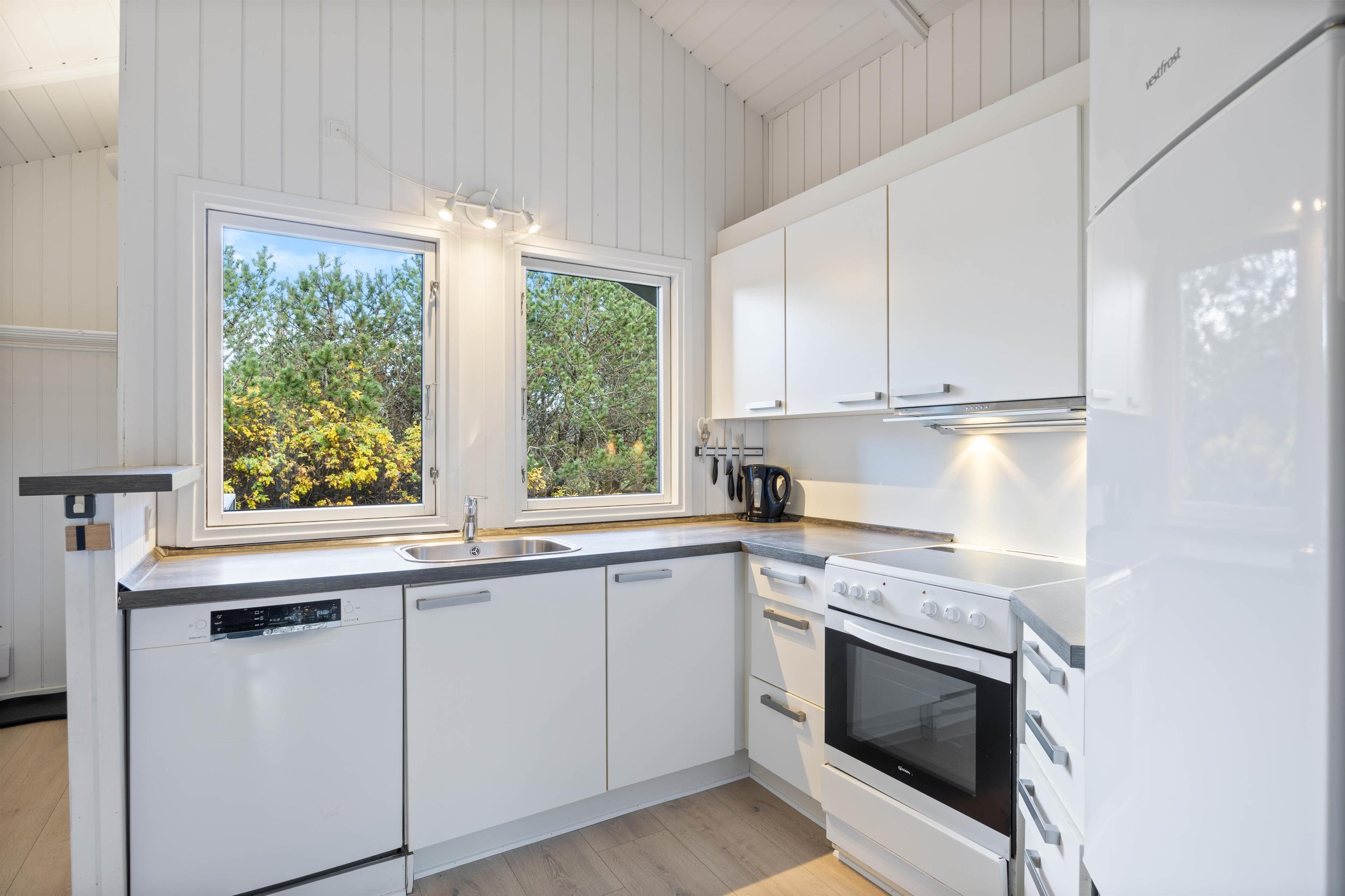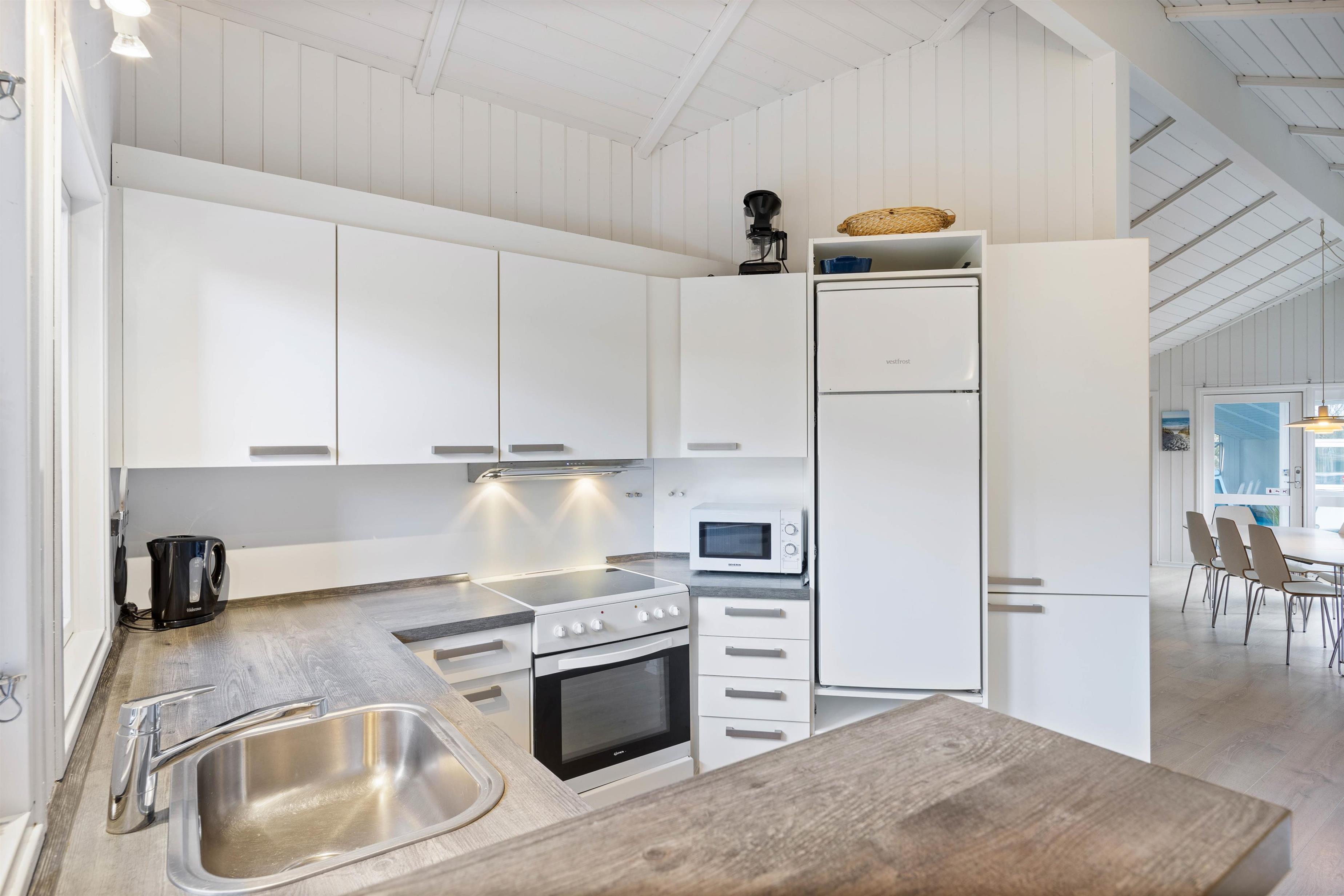The heart of this holiday home at Bilbergsvej 37 in Bjerregård is the open-plan living area, combining kitchen, dining area and living room. The whole family can spend time together here, whether some are cooking while others relax on the sofa watching a film.
