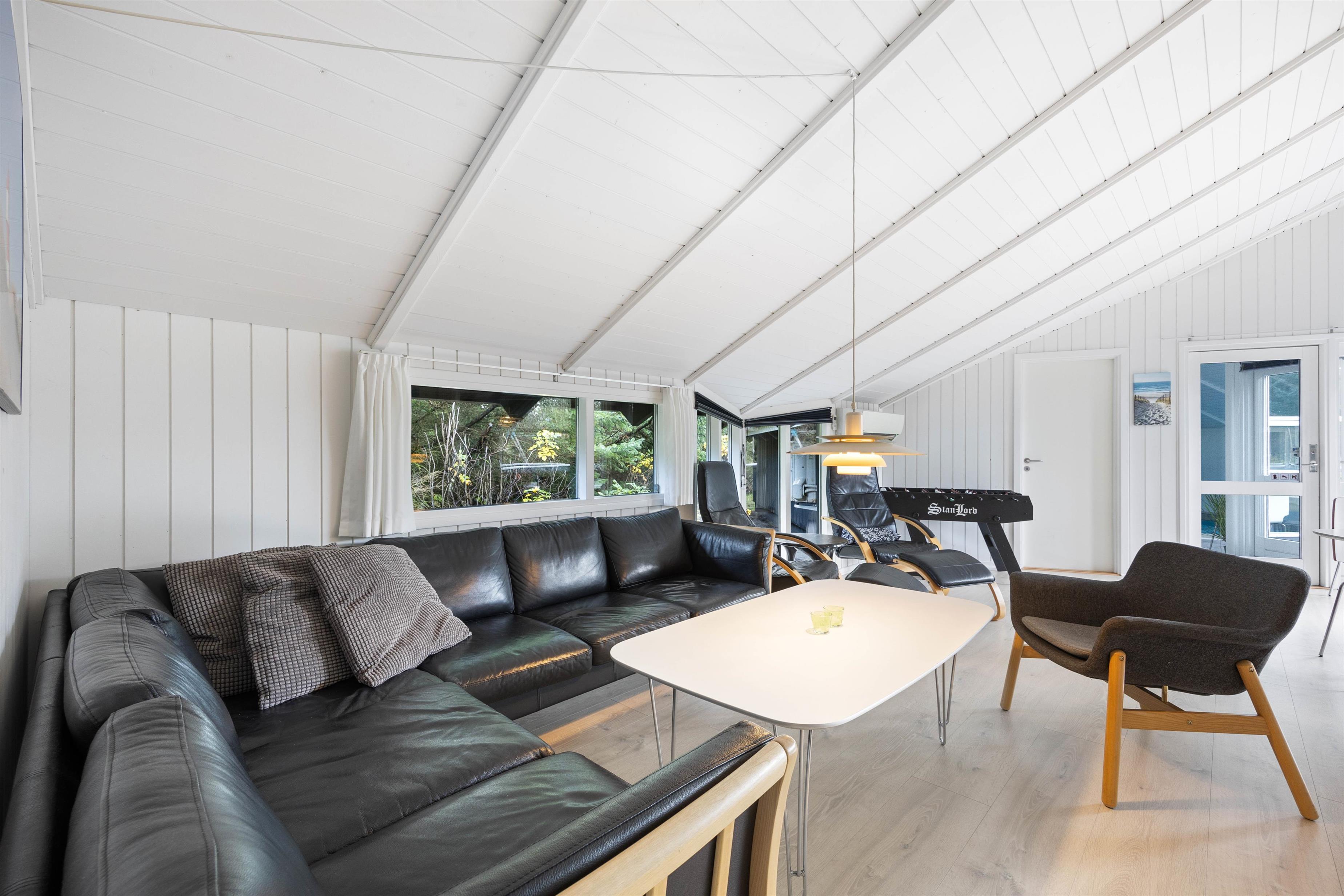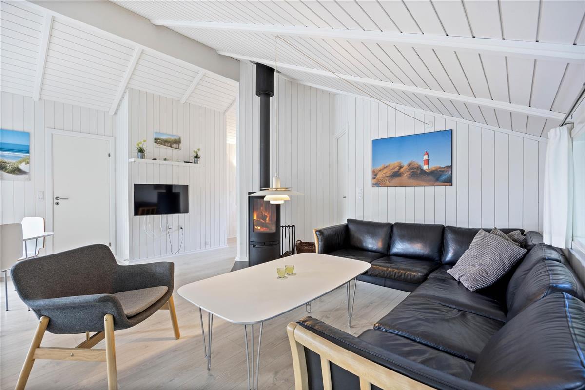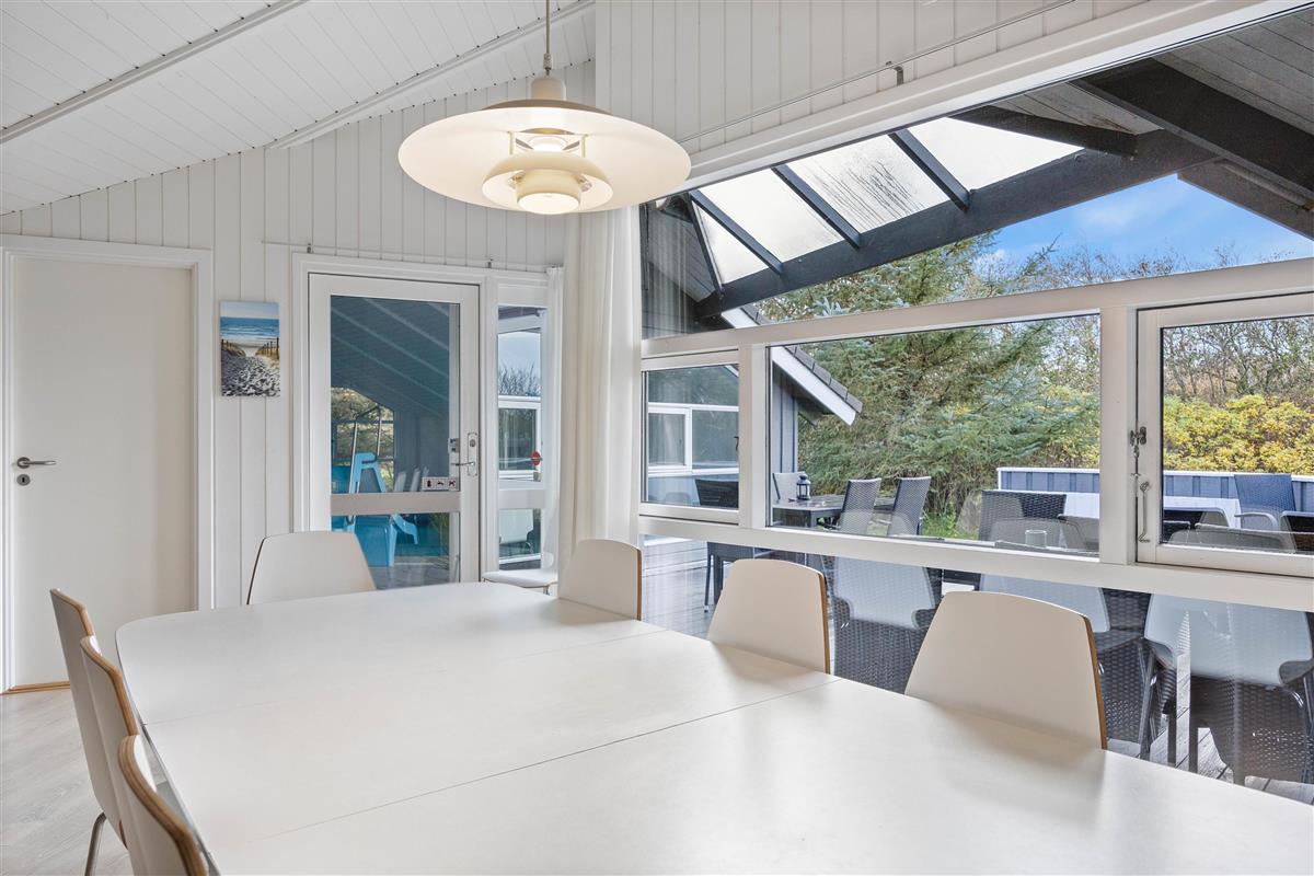 The heart of this holiday home at Bilbergsvej 37 in Bjerregård is the open-plan living area, combining kitchen, dining area and living room. The whole family can spend time together here, whether some are cooking while others relax on the sofa watching a film.