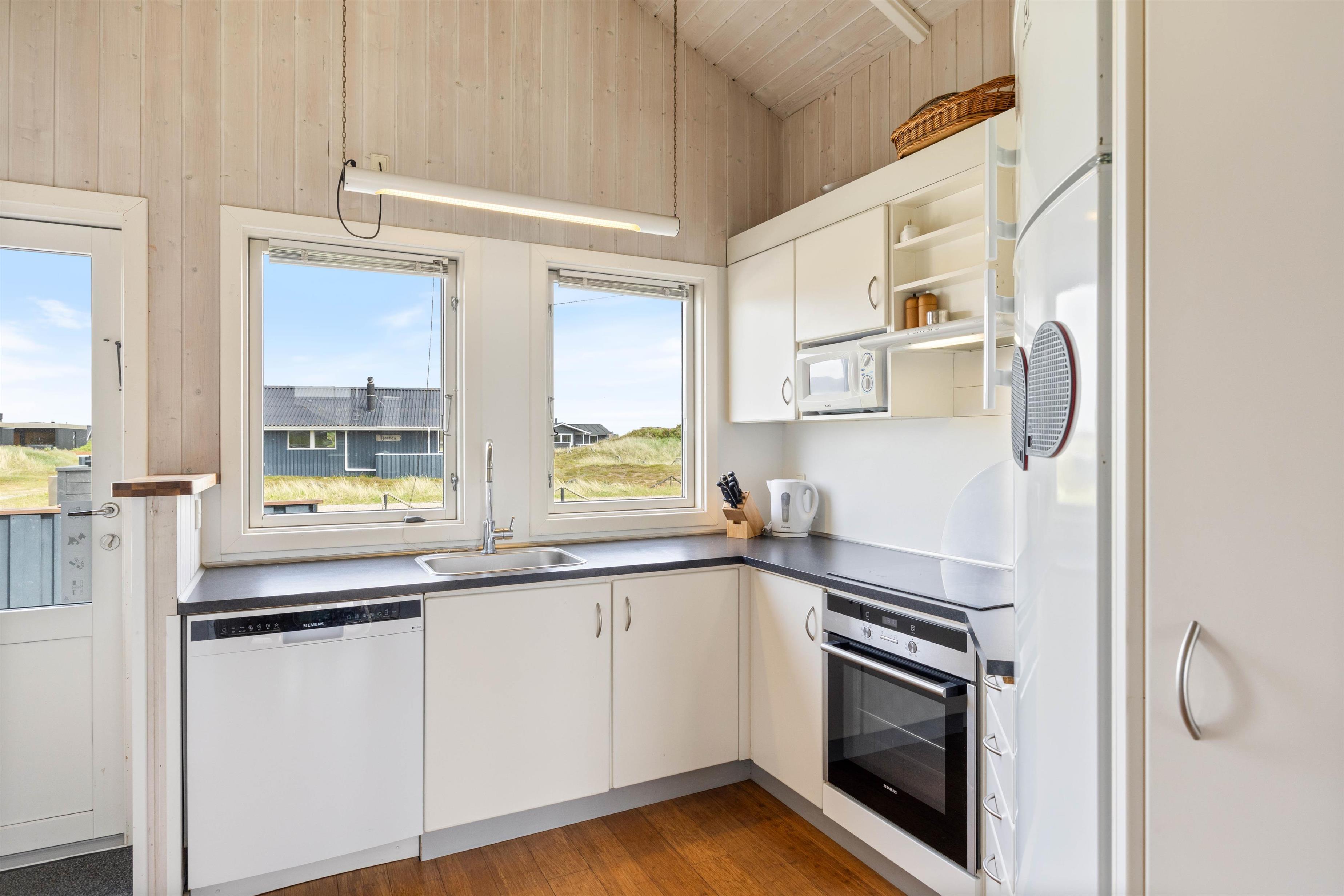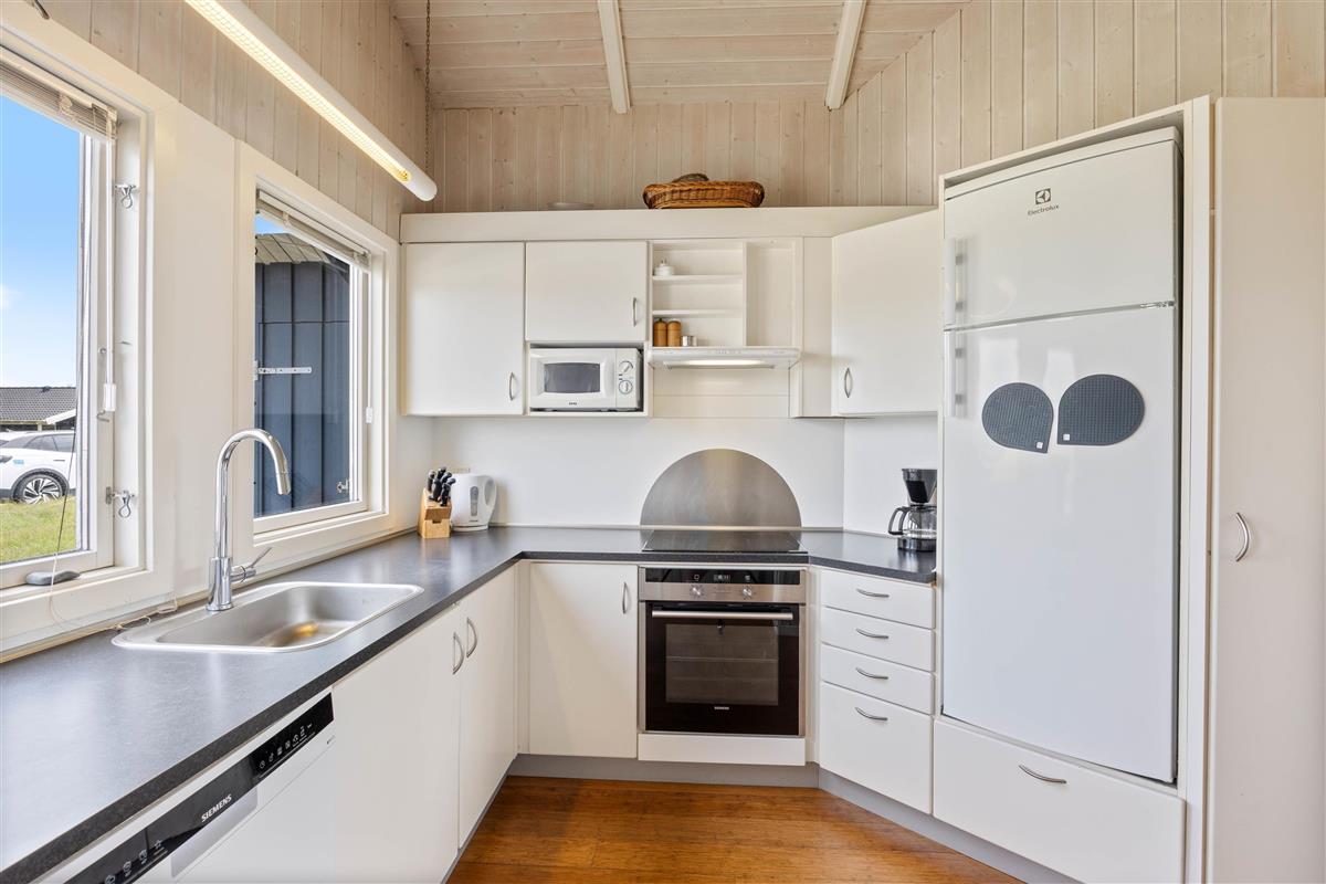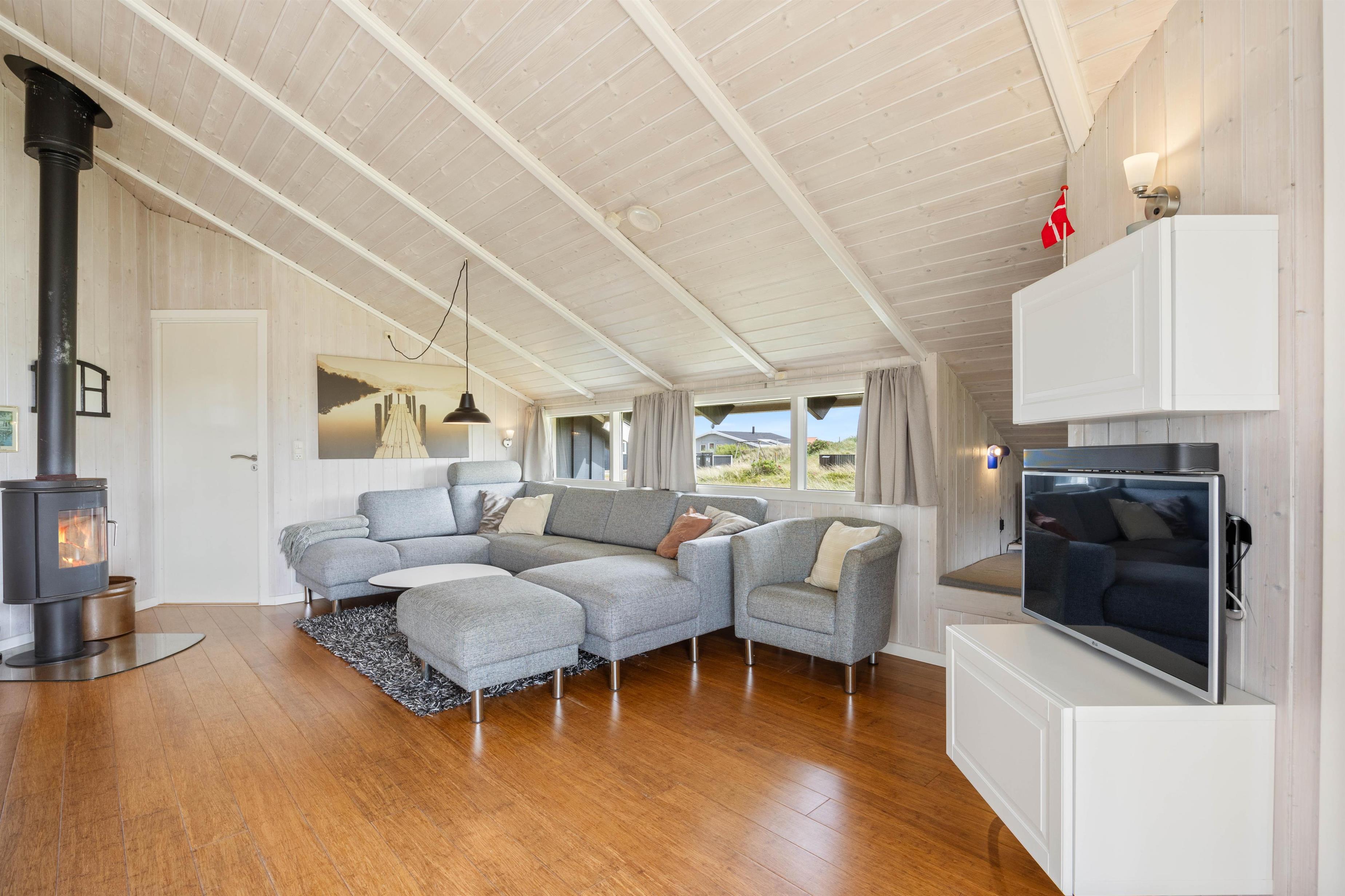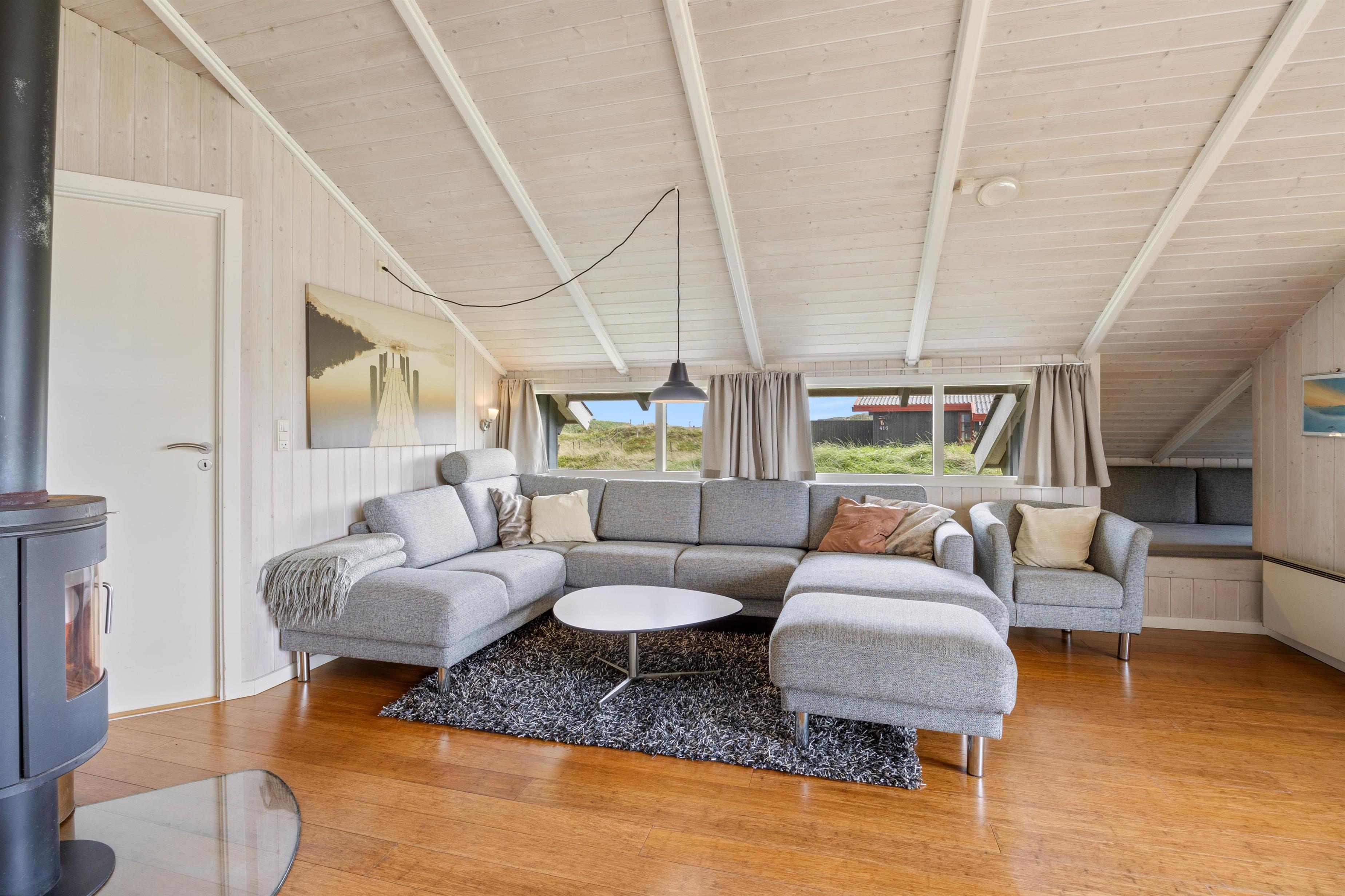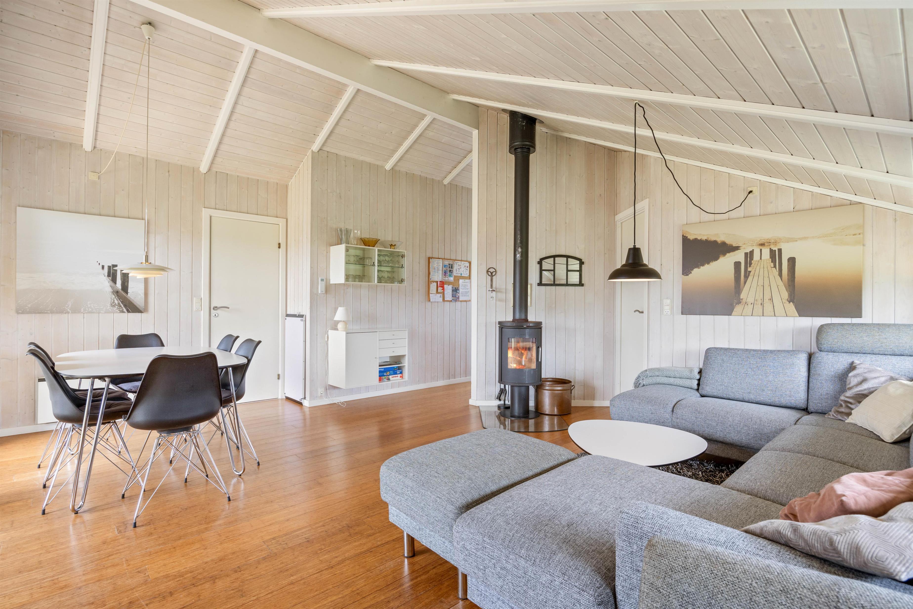 The heart of the holiday home is the living area, decorated in typical Danish style with beautiful wooden floors and bright, sloping ceilings. Numerous windows flood the space with natural light, and you can make yourself comfortable either on the sofa or at the dining table. The open-plan, well-equipped kitchen invites you to prepare delicious meals, while the dishwasher takes care of the cleaning up afterwards.