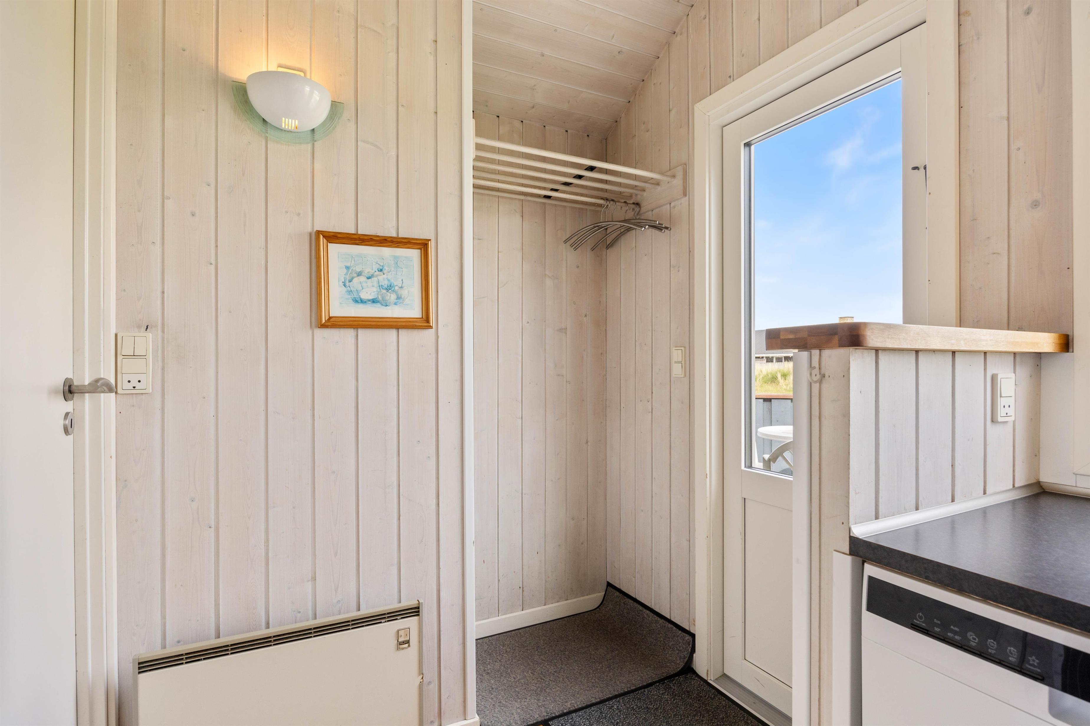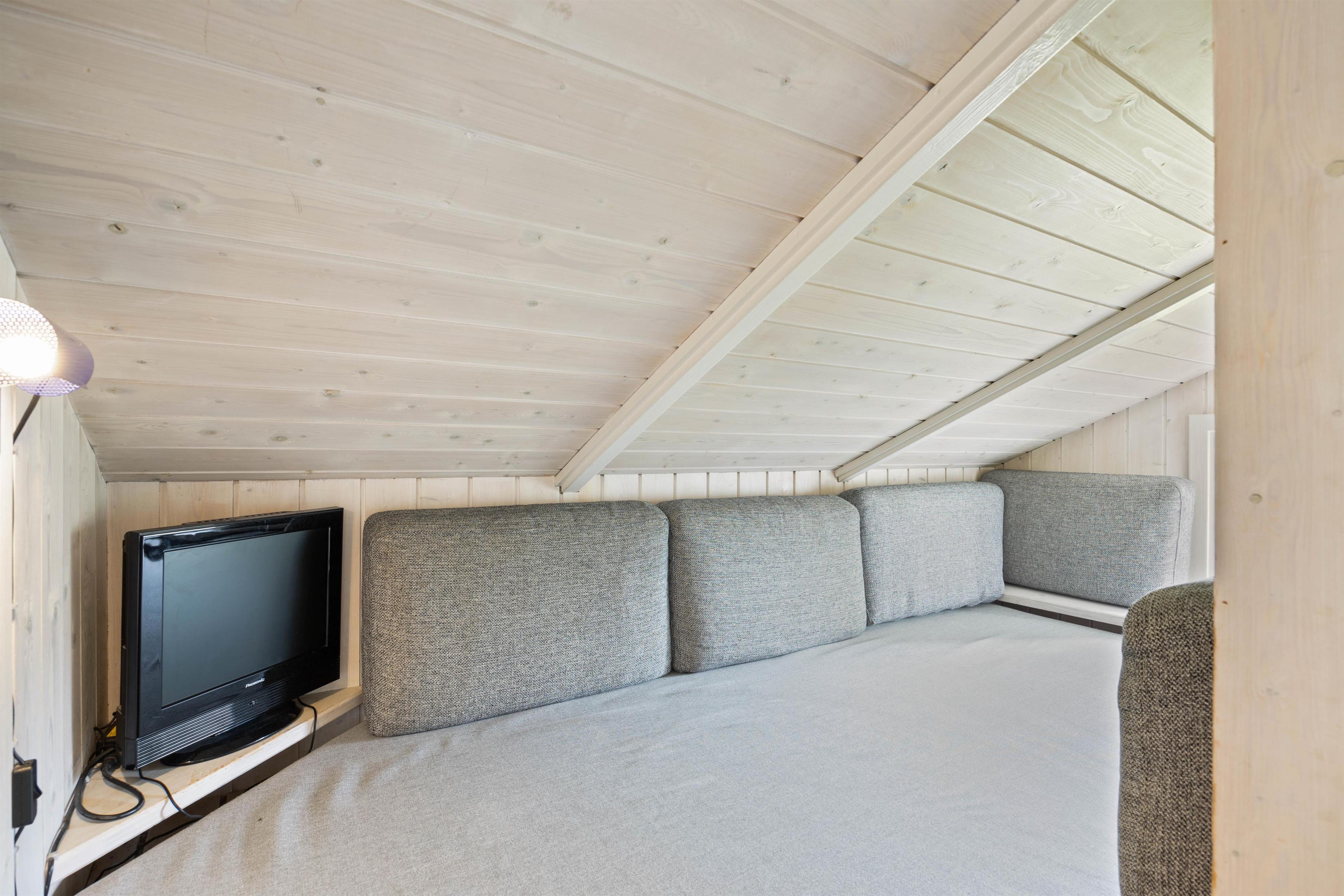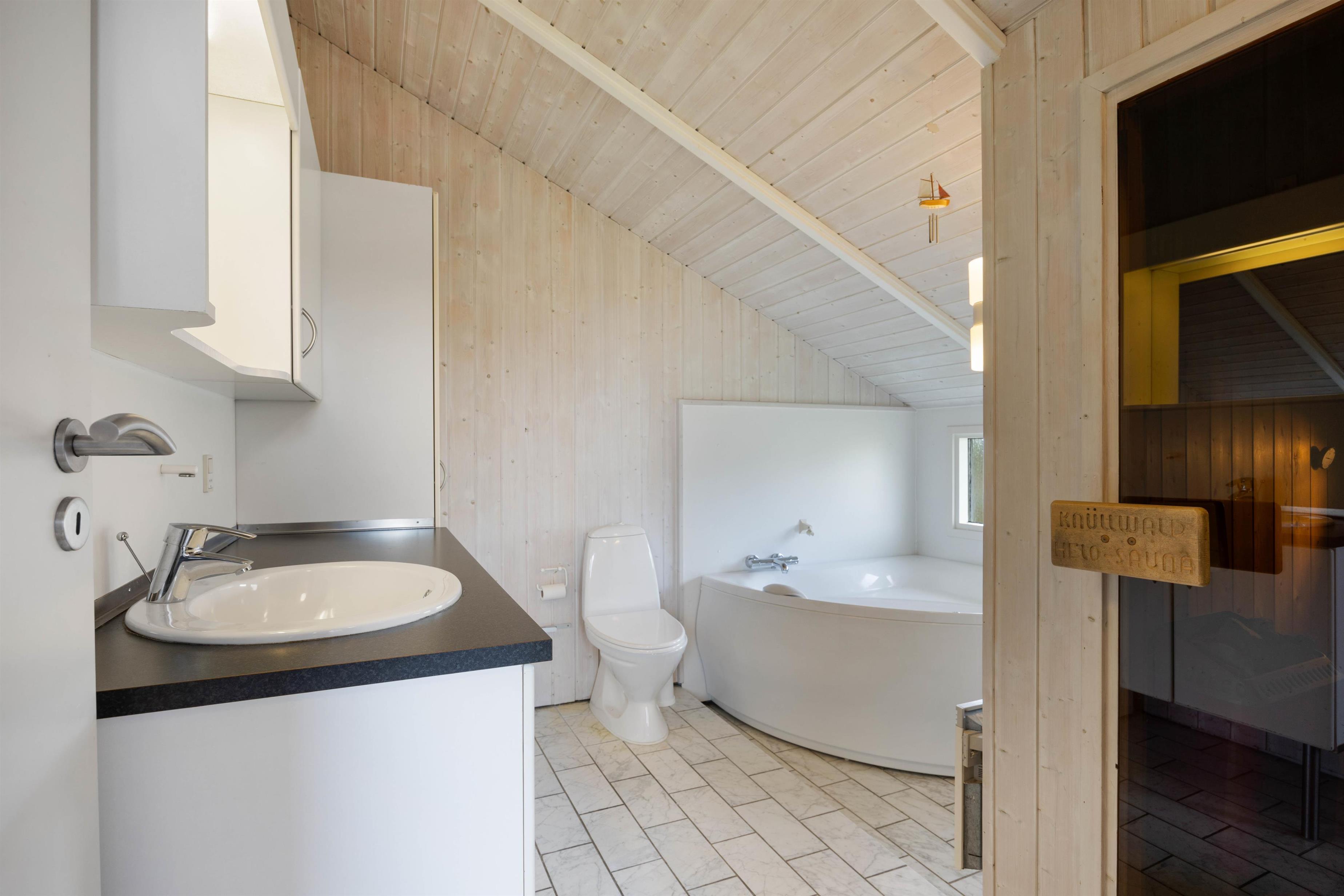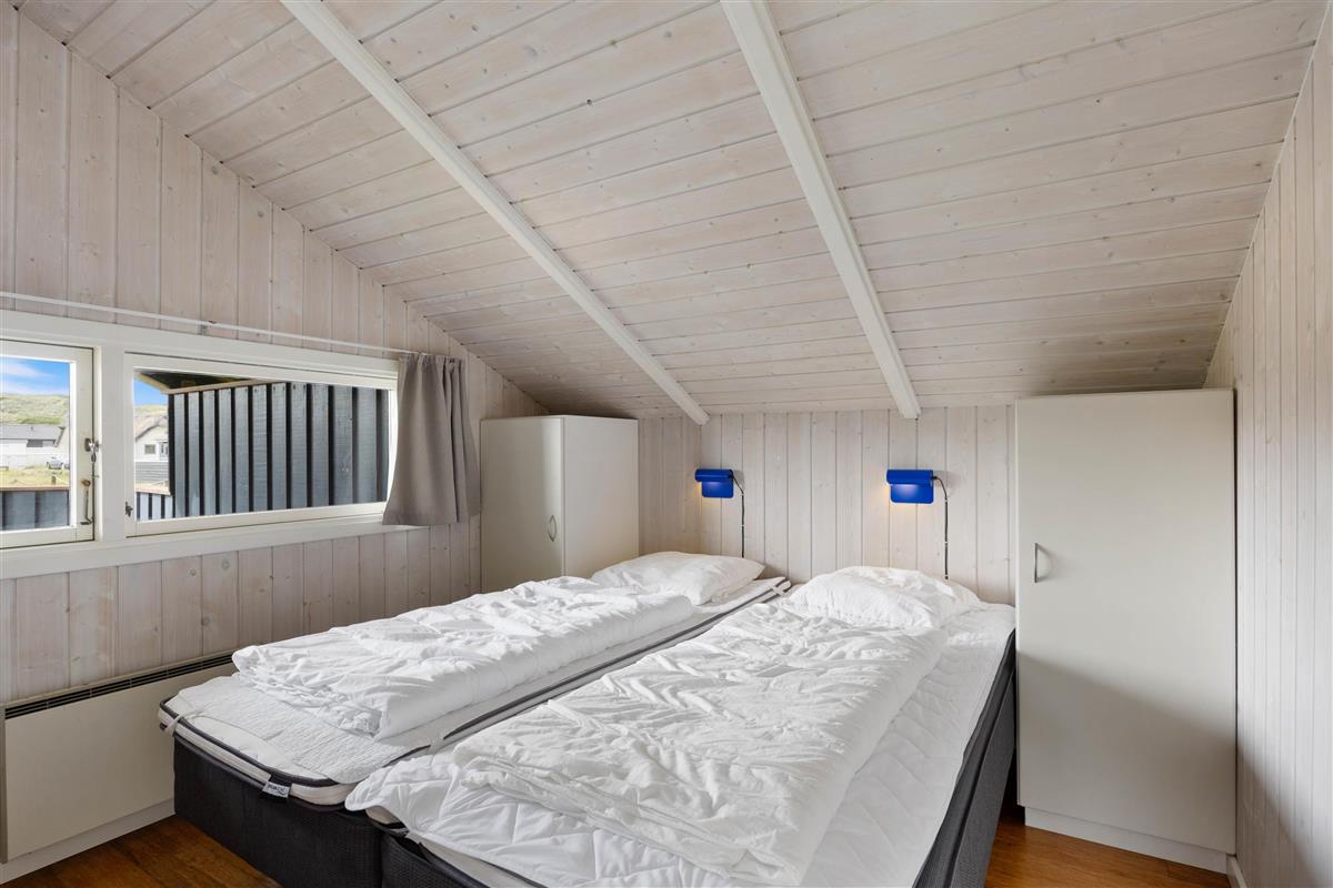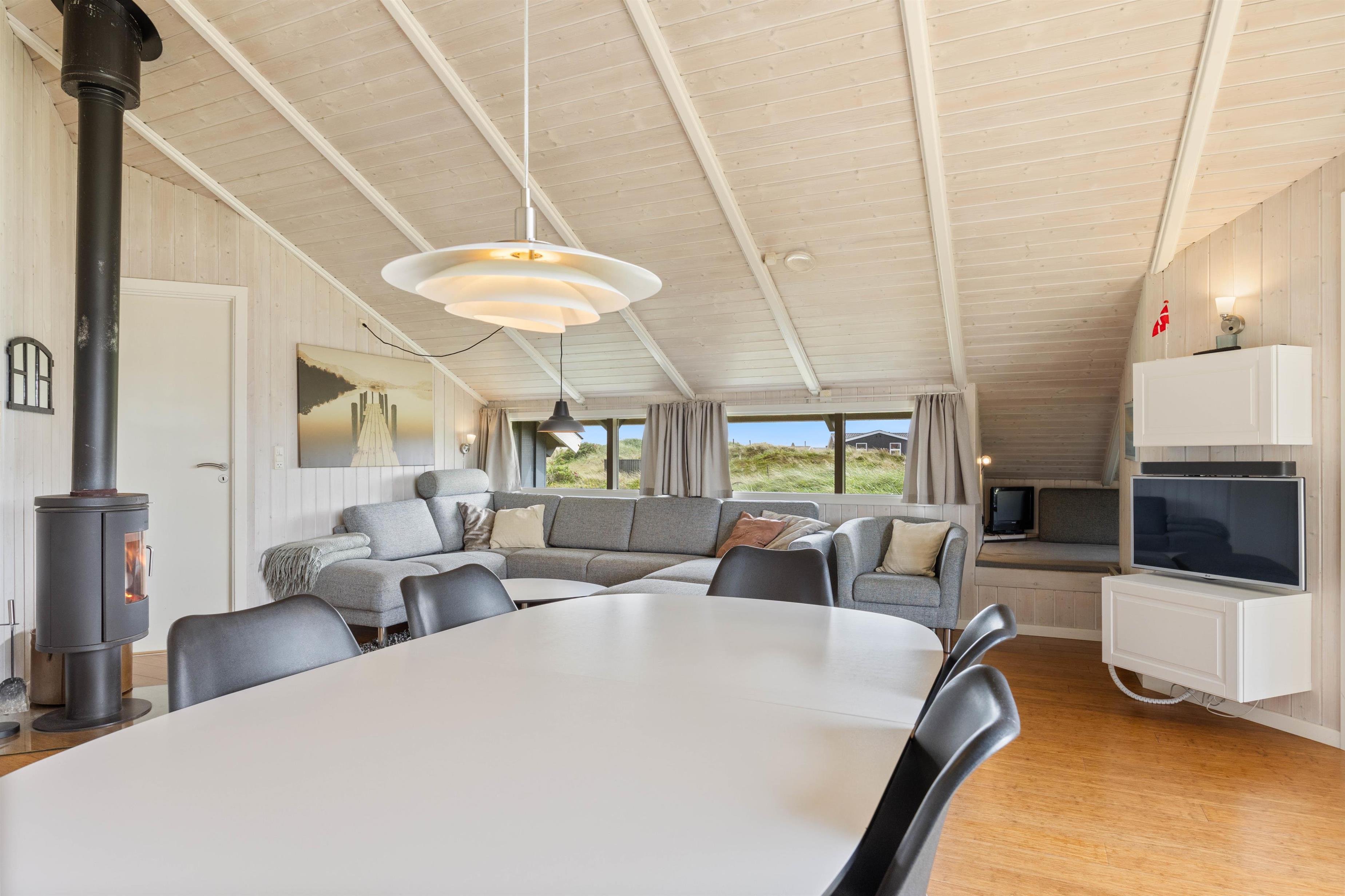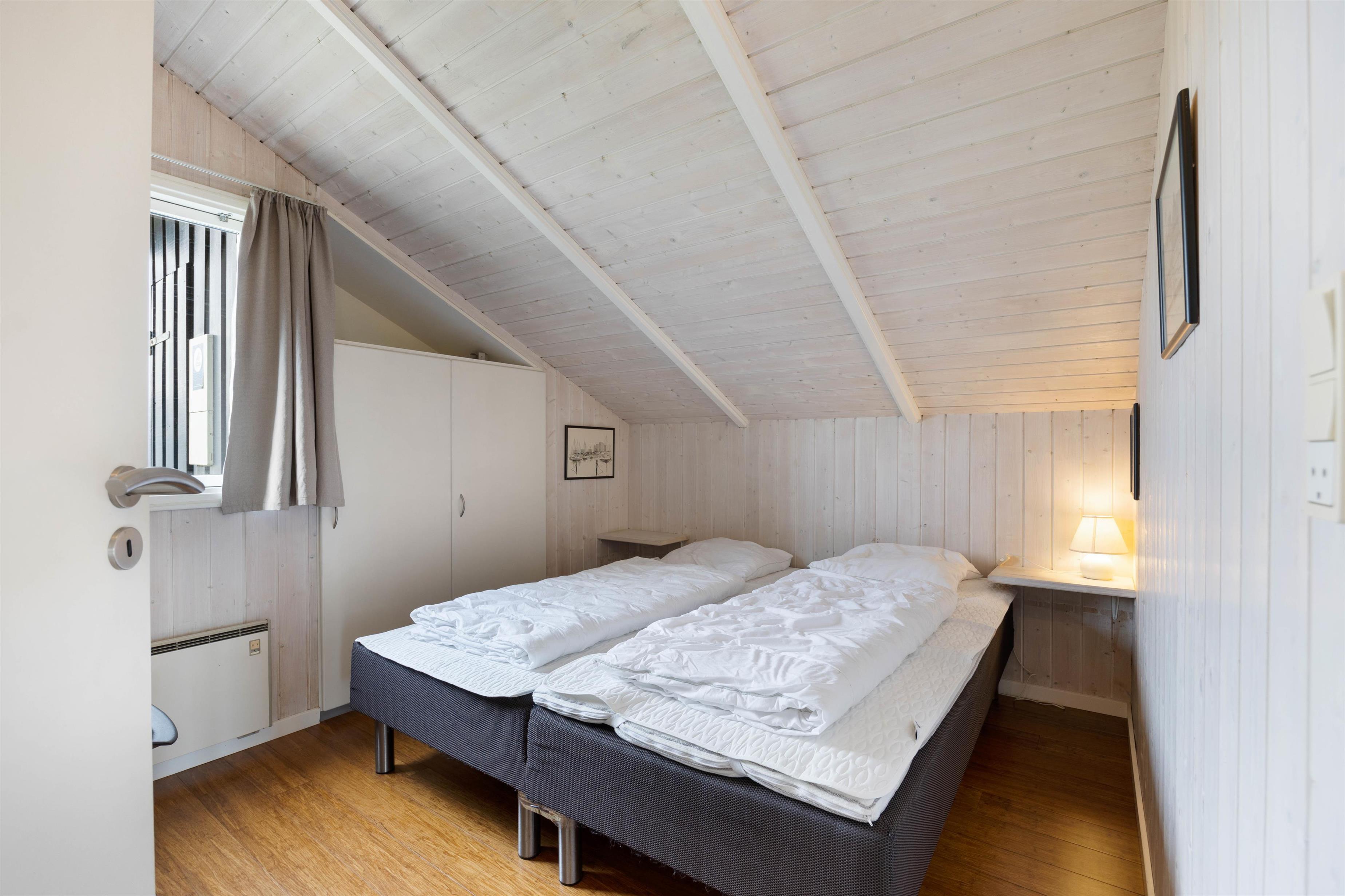 The heart of the holiday home is the living area, decorated in typical Danish style with beautiful wooden floors and bright, sloping ceilings. Numerous windows flood the space with natural light, and you can make yourself comfortable either on the sofa or at the dining table. The open-plan, well-equipped kitchen invites you to prepare delicious meals, while the dishwasher takes care of the cleaning up afterwards.