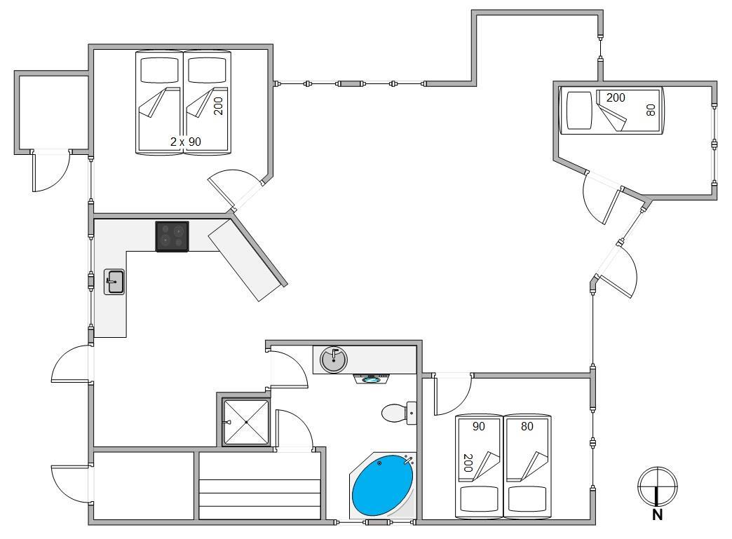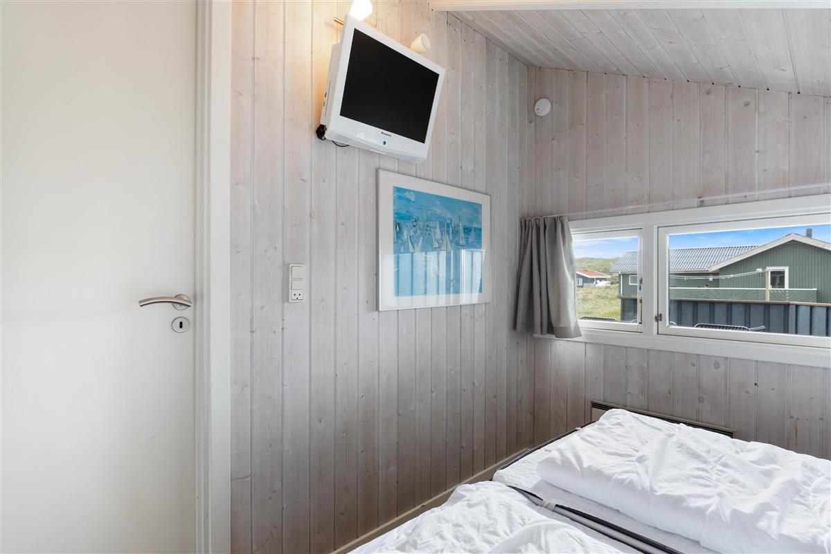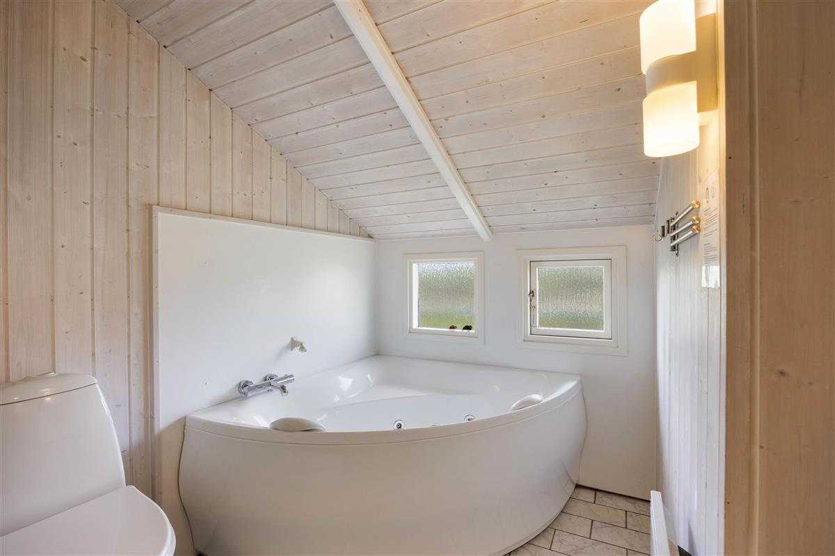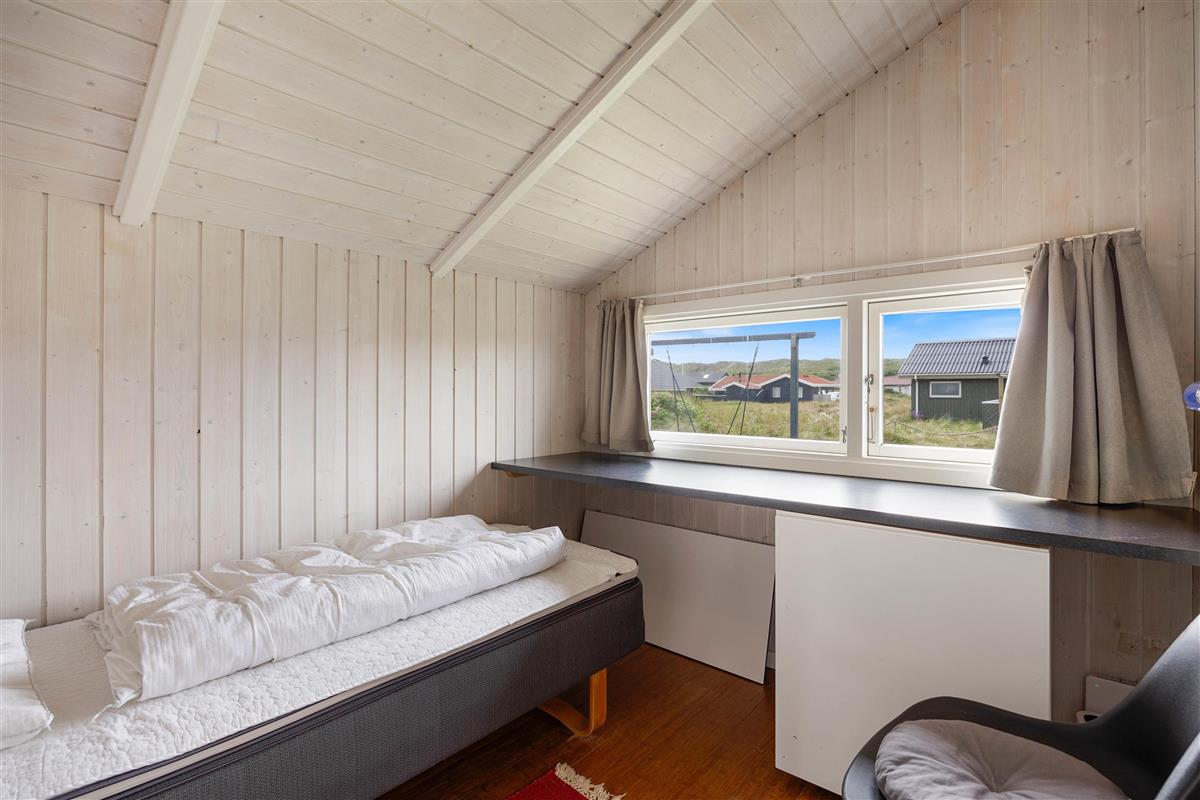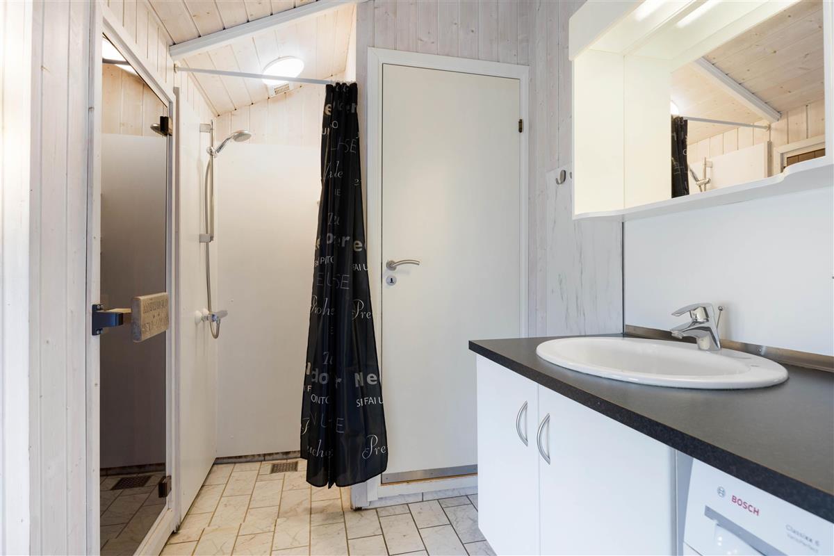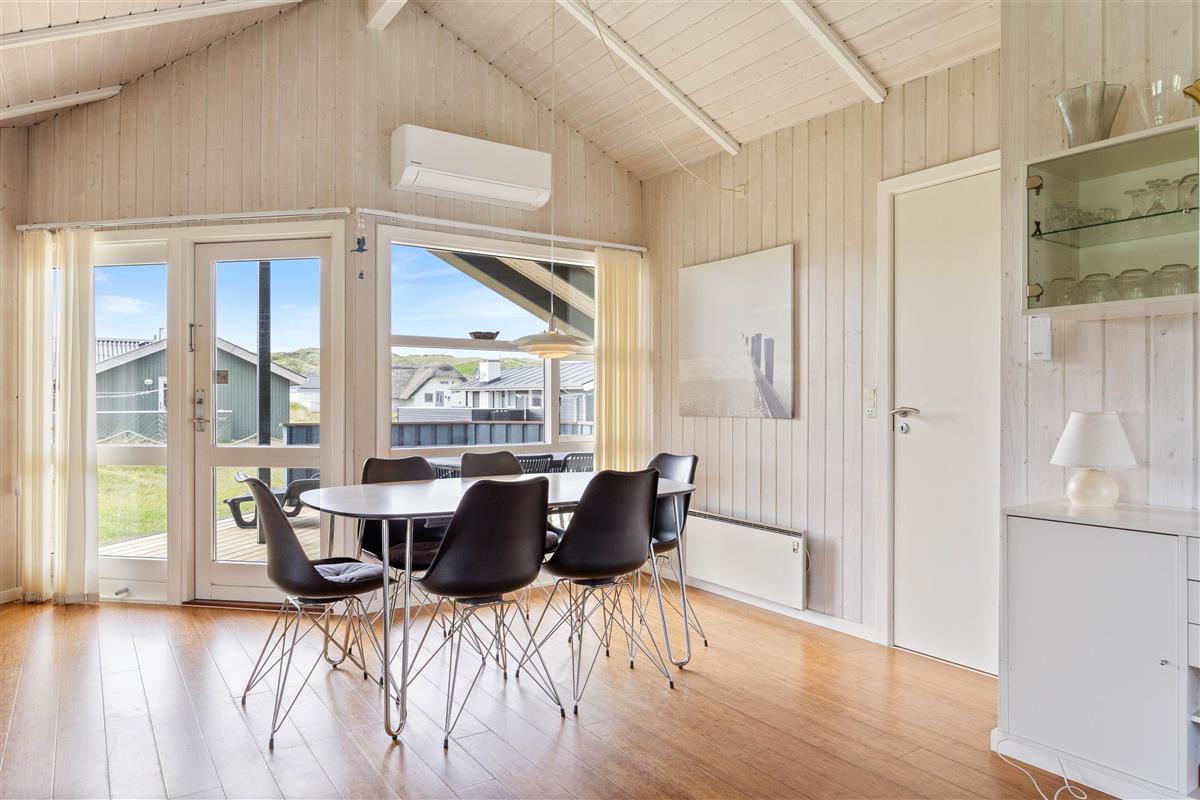 The heart of the holiday home is the living area, decorated in typical Danish style with beautiful wooden floors and bright, sloping ceilings. Numerous windows flood the space with natural light, and you can make yourself comfortable either on the sofa or at the dining table. The open-plan, well-equipped kitchen invites you to prepare delicious meals, while the dishwasher takes care of the cleaning up afterwards.
