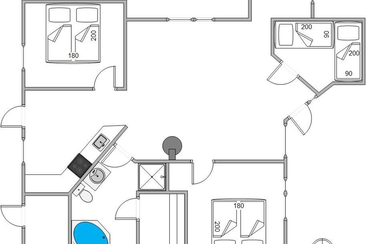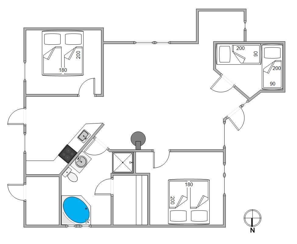 The bathroom houses the holiday home's wellness area. After a long beach walk, enjoy the warmth of the sauna or take a relaxing soak in the whirlpool. The practical layout of the three bedrooms and their well-distributed positioning allows everyone to find their own space. There are two bedrooms with comfortable double beds and one bedroom with two single beds.