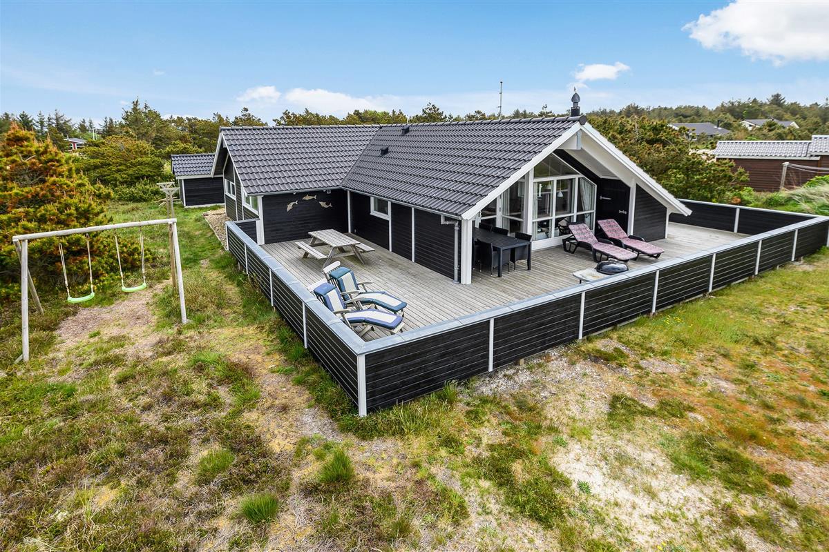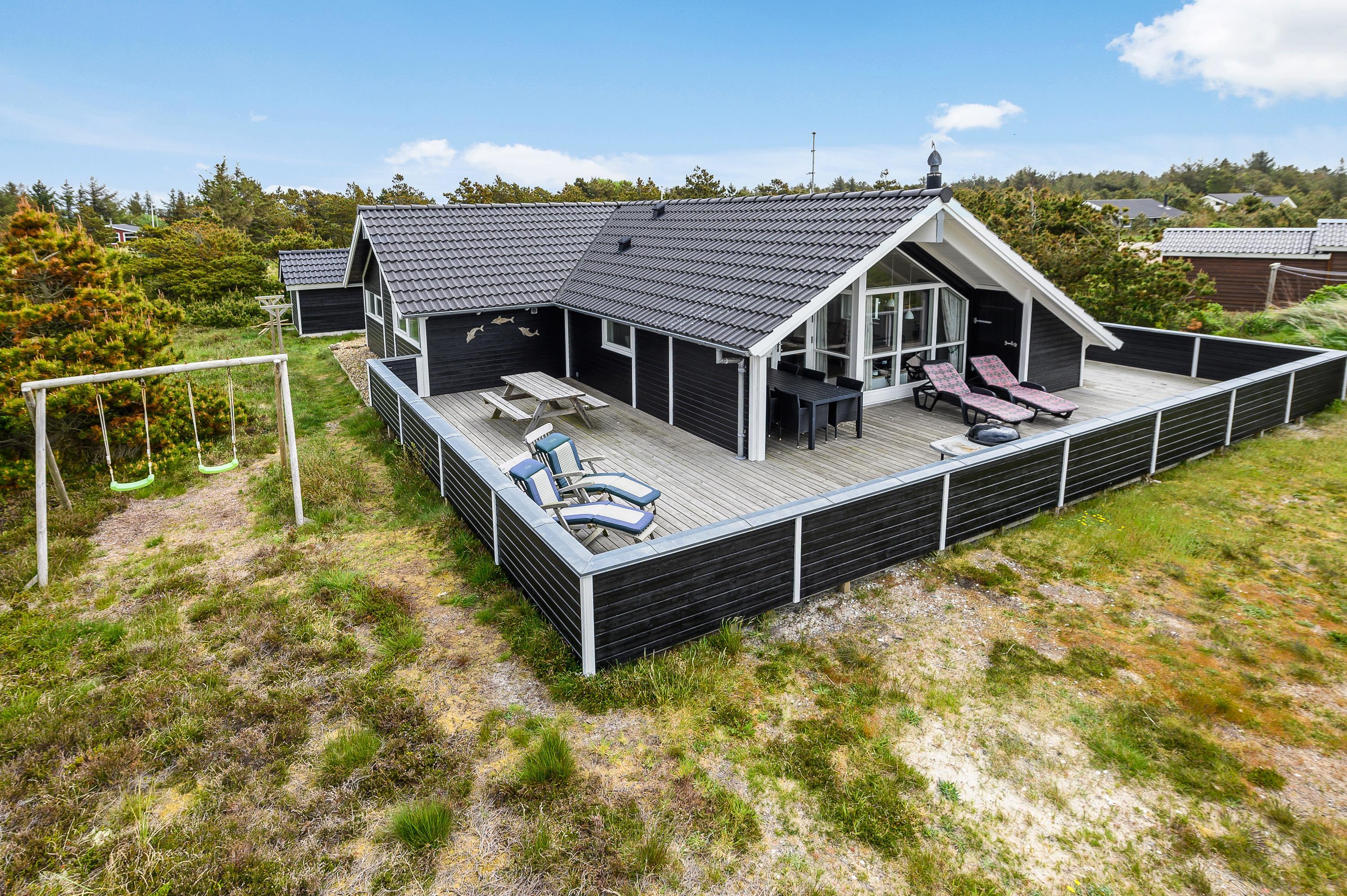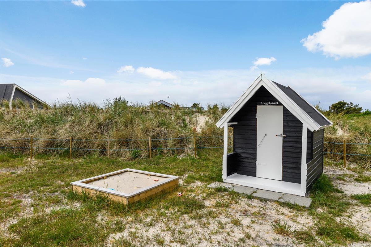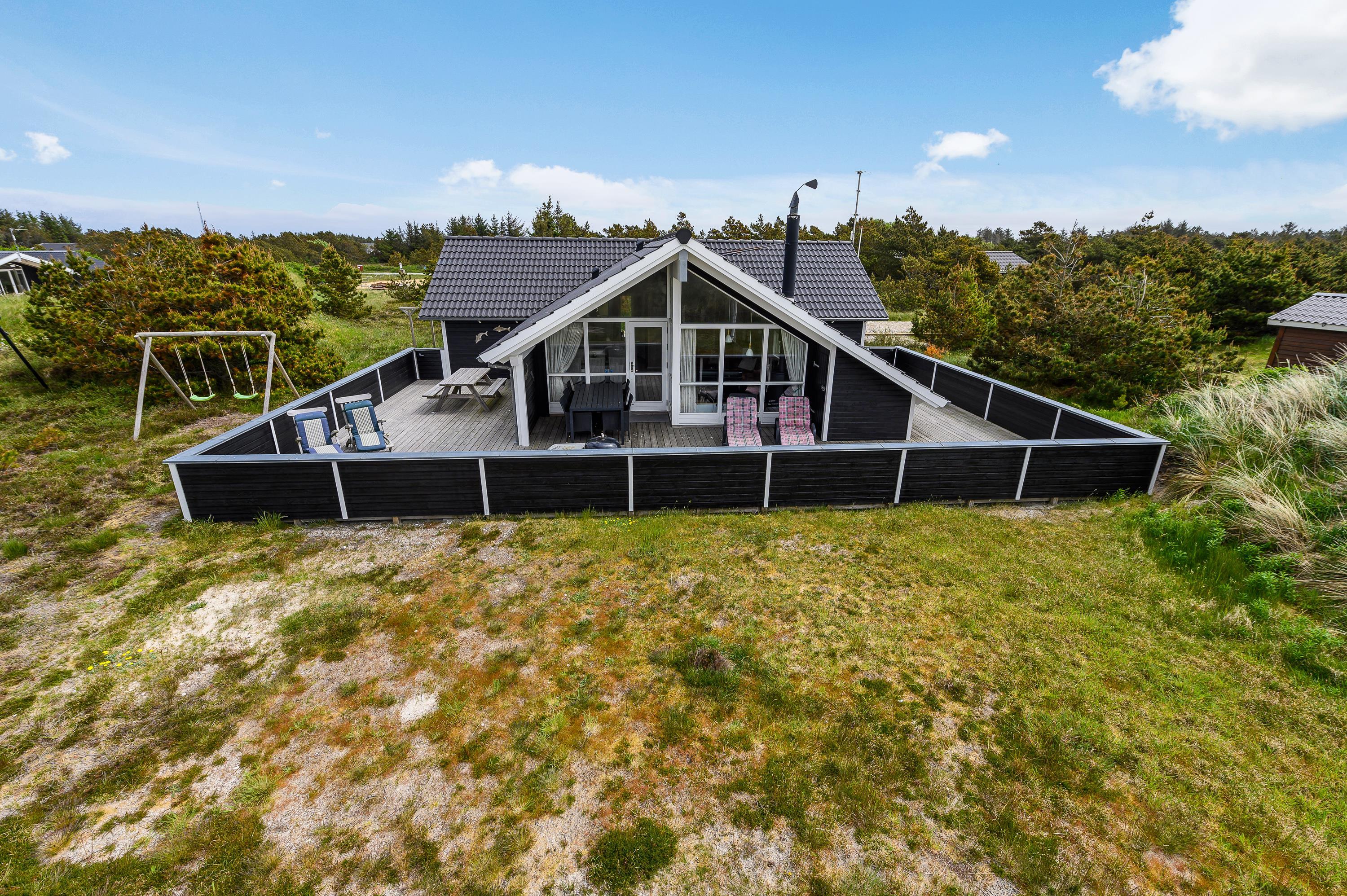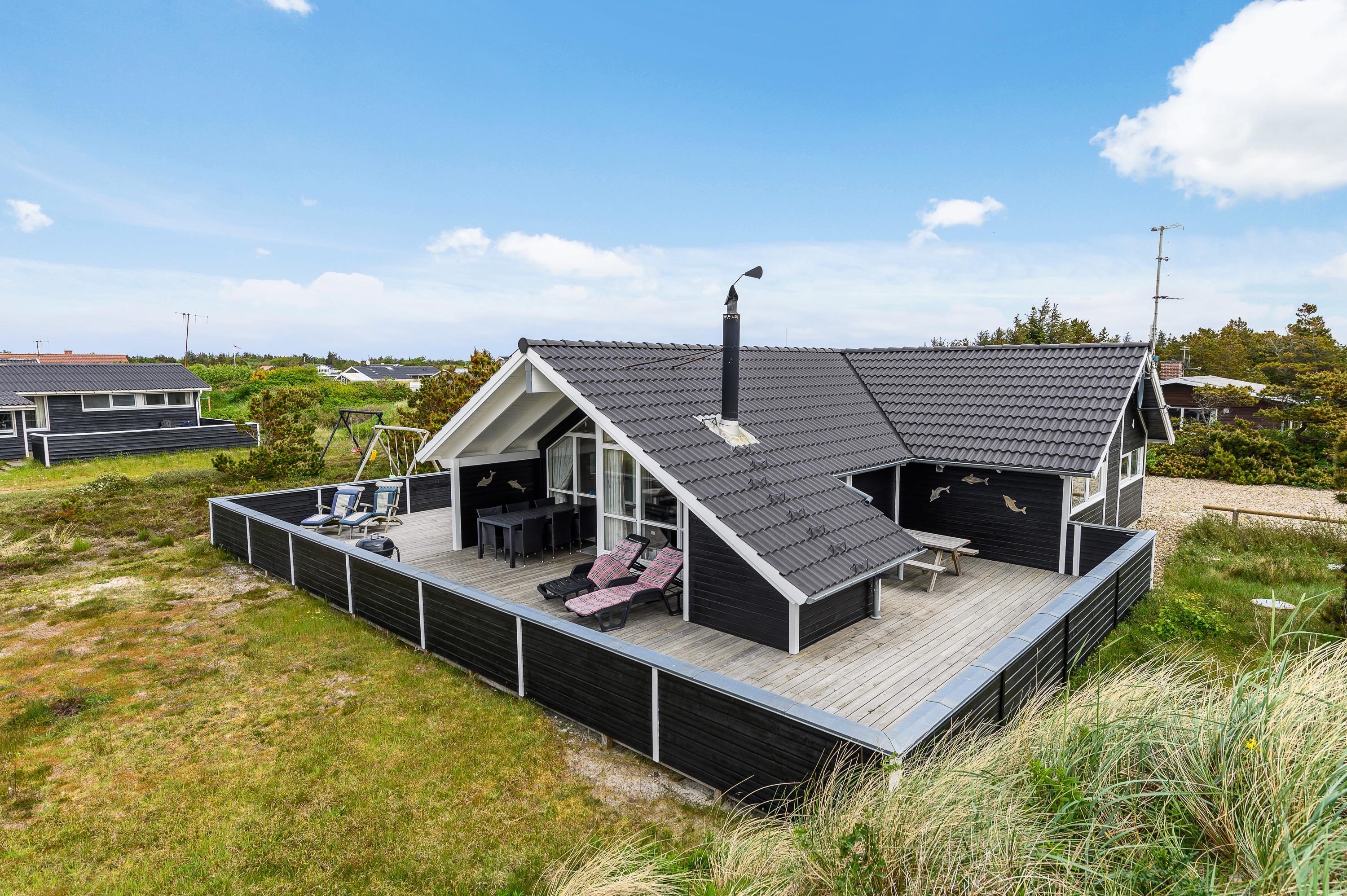 The house features two terraces made from premium wood. The large, sheltered east-facing terrace is perfect for enjoying the morning sun. The vast, fully enclosed terrace is ideal for families with dogs or young children. You'll always find a wind-protected spot to enjoy the sunshine on the sun lounger. The house has its own driveway and is perfectly positioned in the second row, with additional protection from a vegetation-covered dune. For younger guests, there's a lovely playhouse, sandpit, and swings.
