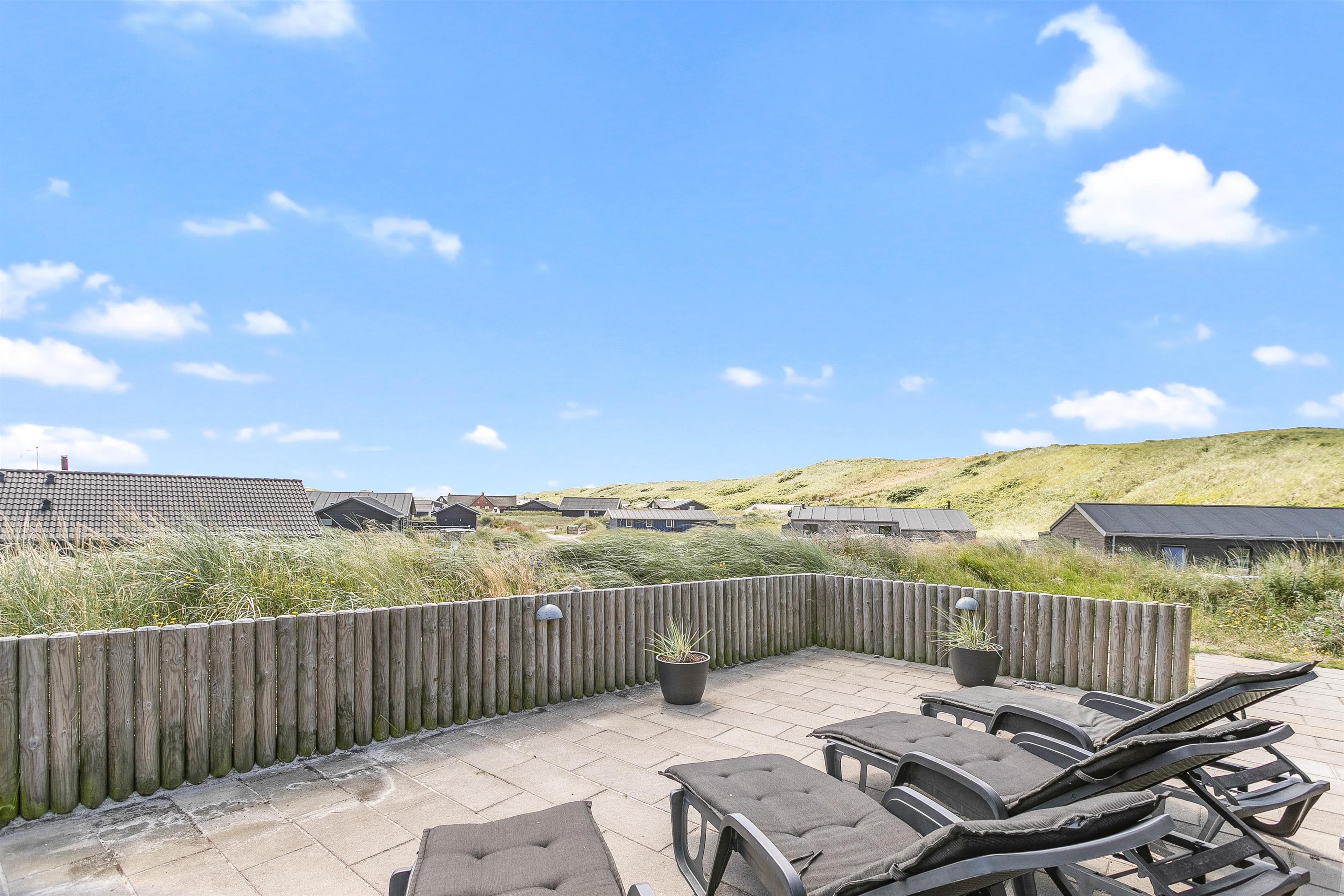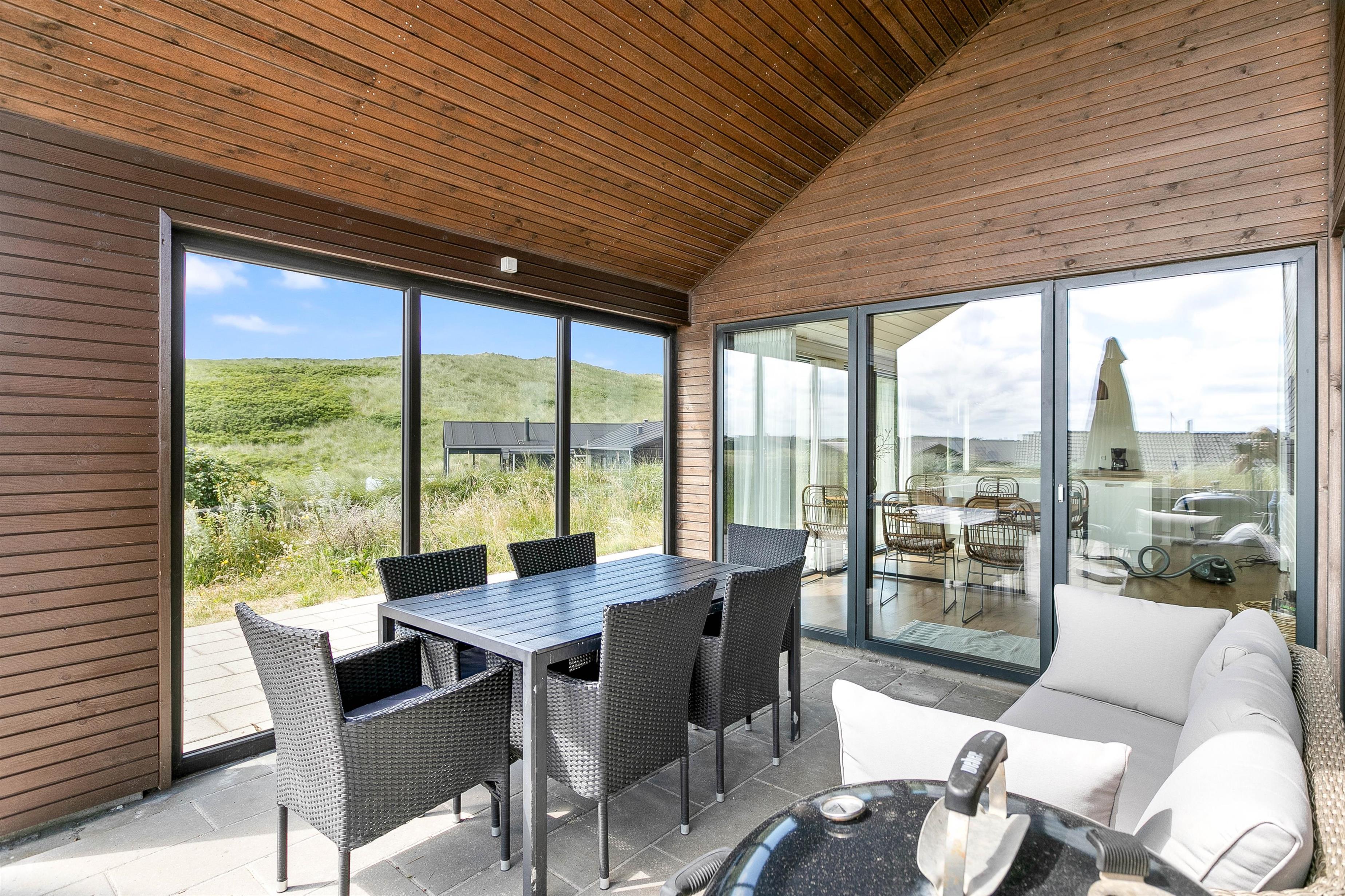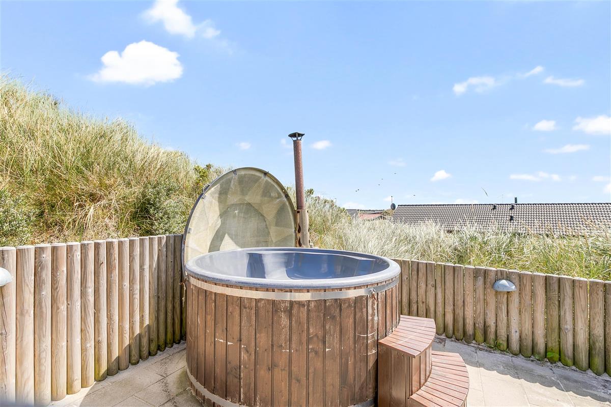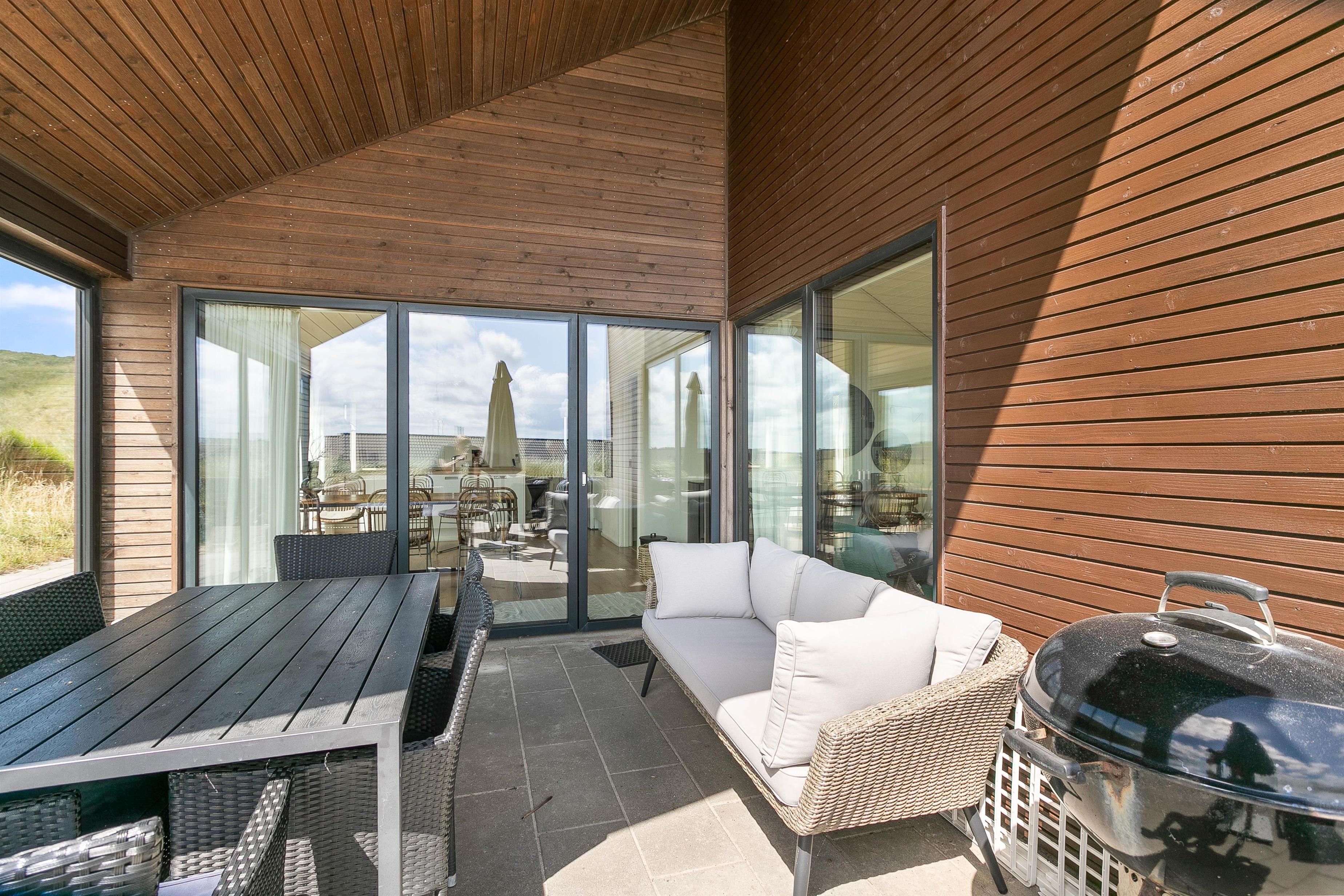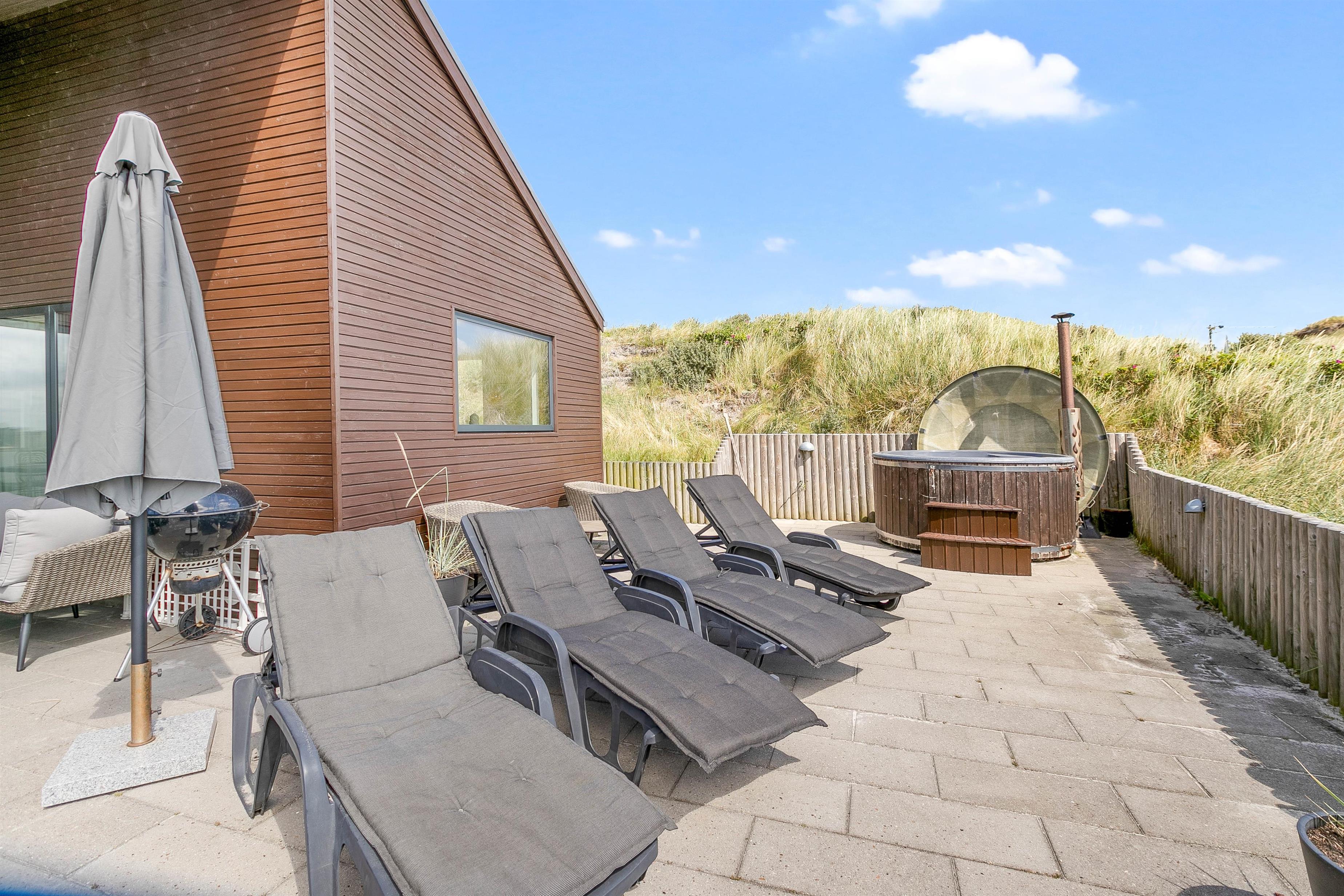 The terrace is an experience in itself - thoughtfully designed with beautiful natural borders providing wind protection, a fantastic Nordic hot tub and lounge furniture where you can completely relax. Large glass panels shelter the covered terrace from the westerly winds, extending the outdoor season here on the outer dune ridge, where you can always hear the waves and taste the salt in the air.