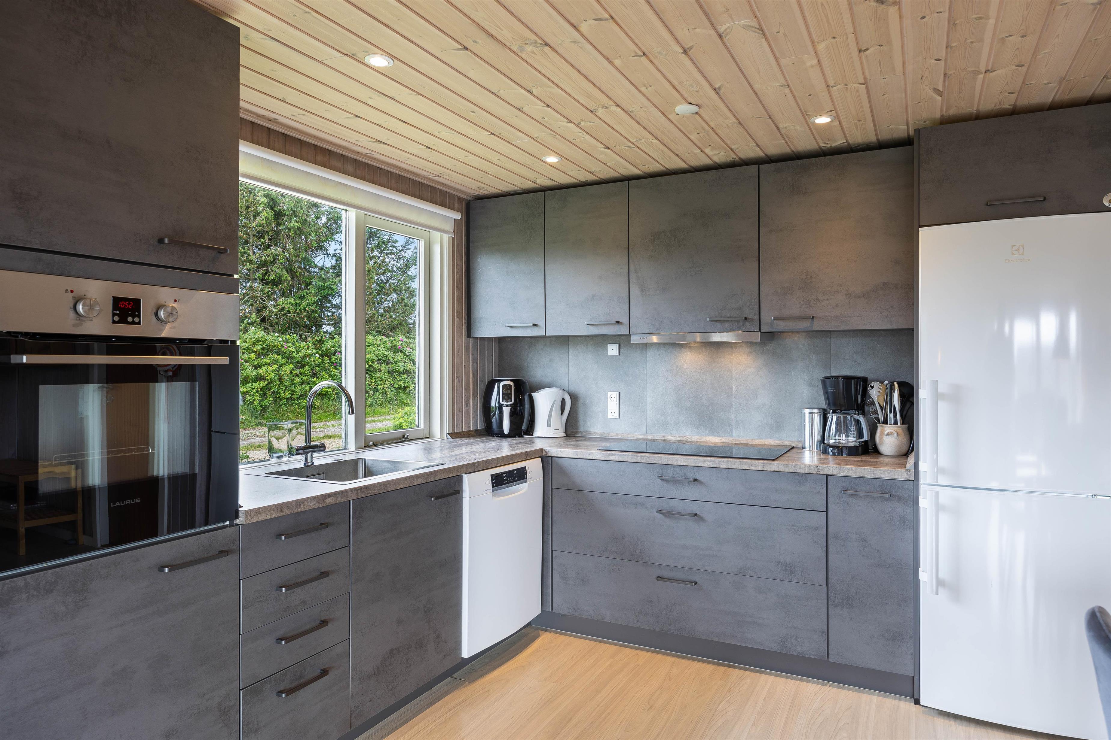 This holiday home features classic, practical amenities. The living room with its integrated kitchen and dining area forms the heart of the house. Here, everyone gathers to cook together, chat, or relax comfortably on the sofa.
