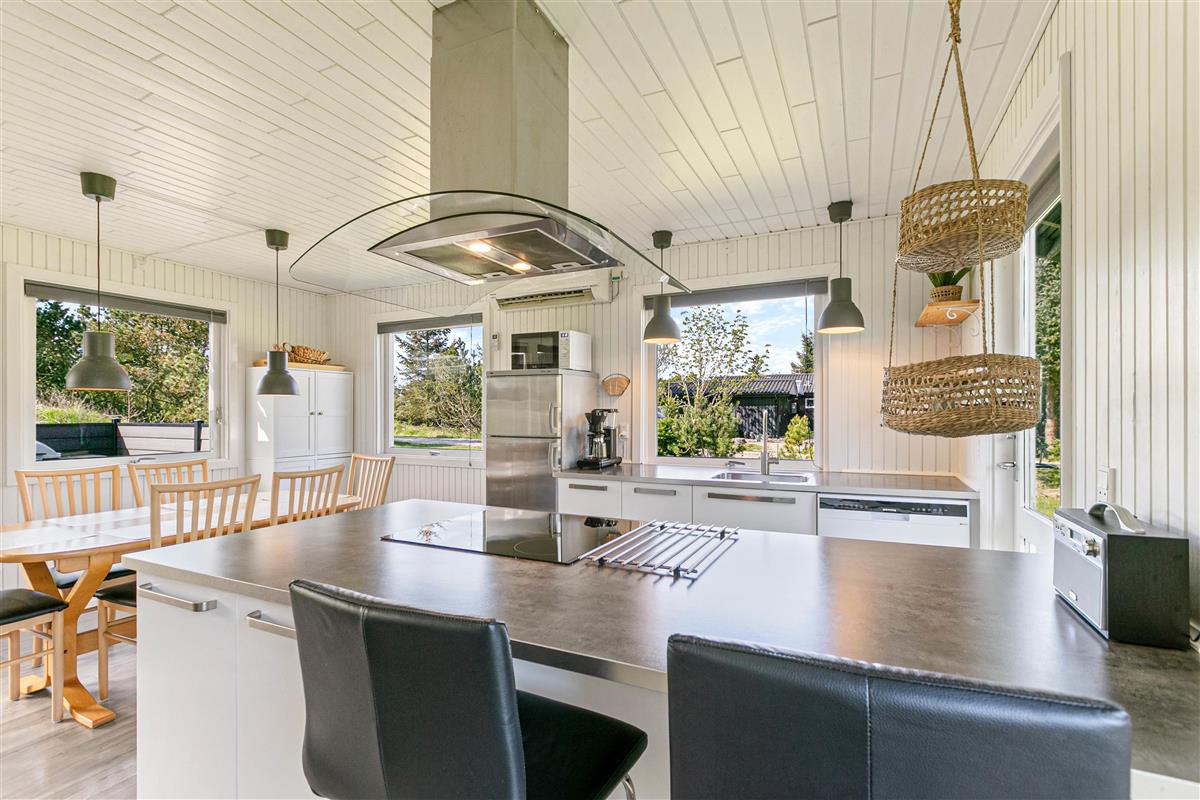 Thanks to numerous windows, the living room is bright and welcoming with plenty of natural light. Here you can relax on the sofa, watch television, and listen to the crackling of the wood-burning stove. An energy-efficient heat pump provides additional heating. The modern kitchen features a cooking island and, naturally, includes a dishwasher.