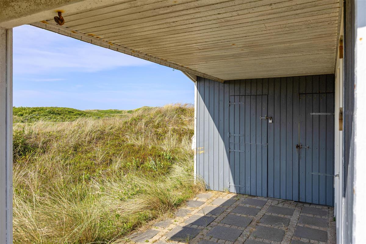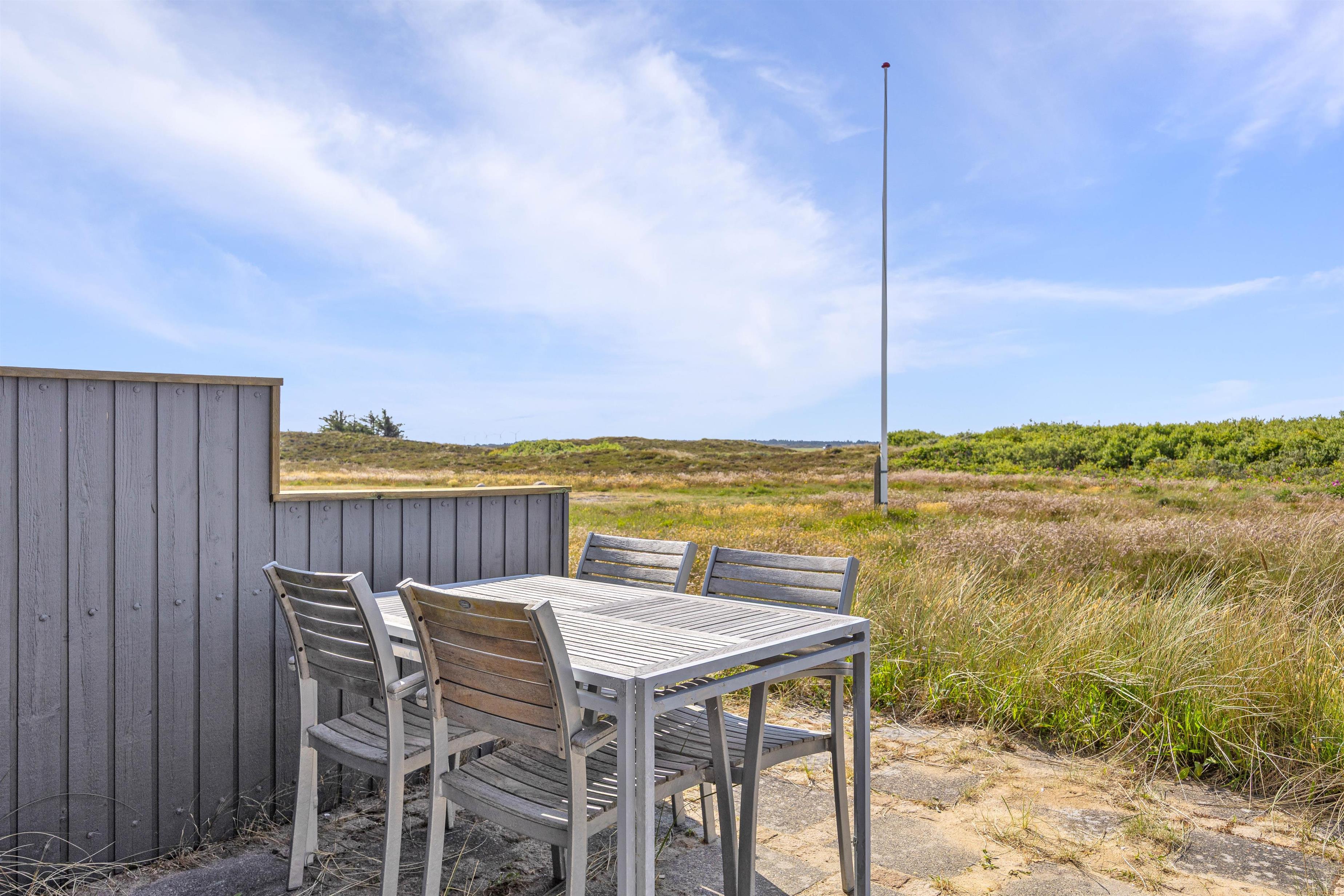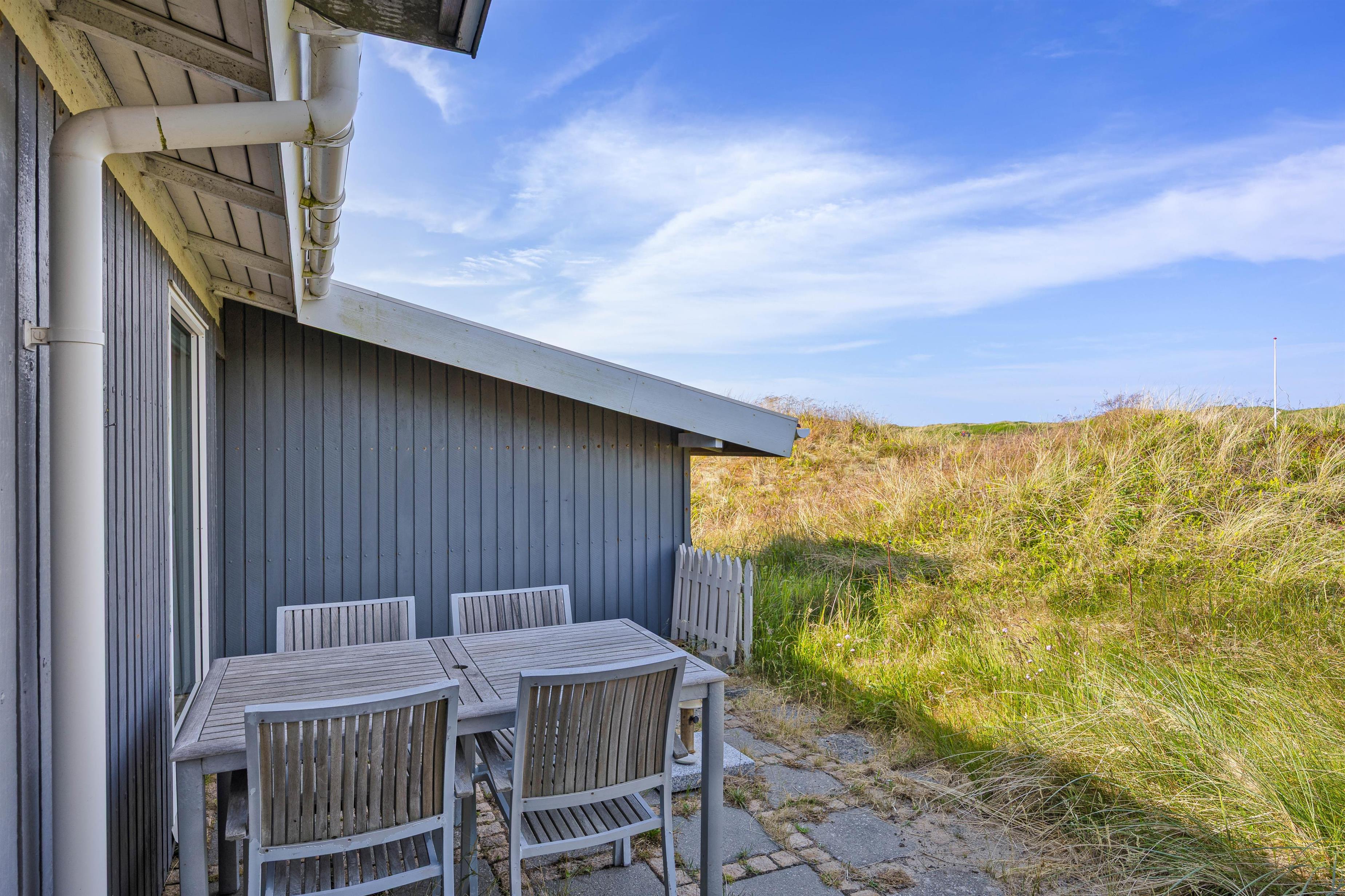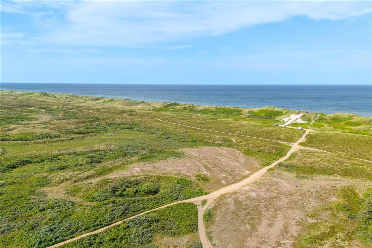 There is both a covered and a shielded part of the terrace where you can find shelter and enjoy a cup of coffee or a meal. The surrounding grounds are approximately 1,270 m², and there is the opportunity to barbecue on summer evenings, weather permitting. The view is characterised by the surrounding natural grounds and dune landscape.
