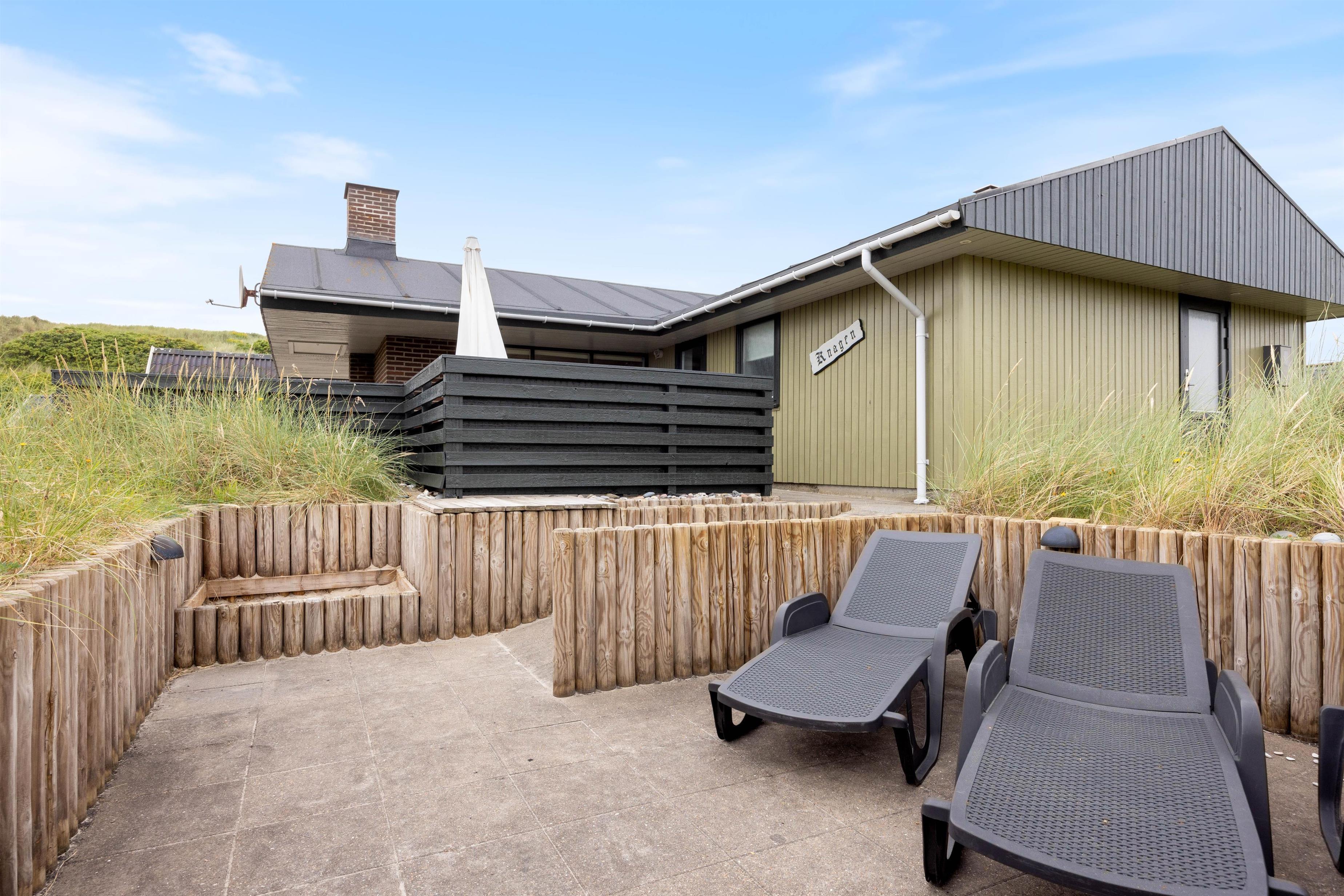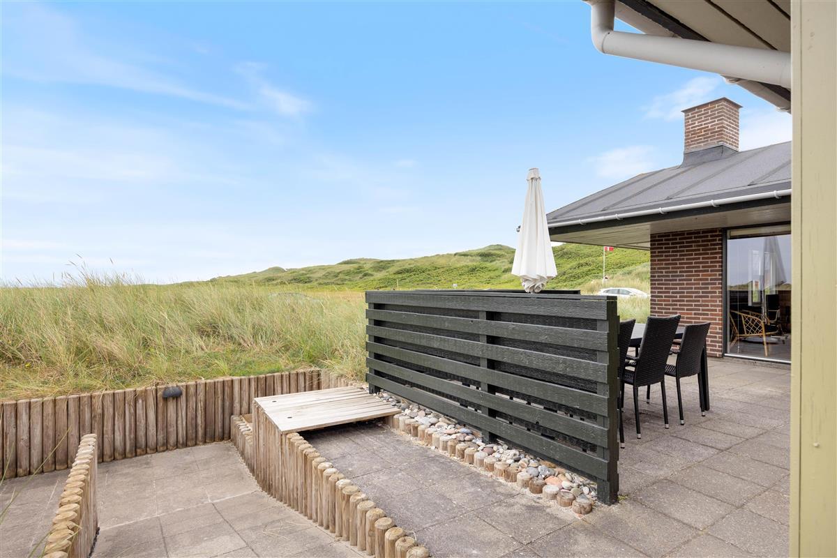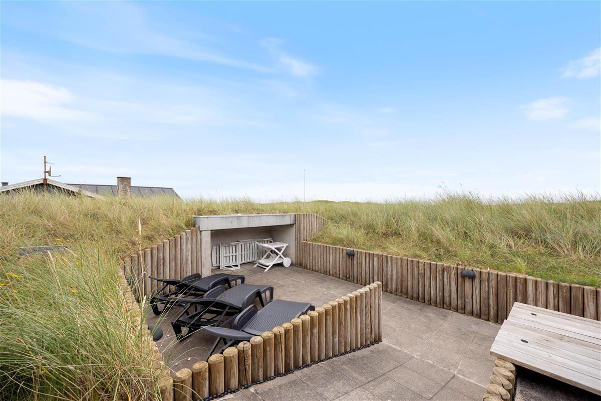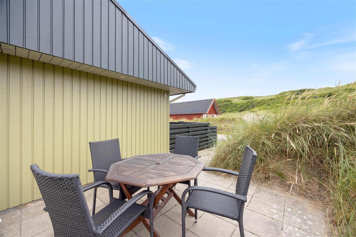 The terraces around the holiday home at Kirstinevej 110 offer relaxation opportunities in the fresh sea air. Depending on the weather, you can use either the sheltered terrace, which blends charmingly into the surrounding dunes, or the covered area connected to the house. You'll always have a choice between a protected corner or full sunshine, whatever suits you best.